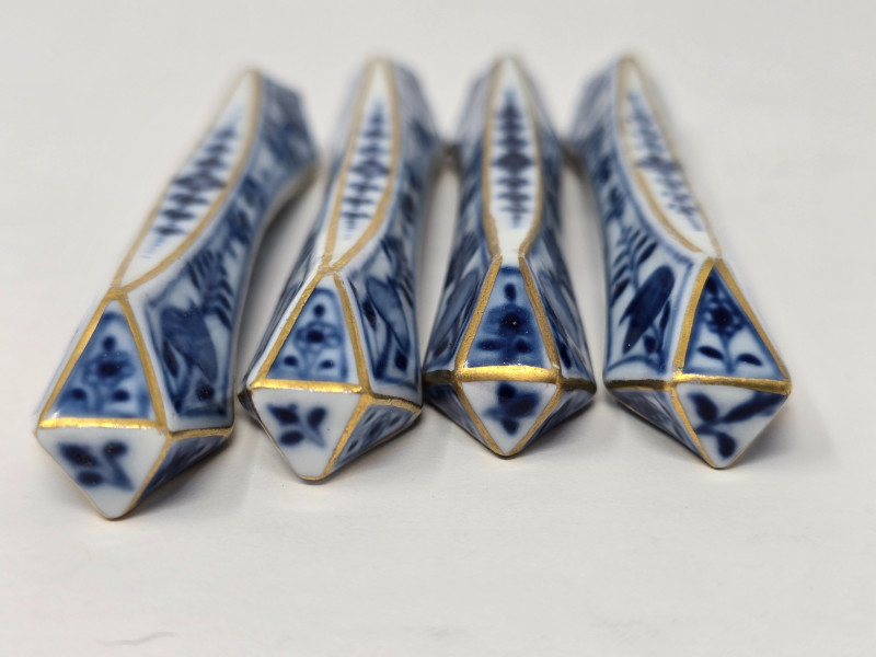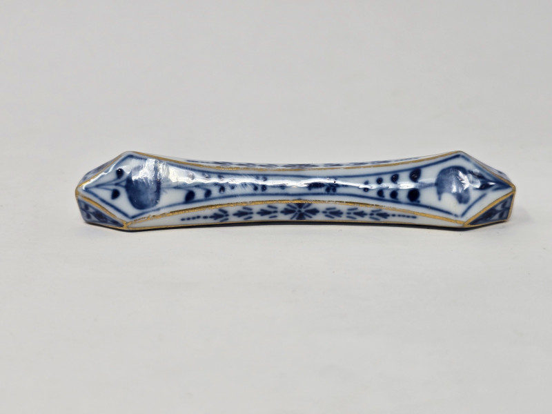 Add a touch of sophistication to your table with this set of four Meissen porcelain knife rests, each featuring: Hexagonal prism shape with a gentle curve for balanced support Traditional blue floral and botanical motifs on a crisp white porcelain base Hand-applied gold trim along the edges, enhancing their decorative appeal Details Maker: Meissen Origin: Germany Material: Porcelain Design: Blue floral on white with gold trim Condition: Excellent; no chips, cracks, or repairs. Gold trim intact with minimal wear. Dimensions: Approx. 2.5" long each Display & Use