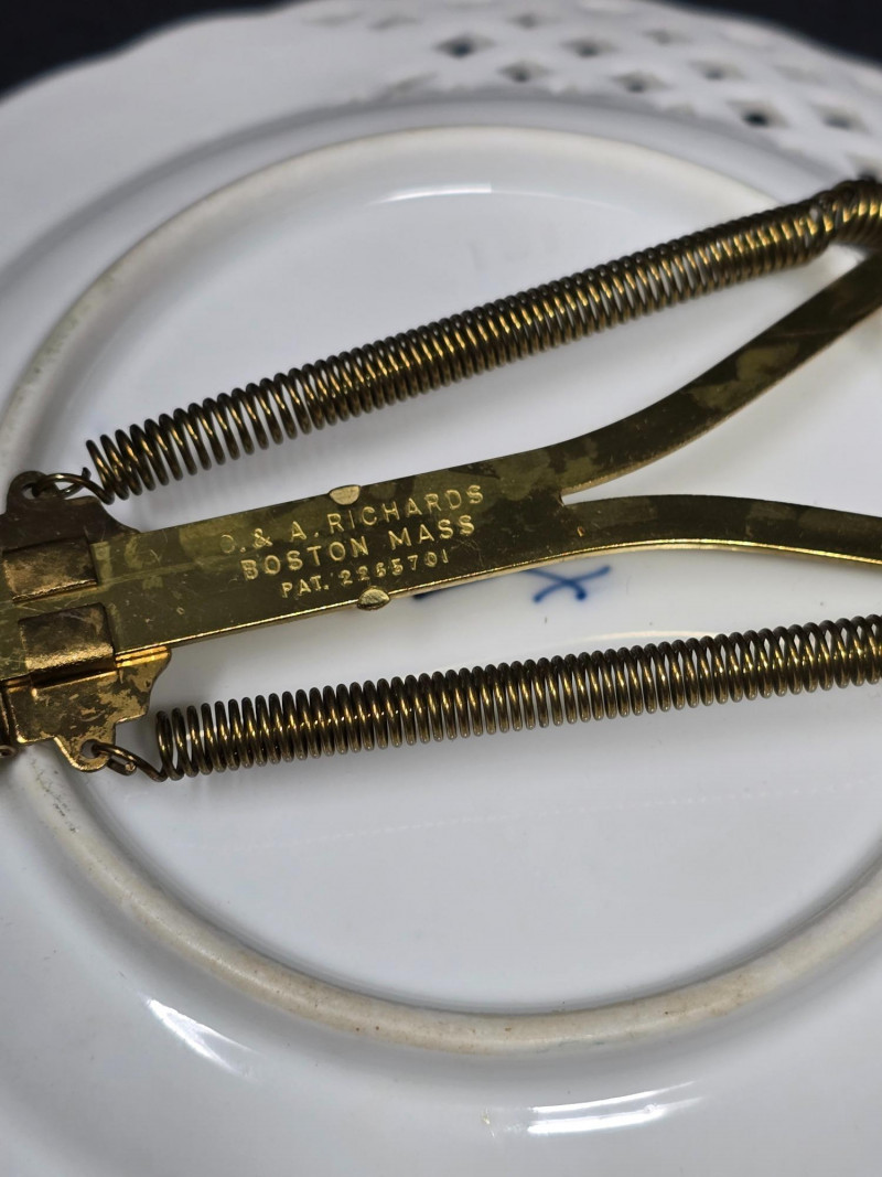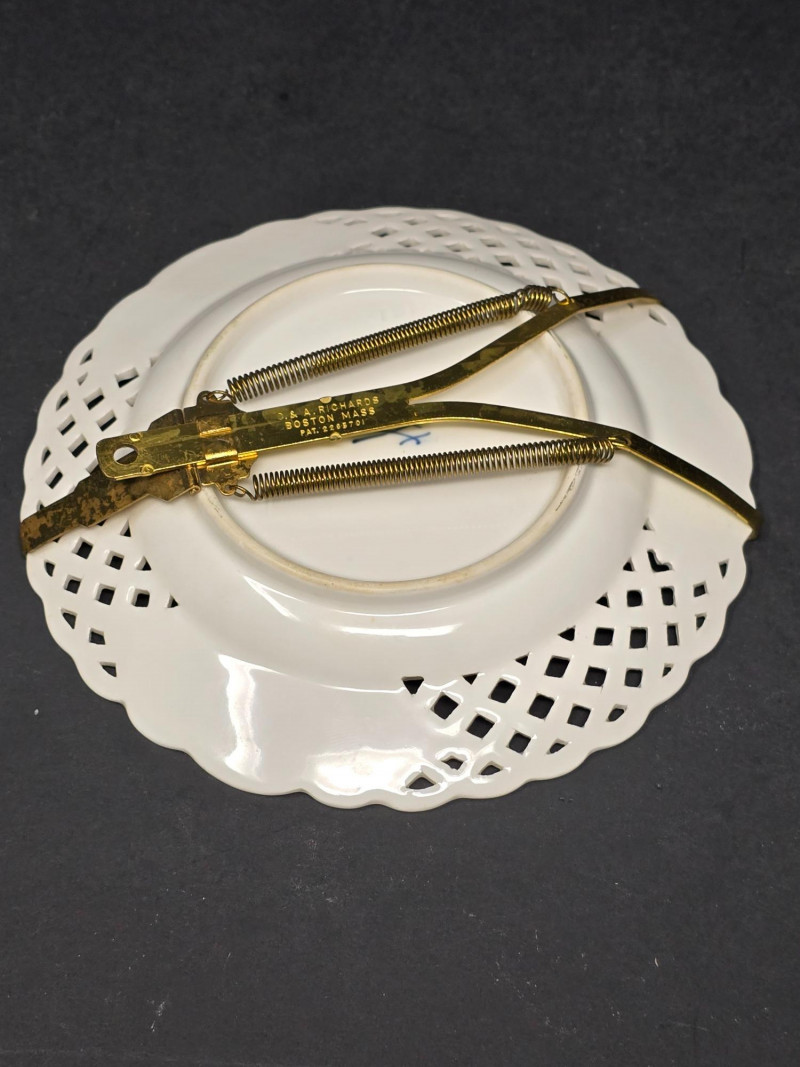Offered is a finely crafted Meissen porcelain plate in the classic Blue Onion (Zwiebelmuster) pattern, featuring cobalt blue floral and botanical motifs on a white ground. The central design includes stylized peonies, asters, and delicate foliage, framed by a pierced reticulated border with four floral cartouches. This plate exemplifies Meissen’s renowned hand-painted artistry and ornamental precision, ideal for cabinet or wall display. Maker: Meissen, Germany Pattern: Blue Onion (Zwiebelmuster) Diameter: approx. 9.5 inches Markings: Underglaze blue crossed swords mark on reverse, with straight hilts and no additional symbols, consistent with pre-WWII production between 1890 and 1930 Design Features: Central floral motif with stylized blooms and vines Reticulated rim with lattice openwork and floral accents Glazed white porcelain with rich cobalt blue decoration Condition: Excellent; no chips, cracks, or repairs. Minor surface wear consistent with age Display: Includes gold-tone mounting clips About the Mark: The crossed swords emblem is Meissen’s iconic trademark, introduced in the 18th century and used continuously with subtle variations. The version on this plate—straight swords without dots, stars, or other additions—indicates authentic Meissen manufacture prior to World War II, under the Royal Porcelain Manufactory. This plate reflects the enduring appeal of Meissen’s historic design legacy, combining ornamental elegance with precise hand-painted detail. A distinguished addition to any collection of fine European ceramics.