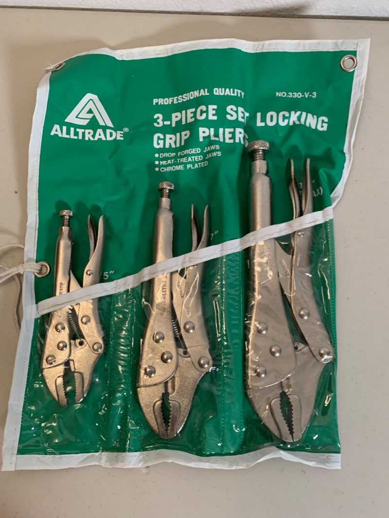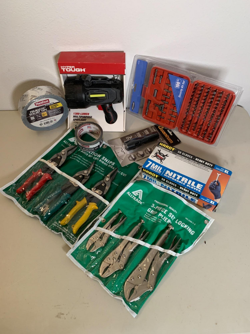 A practical, ready-to-use assortment of tools and accessories ideal for DIY enthusiasts, mechanics, or home improvement professionals. This curated lot includes lighting, gripping, fastening, sealing, and protective gear—all in excellent, unused or lightly handled condition. Included Items: Hyper Tough 1300-Lumen Multipurpose Spotlight – New in sealed packaging; ideal for garage, job site, or emergency use. Quantum LED Flashlight or Tool – Compact, high-output light in original packaging. Alltrade Professional Locking Grip Pliers (2 Sets) – Each set includes 3 pliers with color-coded handles (red, black, yellow, green); heavy-duty construction; sealed packaging. 100 pc Screwdriver Bit Set – Wide variety of bits in red/clear case; unused. Hardy 7 Mil Nitrile Gloves (XL) – Heavy-duty, chemical-resistant gloves; sealed pack. Nashua Foilmastic Sealant Tape – Industrial-grade foil tape roll; unused. Additional Tape Roll – Possibly duct tape; appears unused. Condition Notes: