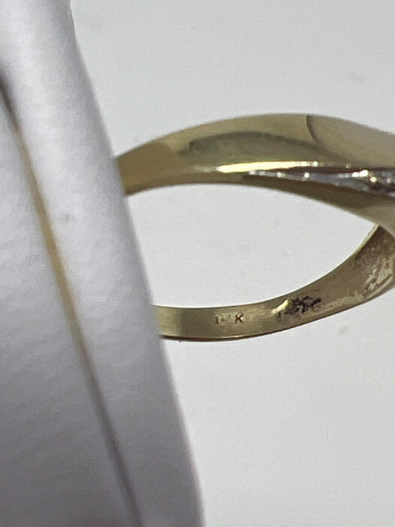 Elegant 14K gold band accented with five small diamonds, offering timeless style and subtle sparkle. Material: Stamped 14K yellow gold. Design: Classic band with five small inset diamonds for understated brilliance. Size: Ring size 5. Utility: Perfect as a wedding band, anniversary ring, or everyday fine jewelry piece. Unverified.