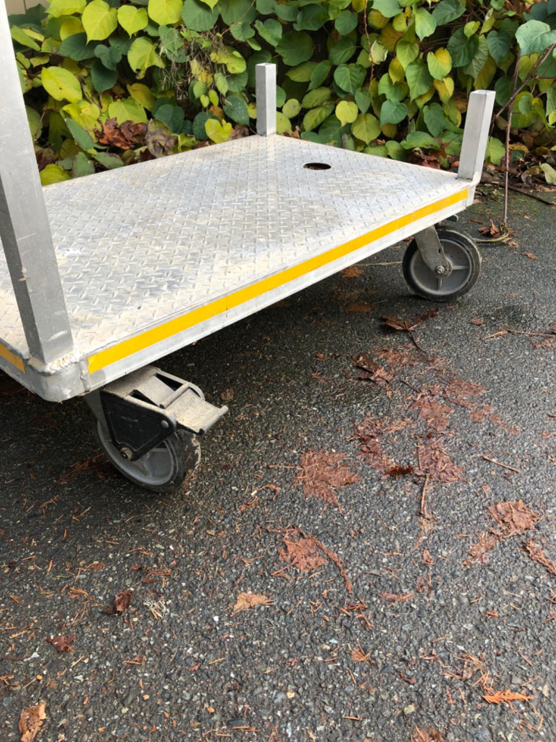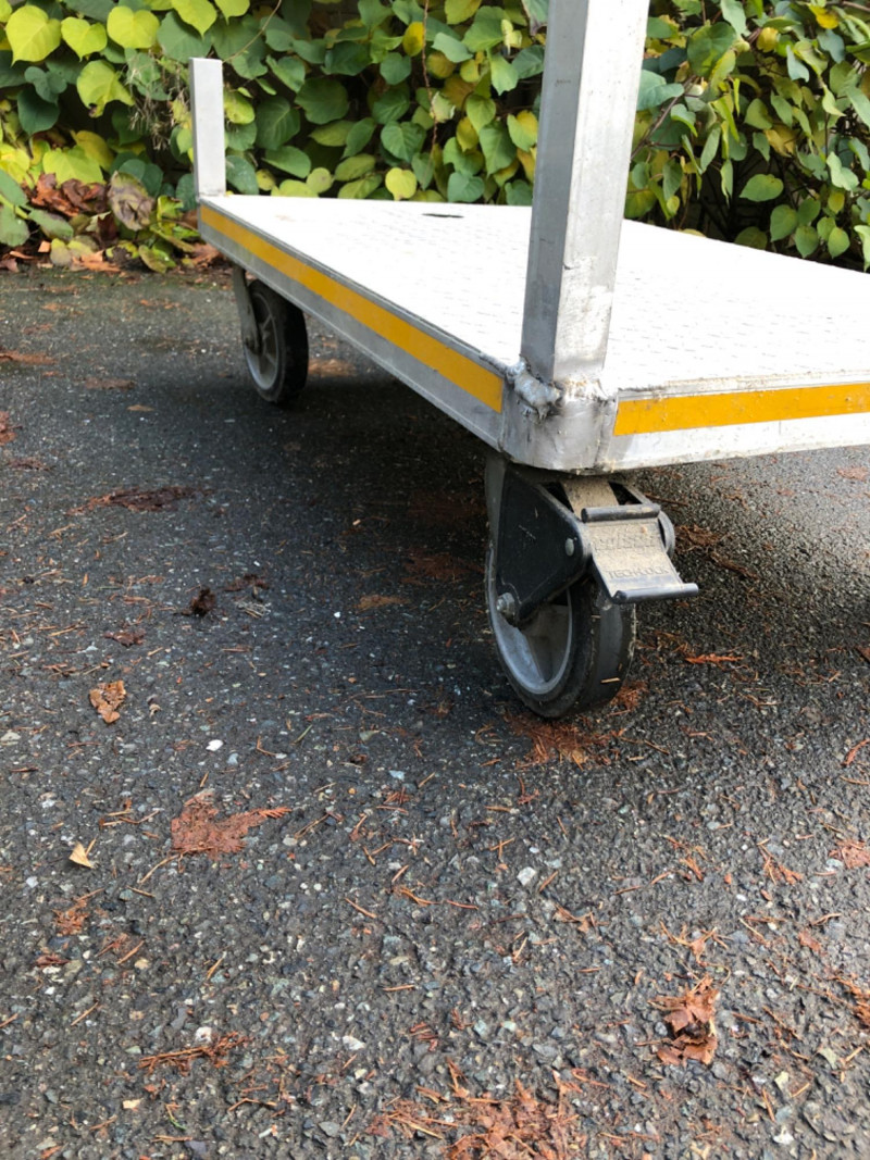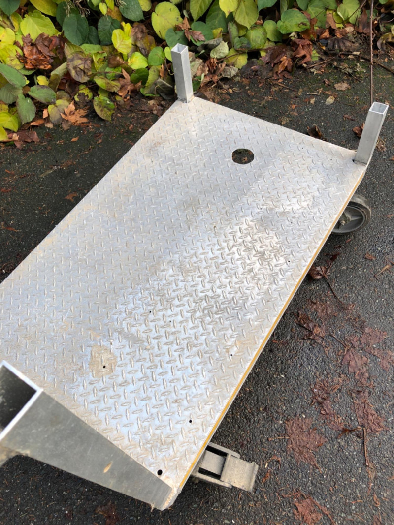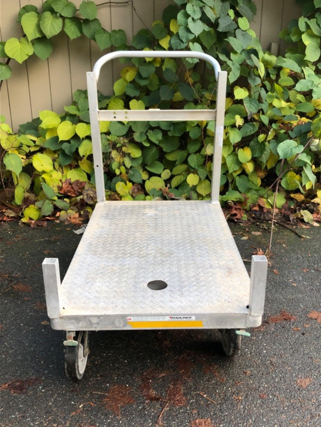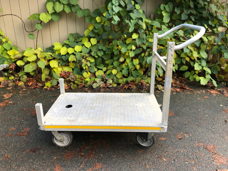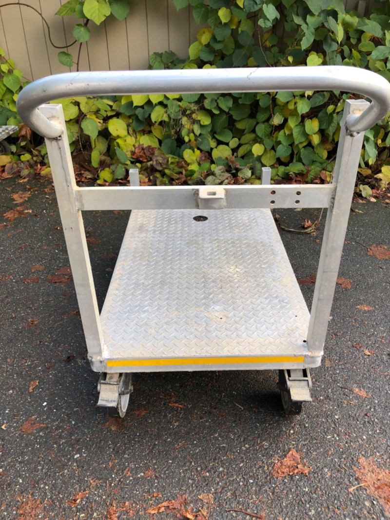 Heavy‑duty aluminum work utility cart, designed for versatile use in shop, warehouse, or contractor settings. Dimensions: Platform measures 48" L x 30" W x 12" H. Design: Sturdy aluminum construction with smooth rolling wheels for easy transport. Handle Feature: Dual‑end handle allows maneuvering from either side of the cart for flexible use. Utility: Ideal for hauling tools, supplies, or heavy equipment across job sites or storage areas. Condition: Solid and functional; sold as‑is.