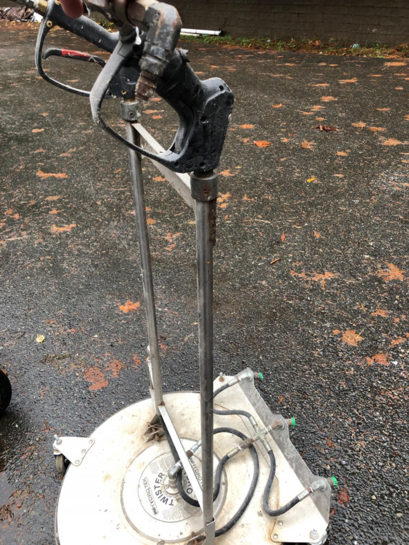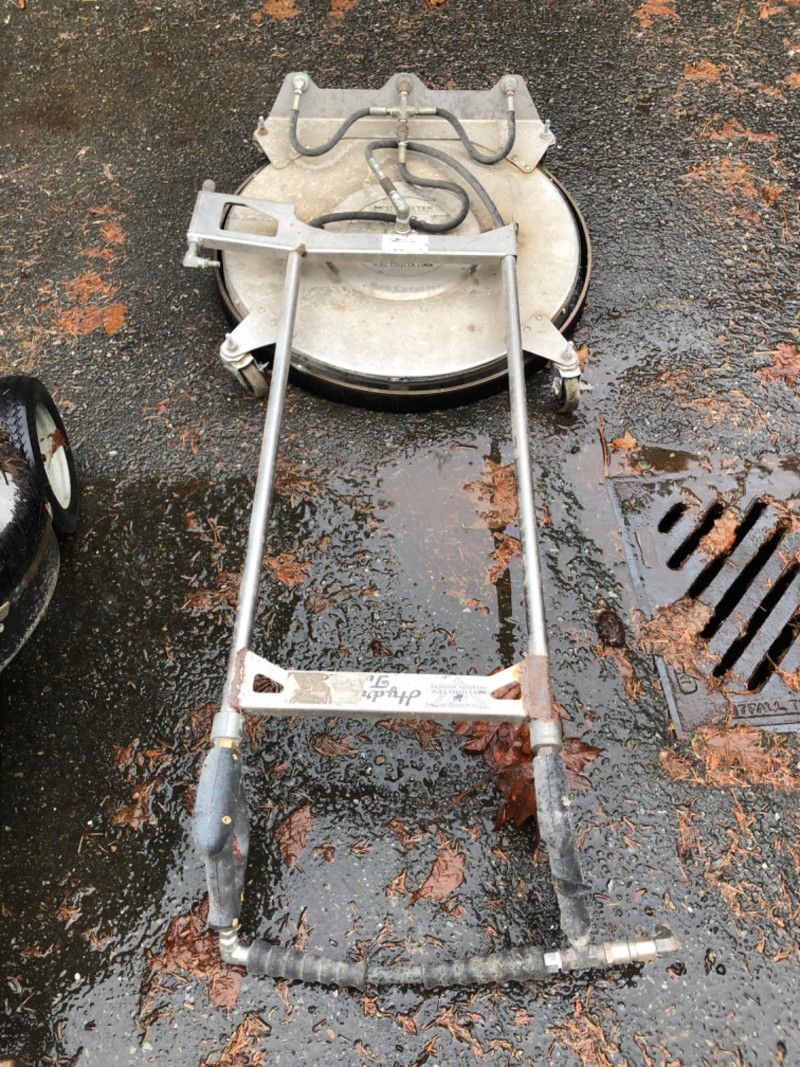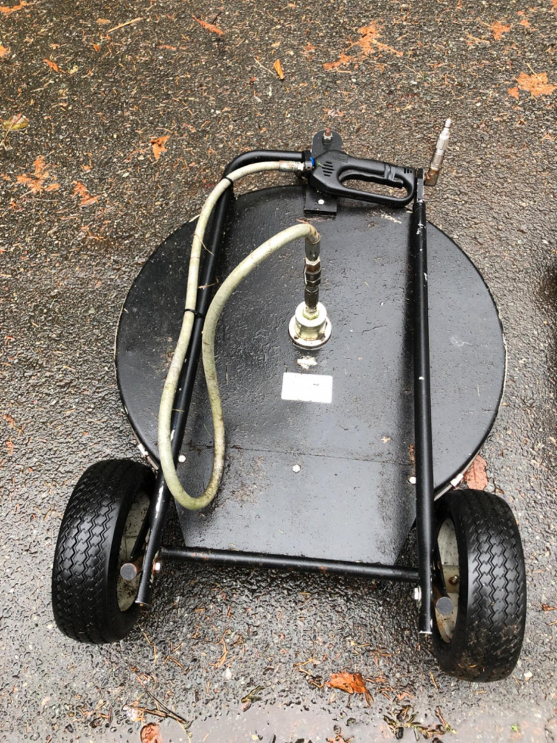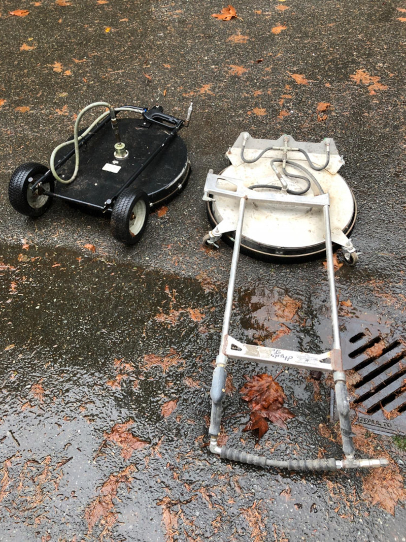 Pair of large pressure washer deck scrubbers, each with a 27‑inch radius cleaning area. Designed for contractor and industrial use, these scrubbers provide efficient, wide‑coverage cleaning for decks, patios, driveways, and shop floors. Durable construction ensures reliable performance under heavy use. Ideal for contractors, facilities maintenance, and large‑scale cleaning projects requiring speed and consistency. At retail these decks typically cost $300 - $500 each.