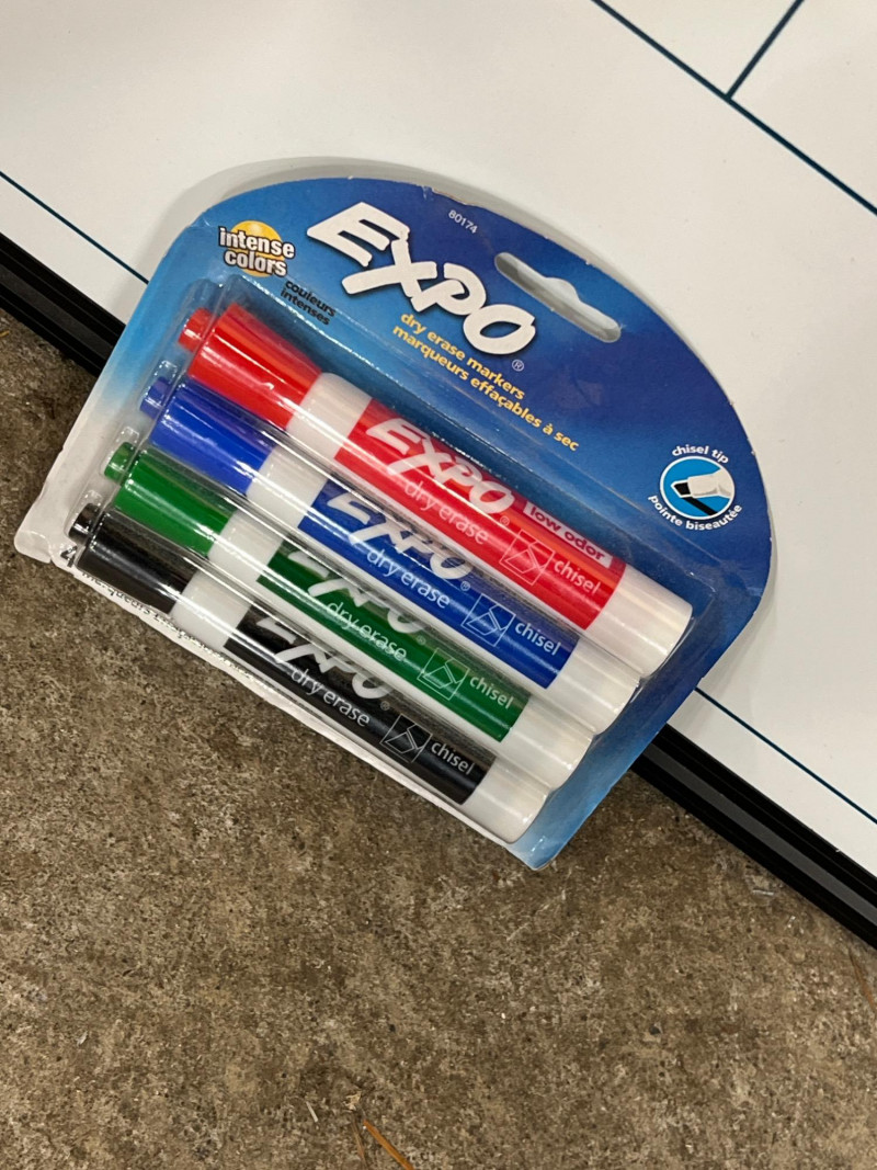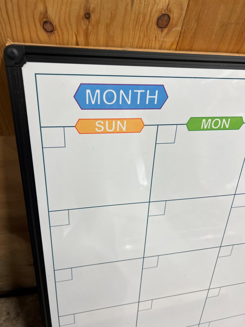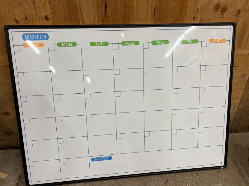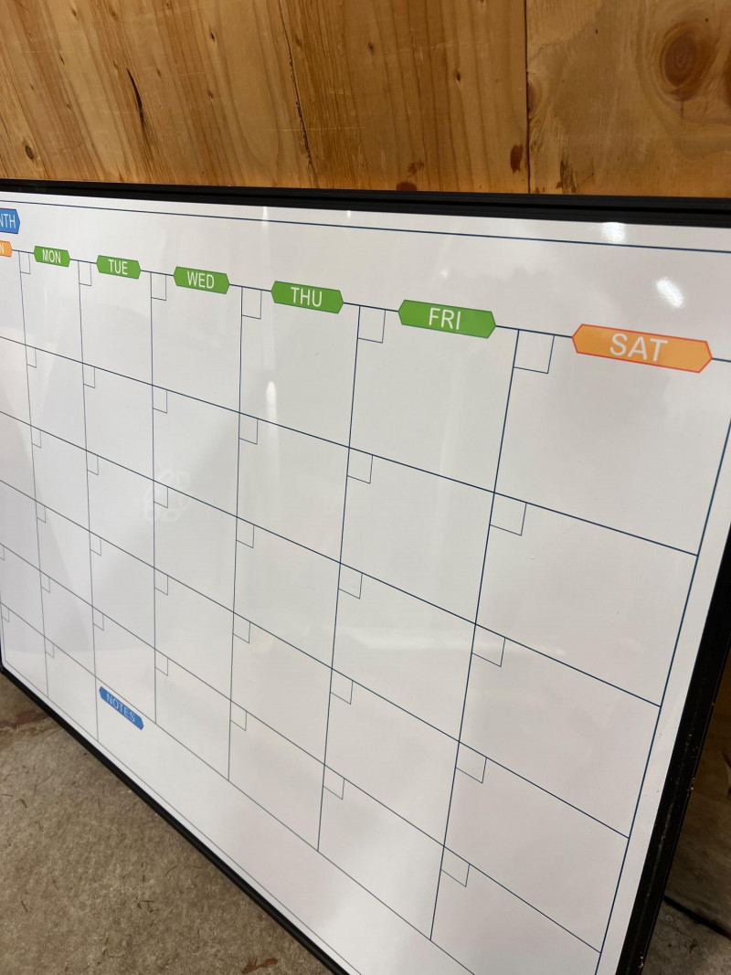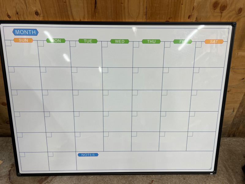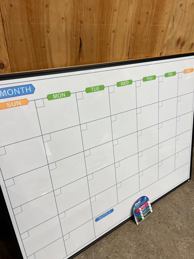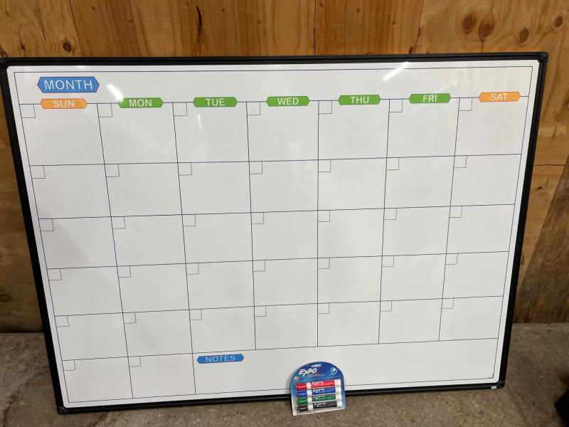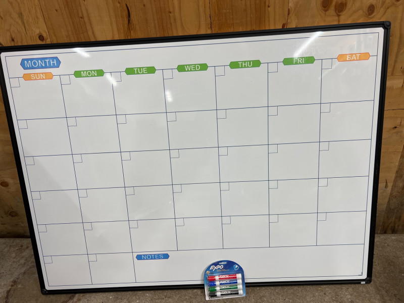 Extra‑large monthly calendar white board, measuring a full 48 inches (4 ft wide), paired with Expo dry erase pens. Size: Oversized 4 ft width provides ample space for clear scheduling, notes, and visibility across a room. Design: Grid layout for monthly planning; smooth white board surface for easy writing and erasing. Note convenient top and bottom strip of board has been added for ease in hanging. Utility: Perfect for offices, classrooms, or busy households needing a large, central organizer. Accessories: Includes Expo dry erase pens for bold, reliable writing.