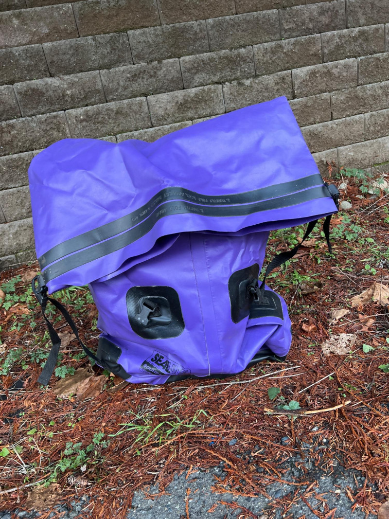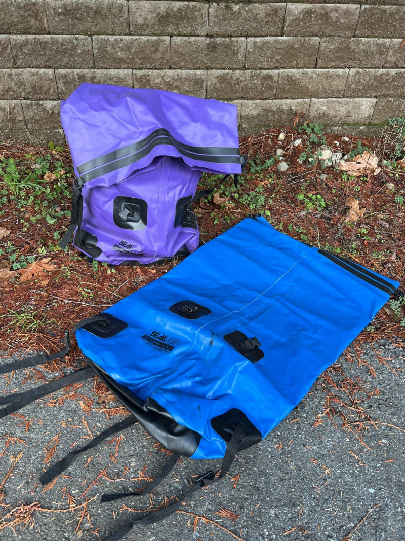 Pair of SealLine waterproof duffel bags (115), built for durability and protection in demanding outdoor conditions. Design: Heavy‑duty vinyl construction with welded seams to keep contents dry. Utility: Ideal for camping, boating, rafting, or contractor gear transport where water resistance is essential. Features: Roll‑top closure with secure straps; reinforced handles for easy carrying. Condition: Both bags included; sold as‑is.