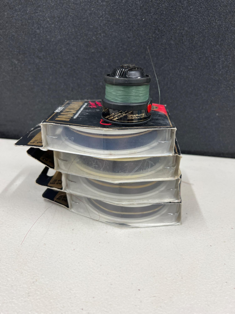 Set of three fishing reels with line, featuring trusted brands and versatile designs. Shimano Speedmaster: Known for smooth drag and precision engineering, ideal for saltwater or freshwater use. ABU 5500: Classic Ambassadeur reel, durable construction with reliable casting performance. R2F Reel: Ready‑to‑fish design, lightweight and practical for everyday angling. Utility: Includes line on reels and additional box sets of line; suitable for bass, trout, and general freshwater fishing. Condition: Mixed lot; sold as‑is.
