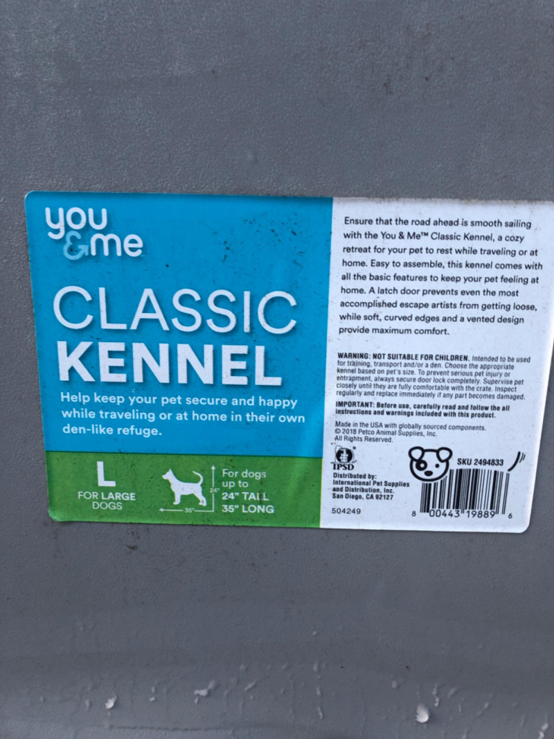 Spacious You & Me Classic Kennel, designed for comfort and security for medium‑sized dogs. Size Capacity: Suitable for dogs up to 24 inches tall and 35 inches long. Design: Durable plastic construction with ventilation panels for airflow. Features: Secure front door latch, molded handle for portability, and easy‑clean interior. Utility: Ideal for travel, training, or at‑home use.