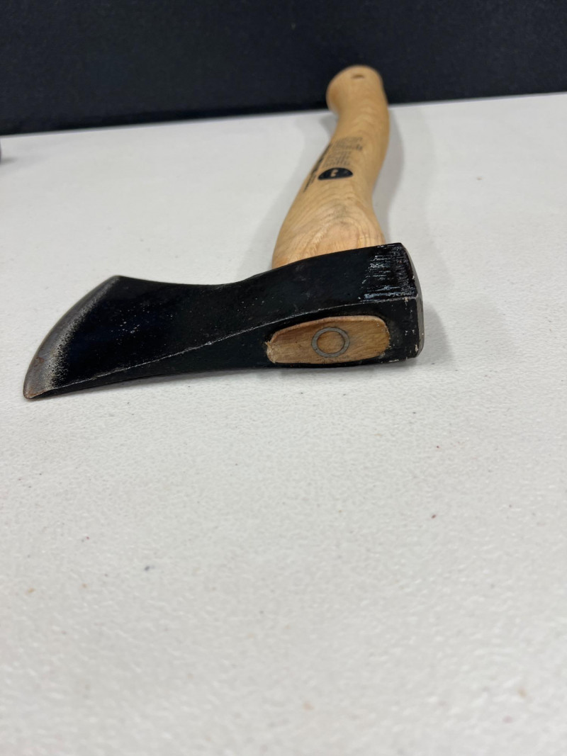 Traditional Condor Classic hatchet with durable wood handle, designed for outdoor and utility use. Dimensions: 15.5" length, 6" blade width. Design: Forged steel head paired with a smooth hardwood handle for balance and control. Utility: Ideal for camping, splitting kindling, or light chopping tasks. Features: Classic styling with reliable performance; compact size for portability and leather snap on/off sheath