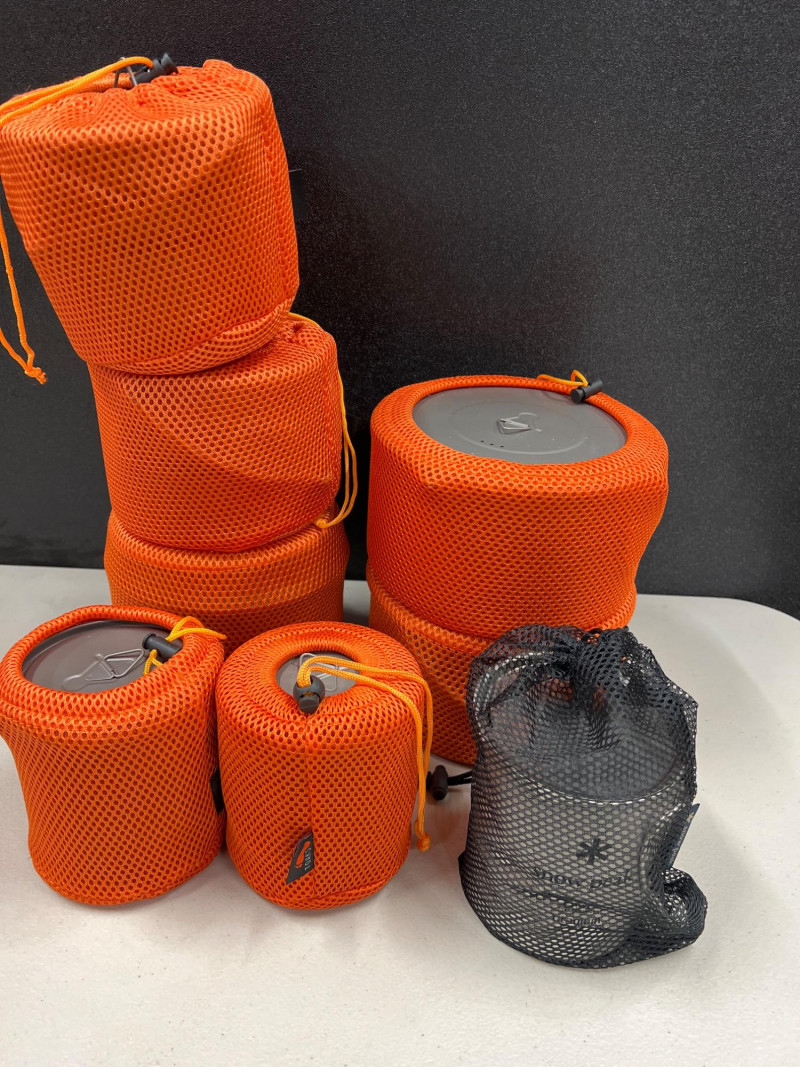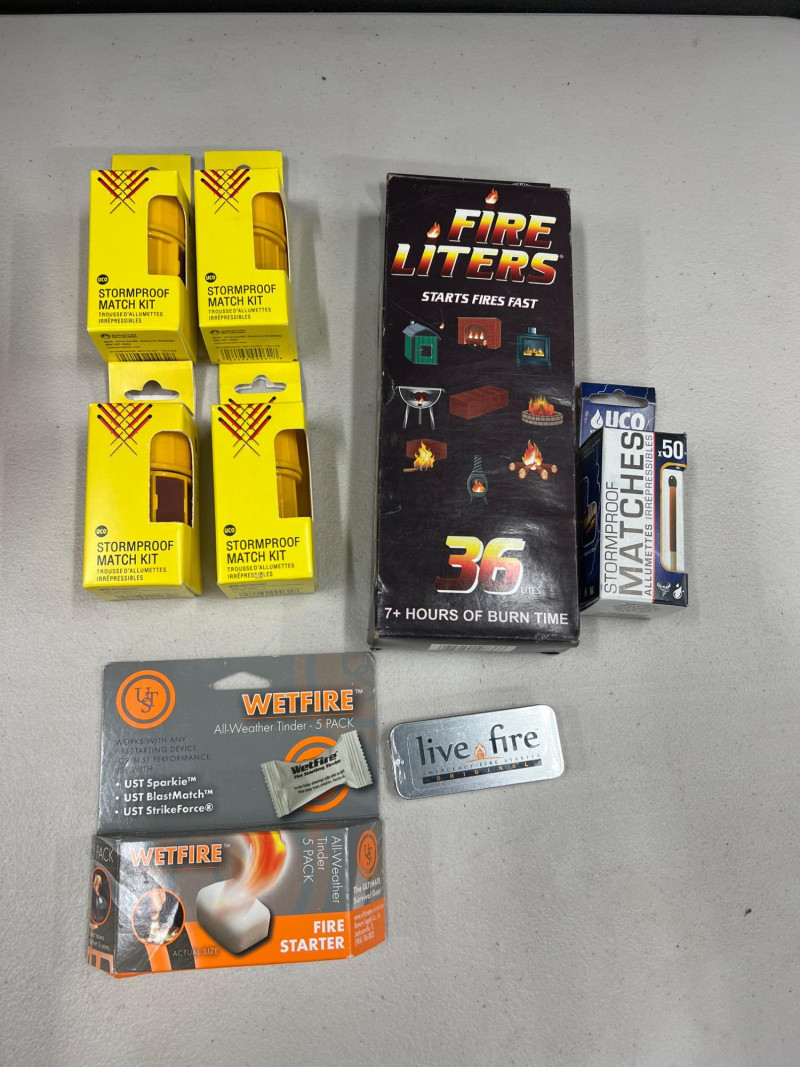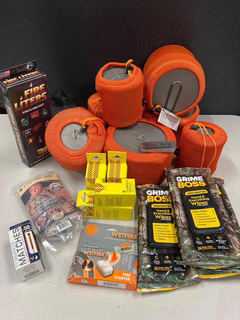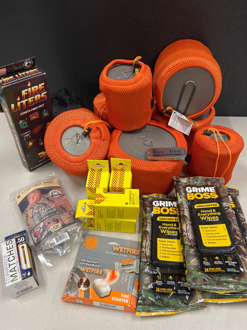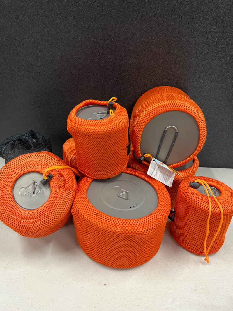 Assorted outdoor and camping essentials, combining fire‑starting supplies with versatile cookware. Fire Lighters: Reliable ignition tools for campfires, grills, or outdoor cooking. Fire Liters, storm proof matches. Camping Cookware: Includes pots, pans, and utensils designed for lightweight portability and durability, yet made of durable titanium with mesh fabric covers. Appear to be unused. Additional Gear: Miscellaneous outdoor items to support cooking and camp setup. Utility: Perfect for campers, hikers, or backyard grilling enthusiasts.
