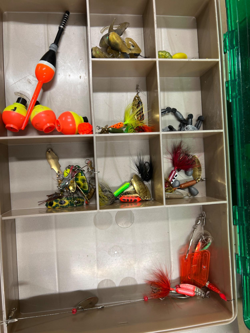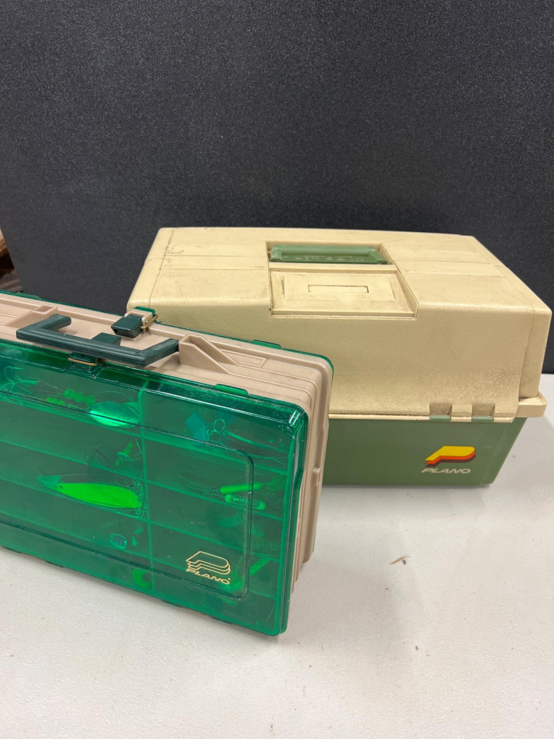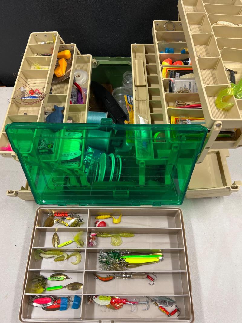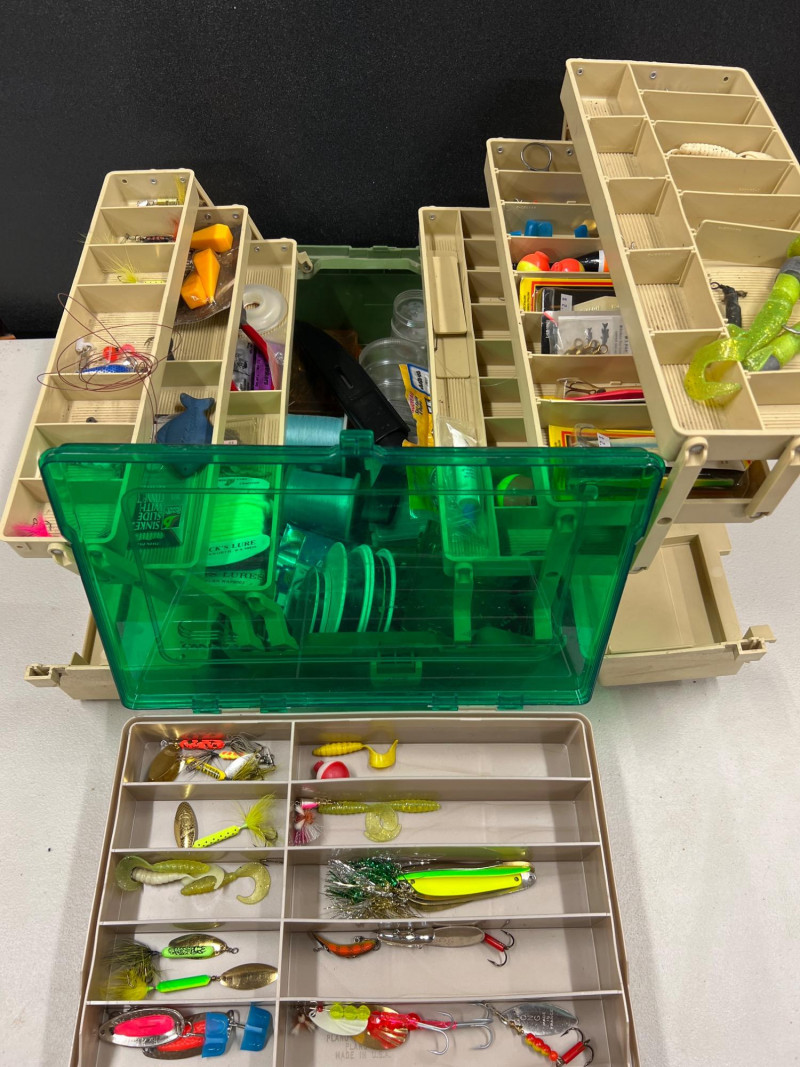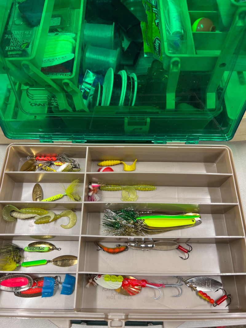 Complete Plano multi‑tray fishing tackle box paired with a double‑sided satchel (12" x 8" x 4"), both stocked with assorted gear. Plano Multi‑Tray Box: Durable hard‑shell design with tiered trays for organized storage of lures, hooks, and accessories. Double‑Sided Satchel: Compact, portable case with dual compartments for quick access to tackle. Contents: Stocked with a variety of fishing essentials (lures, hooks, weights, and more). Utility: Perfect for anglers seeking ready‑to‑fish organization and reliable storage solutions. Condition: Stocked and functional; sold as‑is.