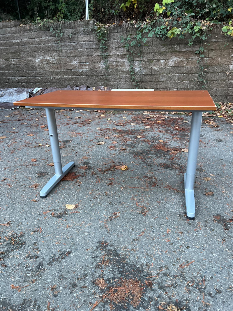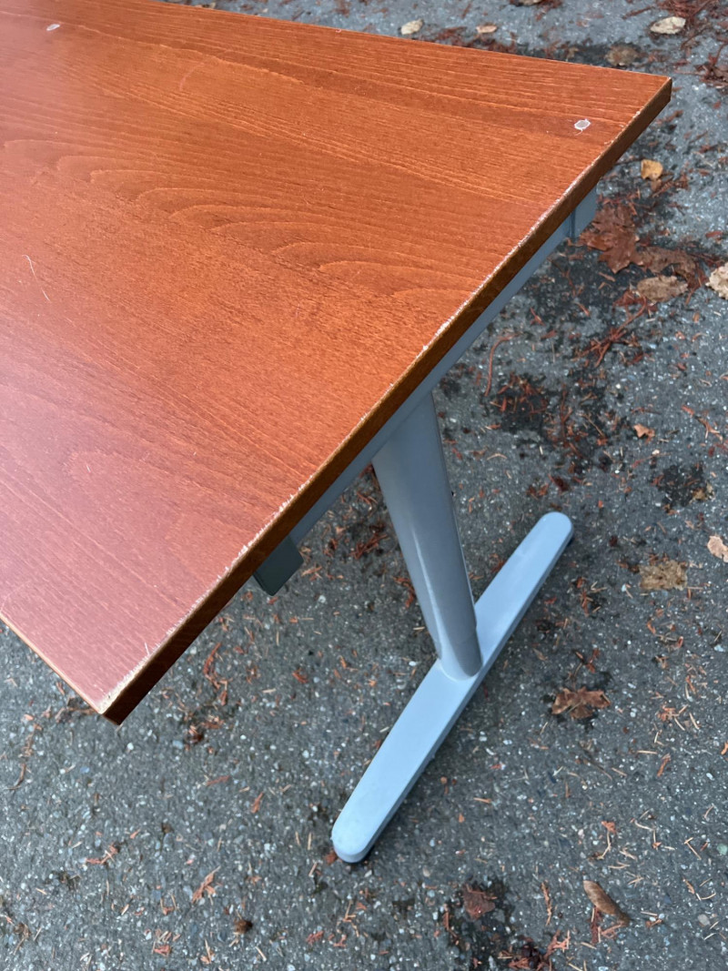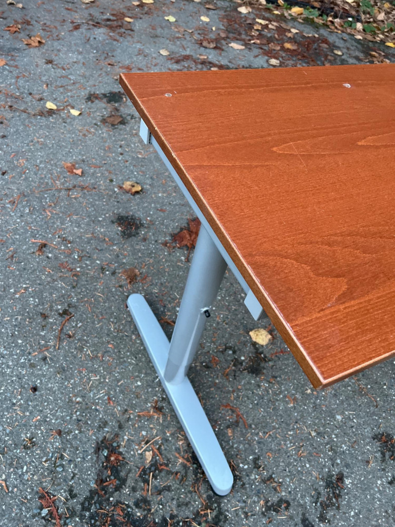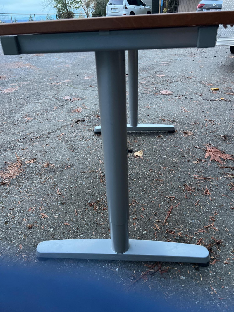 Modern Herman Miller style desk with adjustable wood top, designed for both function and aesthetic appeal. Dimensions: 47.25" L × 28" W × 23‑5/8" H. Design: Sleek wood top paired with a sturdy adjustable frame for ergonomic comfort. Utility: Ideal for home office, studio, or professional workspace. Features: Adjustable height for customized use; durable construction with clean, minimalist styling. Condition: Solid and functional; note three filled holes in desktop, sold as‑is.