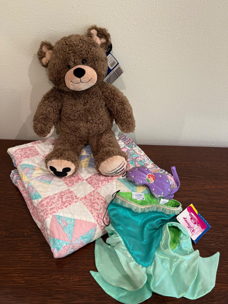 Charming Disney Exclusive Build‑A‑Bear, dressed in an Ariel mermaid costume, paired with a cozy baby quilt. Build‑A‑Bear: Authentic Disney Exclusive plush, soft and collectible. Costume: Ariel mermaid outfit inspired by The Little Mermaid, complete with shimmering details. Quilt: Baby‑sized quilt adds warmth and comfort, perfect for display or play. Utility: Ideal for collectors, Disney fans, or as a whimsical gift set.