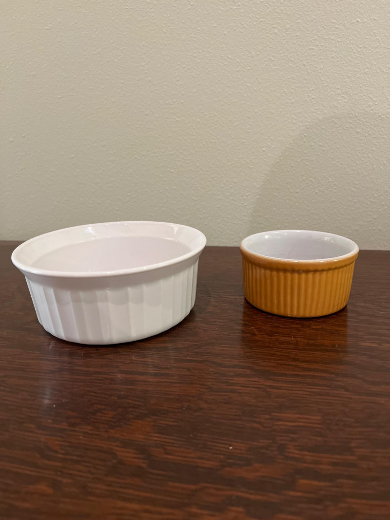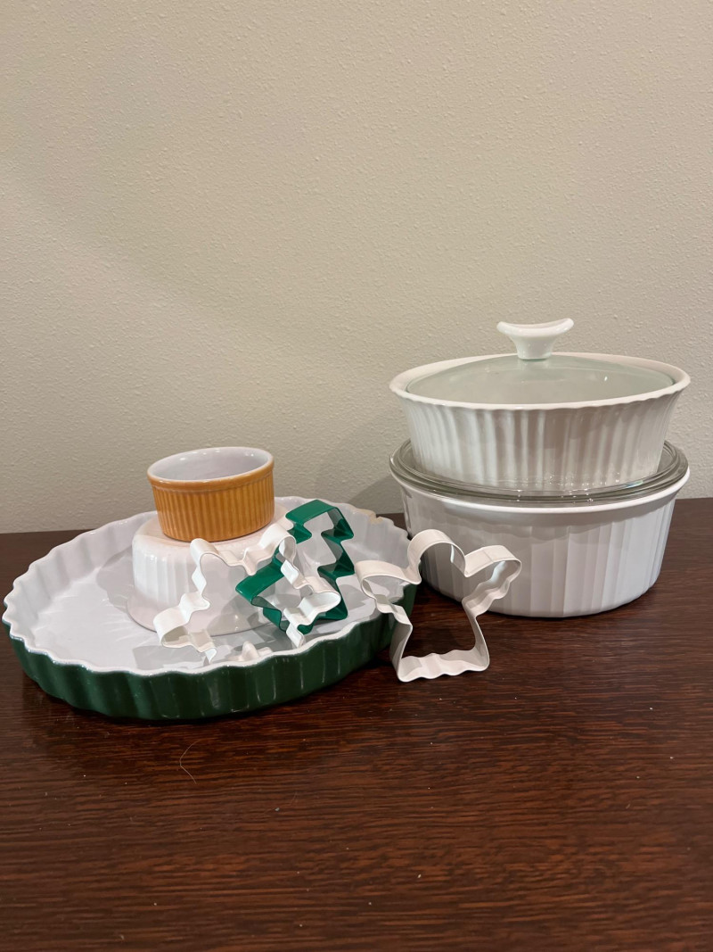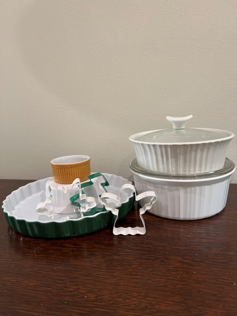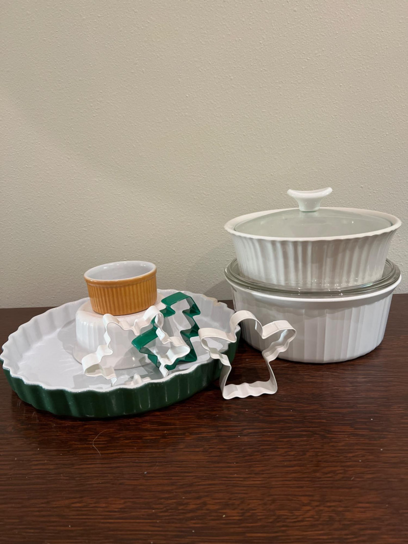 Assorted bakeware and kitchen essentials, blending premium French stoneware with classic American glassware. Emile Henry France Ramekins: Elegant ceramic ramekins, perfect for soufflés, crème brûlée, or individual desserts. Casserole Dishes: Pyrex and CorningWare glass casseroles, versatile for baking, roasting, and serving. Cookie Cutters: Assorted shapes for festive baking and creative treats. Utility: Complete set for home bakers and cooks, combining durability, style, and everyday function.