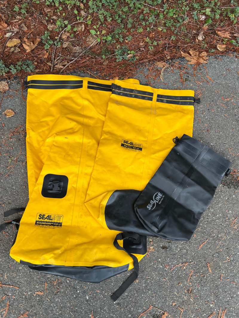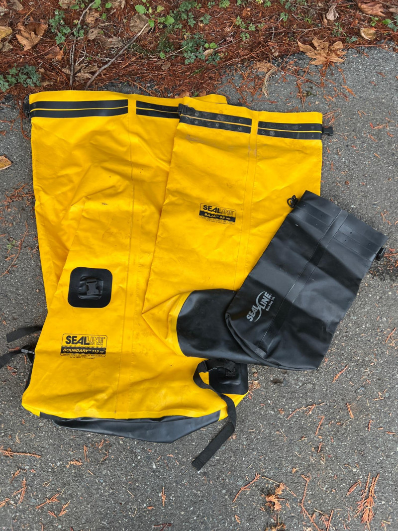 Set of heavy‑duty waterproof dry bags, perfect for outdoor adventures, boating, or camping. SealLine 115 Dry Bag: Large capacity, rugged yellow waterproof bag for extended trips and gear protection. SealLine 55 Dry Bag: Mid‑size yellow waterproof bag, ideal for camping or kayaking essentials. Baja 10 Bag: Compact waterproof bag, great for day trips or smaller valuables. Utility: Designed to keep gear dry in challenging conditions; trusted by outdoor enthusiasts.