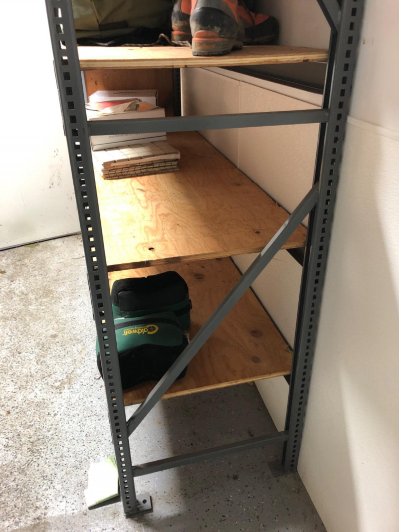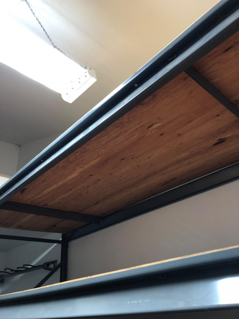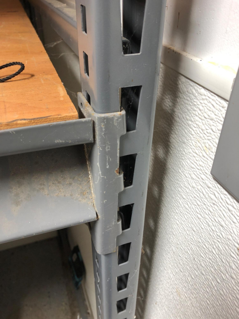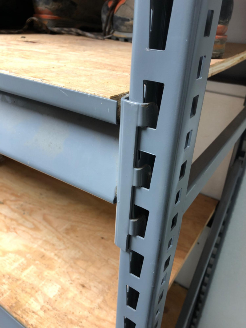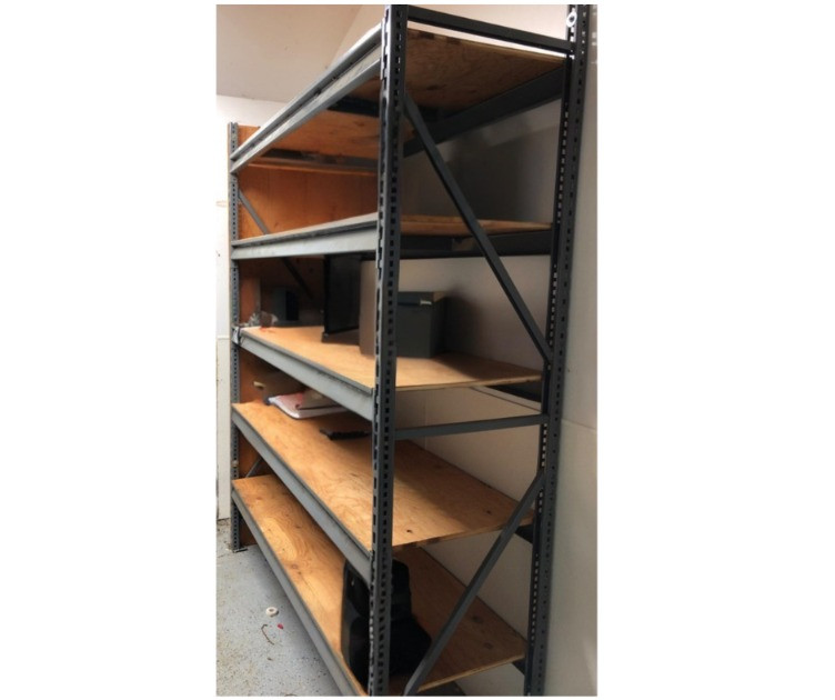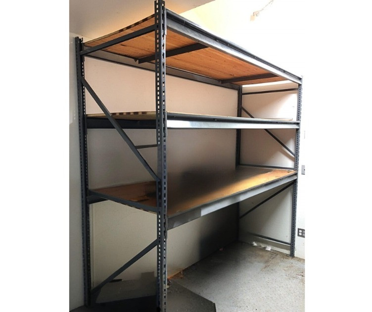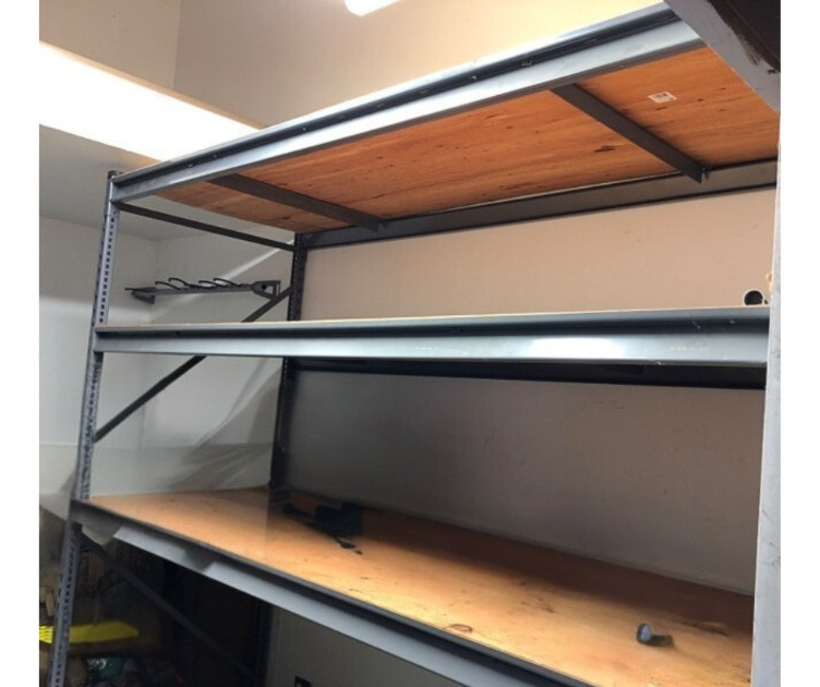 Two Husky style industrial shelving units, built for heavy‑duty contractor and shop organization. Unit 1 Dimensions: 8’ height × 102” length × 36” depth Unit 2 Dimensions: 8’ height × 77” length × 24” depth Both units feature rugged steel construction and adjustable shelves, ideal for storing tools, materials, and industrial supplies. Designed for durability and high‑capacity storage, these shelves are perfect for contractors, mechanics, and shop organization. Special Note: Unit appears to be assembled with interlocking rails and supports. Wood shelves. Buyer dissassembles unit or brings vehicle that can transport unit as is. Located at parking lot level and near door leading directly to parking lot.