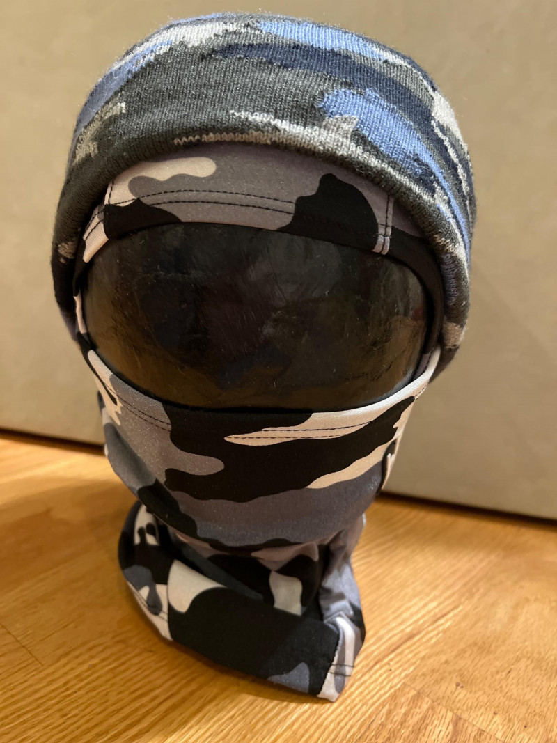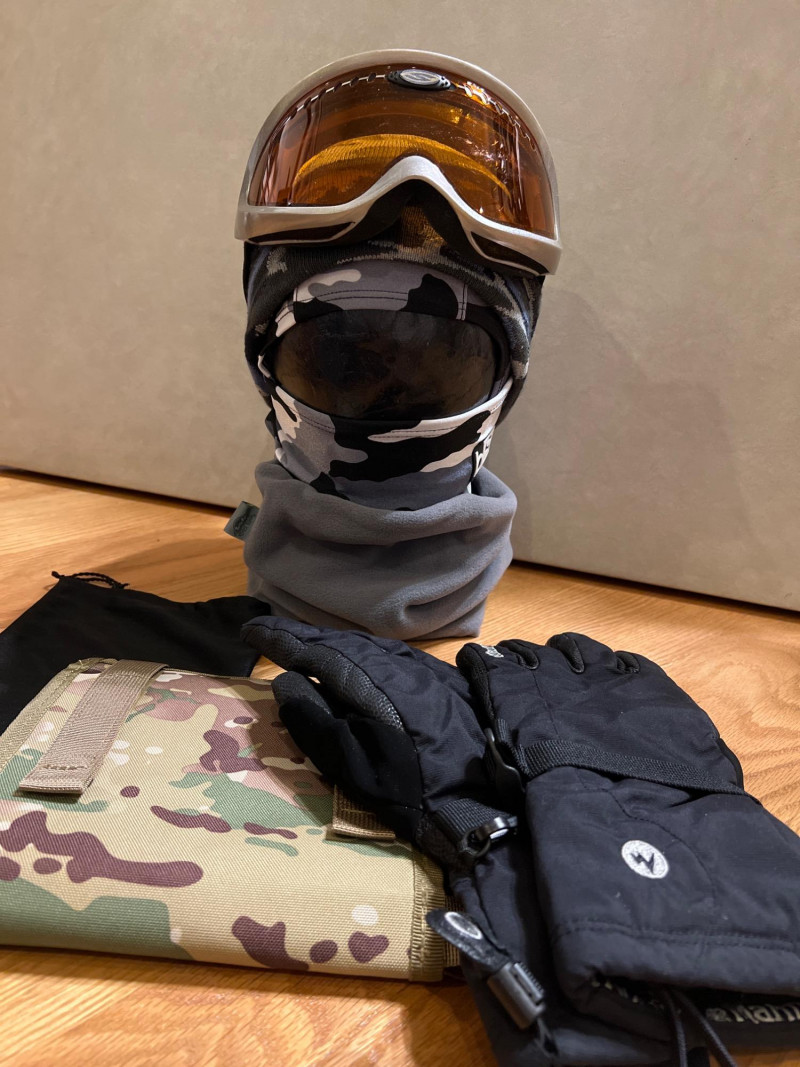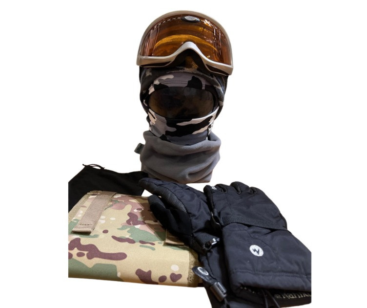 A complete cold‑weather gear bundle featuring trusted outdoor brands and versatile accessories. Included is a BlackStrap Hood balaclava in grey camouflage print for full‑coverage protection, a Broner blue and grey camouflage beanie, and a Turtle Fur neck warmer for soft insulation against wind and cold. For visibility on the slopes, the lot includes Smith ski goggles, while hand protection comes from Marmot Randonnee Gore‑Tex gloves, engineered for waterproof durability and warmth. Rounding out the set is a camouflage wilderness 7" x 5" wallet pack, ideal for organizing essentials. Together, these items provide reliable performance and comfort for skiing, hiking, or winter adventures.