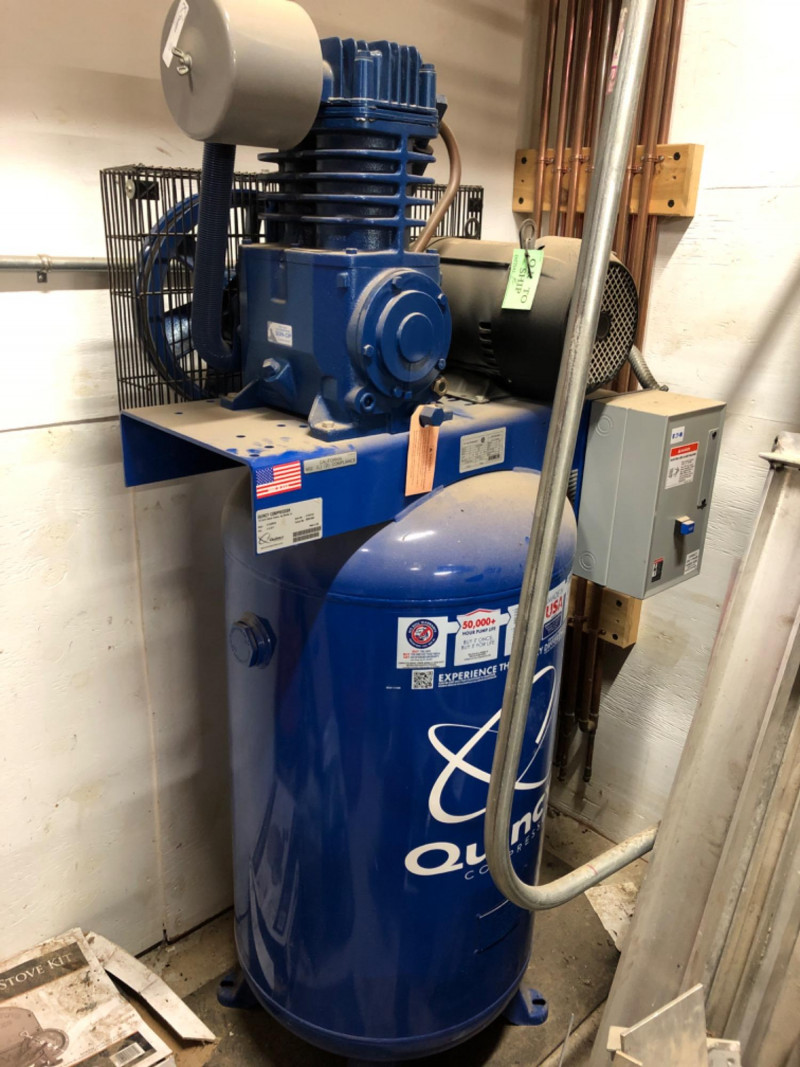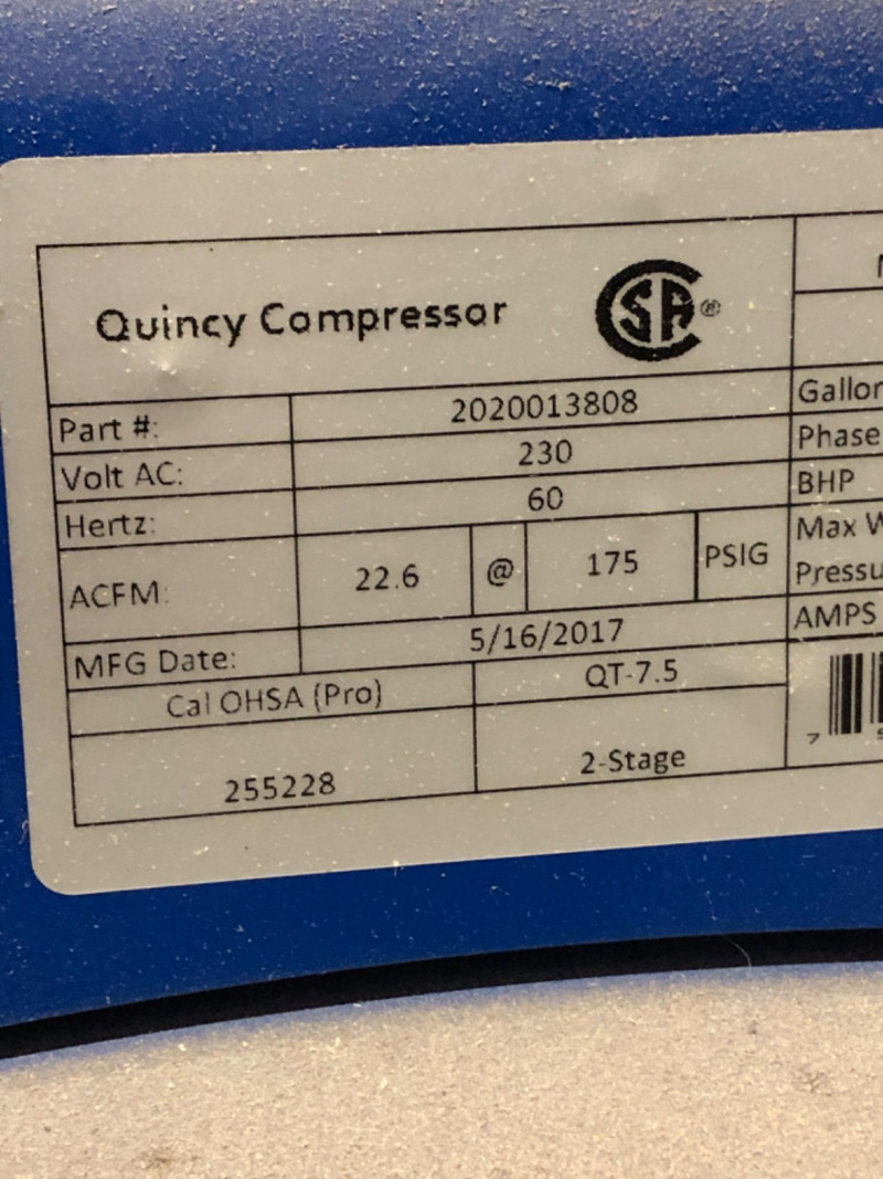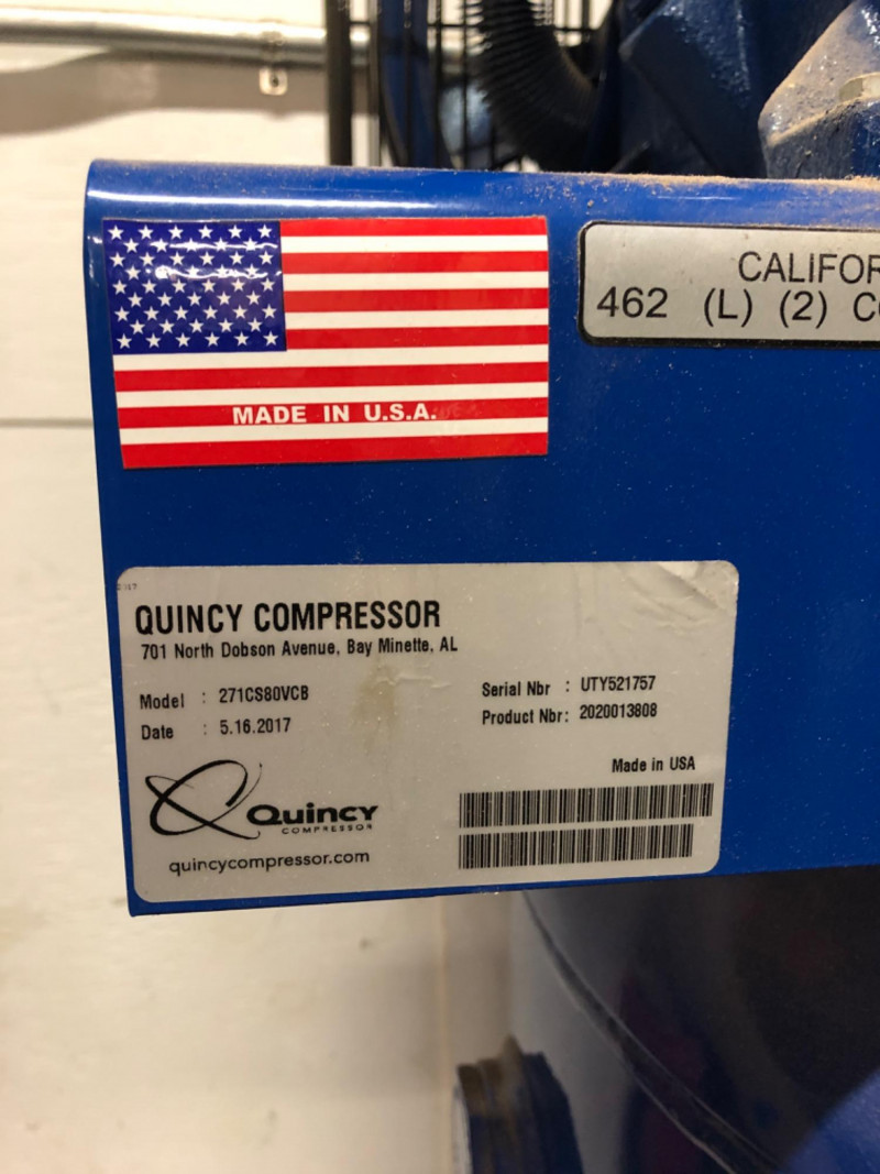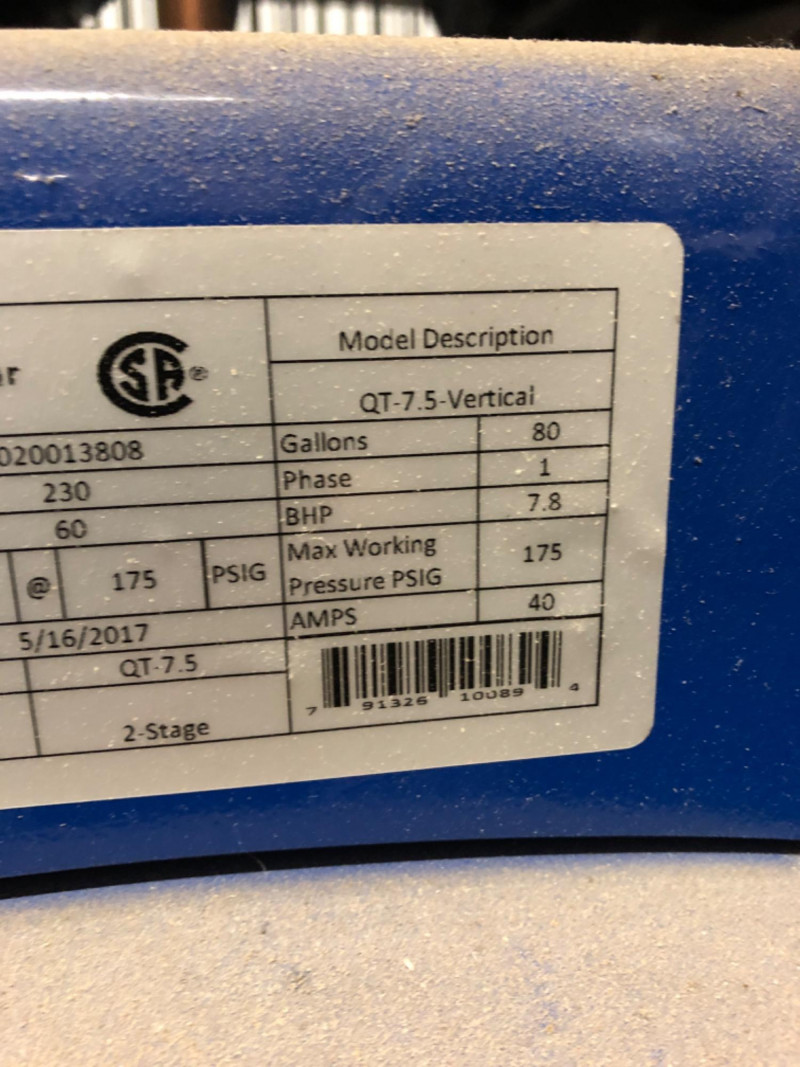 Quincy Model 271CS80VCB QT‑7.5 air compressor, a professional‑grade 7.5 horsepower, 80‑gallon vertical tank, two‑stage unit. Built for heavy‑duty contractor and industrial applications, this compressor delivers 23 CFM at 175 PSI with a 100% duty cycle. Features include: Splash‑lubricated, cast‑iron pump for durability and dependability High‑efficiency finned intercooler to reduce air temperature and improve performance 1725 RPM industrial motor for continuous operation ASME‑coded tank and safety valves for compliance and reliability Extra oil capacity for cooler running and extended pump life (50,000+ hours) Proudly built in the U.S.A. with a generous factory warranty Ideal for shops, contractors, and industrial environments requiring consistent, high‑capacity compressed air.