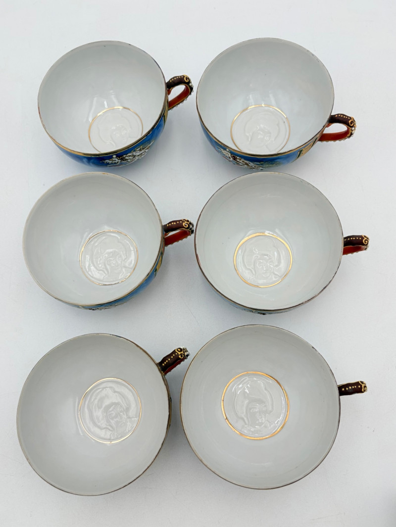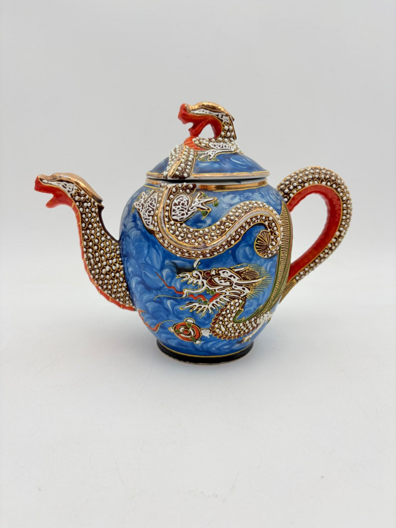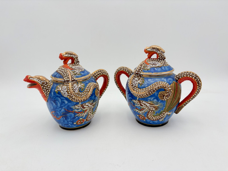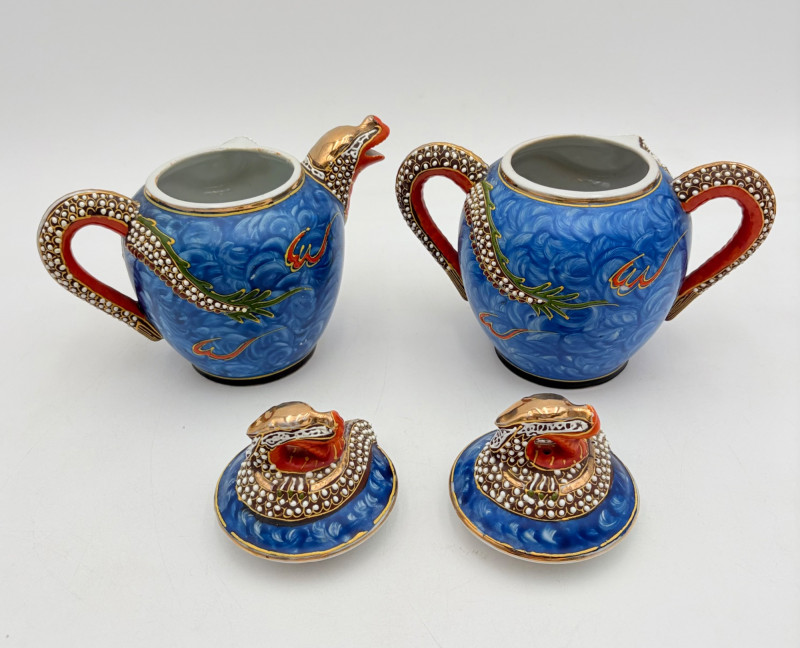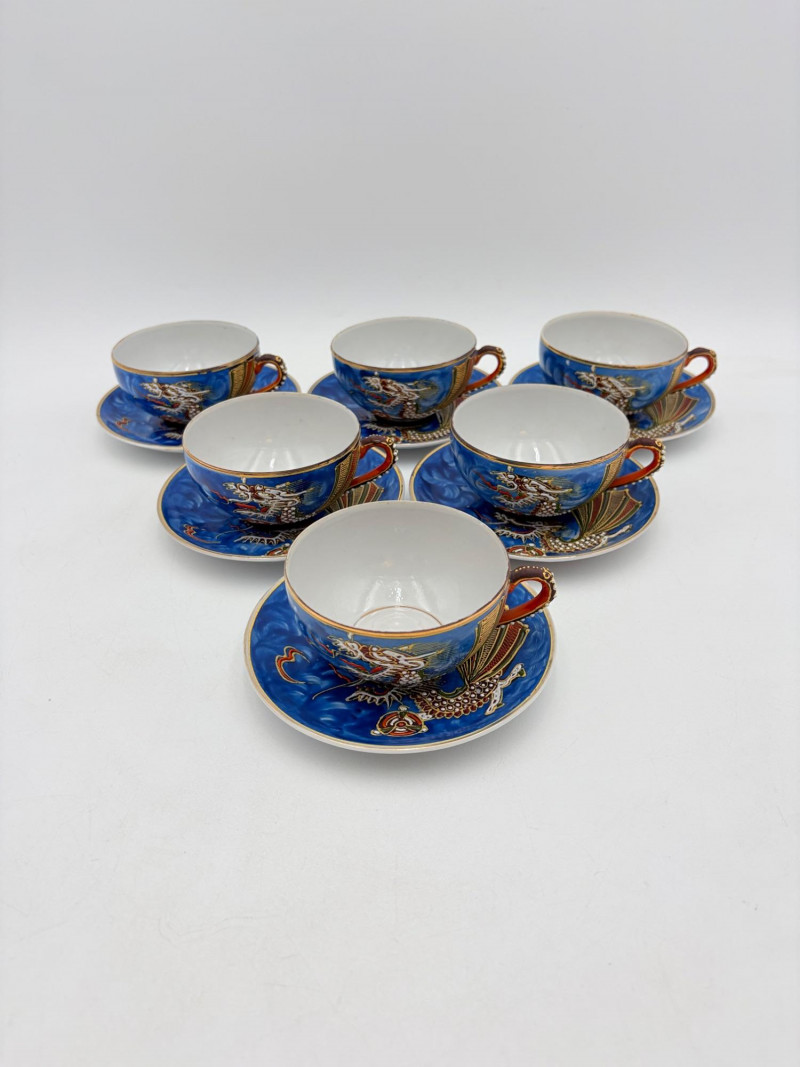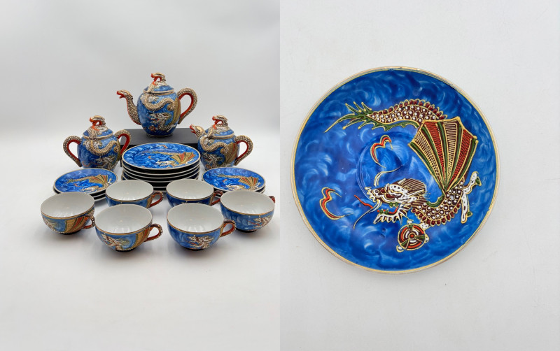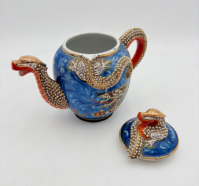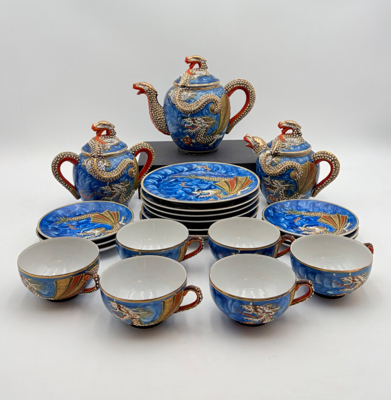Lovely vintage tea & dessert set of Japanese moriage dragonware porcelain - all pieces are hand-decorated and in excellent condition with only minor cosmetic wear - no cracks or chips noticed. Moriage glazing technique results in 3-D texture on the pieces and this set is in the traditional blue with swirl background. Teacups are lithophane with the head of a geisha appearing when held to light. Dragons with dotted white scales form the handles and lids of the serving pieces. Made in Japan by Chukyo China. Lot includes: - 6 lithophane teacups - 6 saucers (5.5" W) - 6 dessert plates (shy 7.5" W) - Sugar bowl with lid (6" H) - Creamer with lid (6" H) - Teapot with lid (7.5" H)