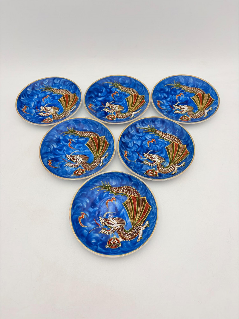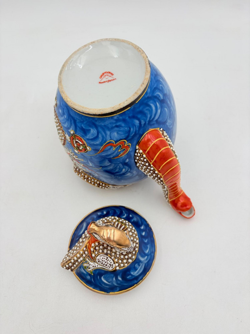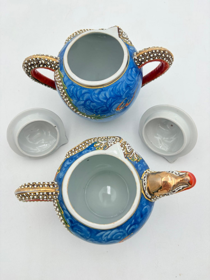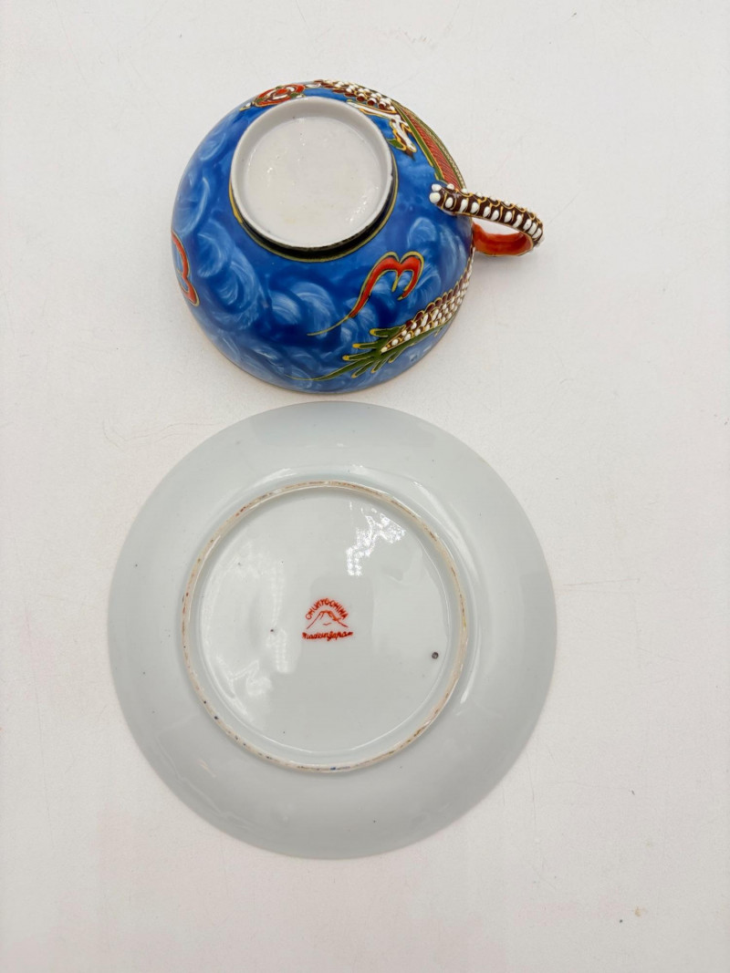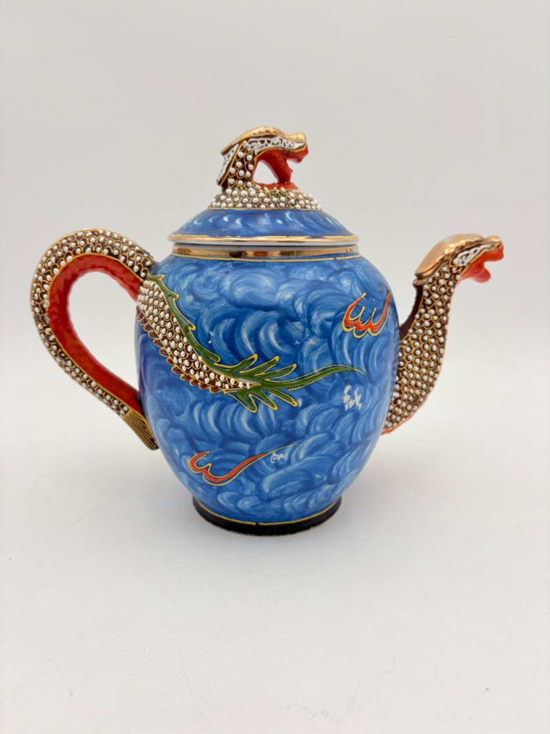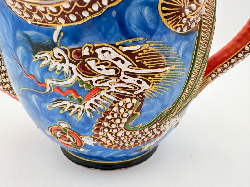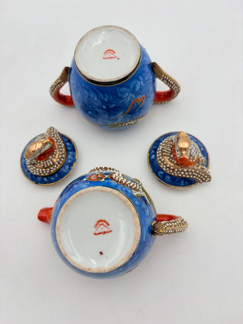 Lovely vintage tea & dessert set of Japanese moriage dragonware porcelain - all pieces are hand-decorated and in excellent condition with only minor cosmetic wear - no cracks or chips noticed. Moriage glazing technique results in 3-D texture on the pieces and this set is in the traditional blue with swirl background. Teacups are lithophane with the head of a geisha appearing when held to light. Dragons with dotted white scales form the handles and lids of the serving pieces. Made in Japan by Chukyo China. Lot includes: - 6 lithophane teacups - 6 saucers (5.5" W) - 6 dessert plates (shy 7.5" W) - Sugar bowl with lid (6" H) - Creamer with lid (6" H) - Teapot with lid (7.5" H)