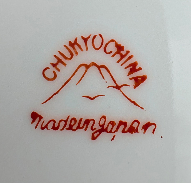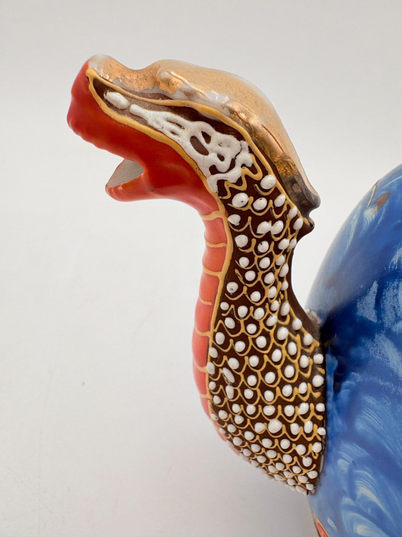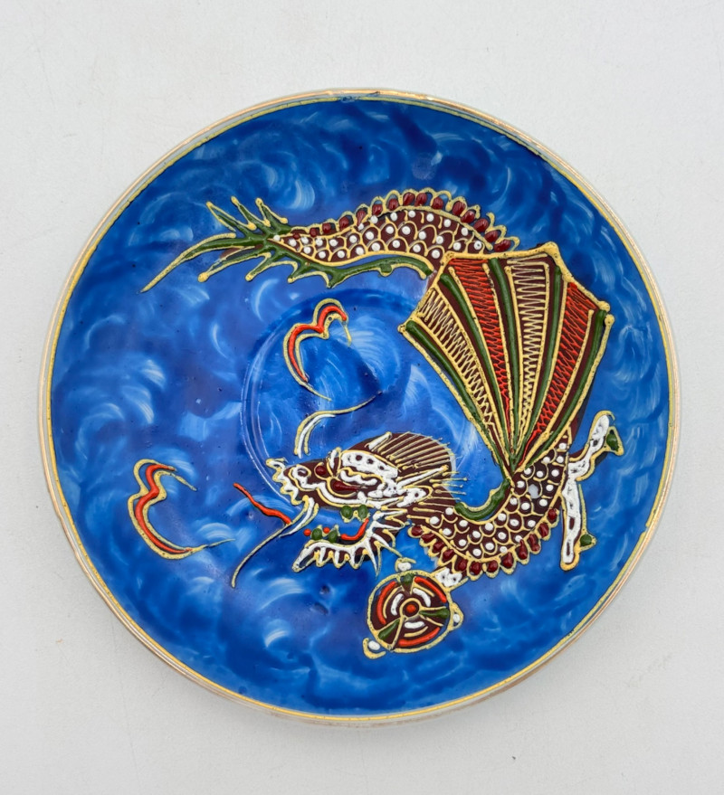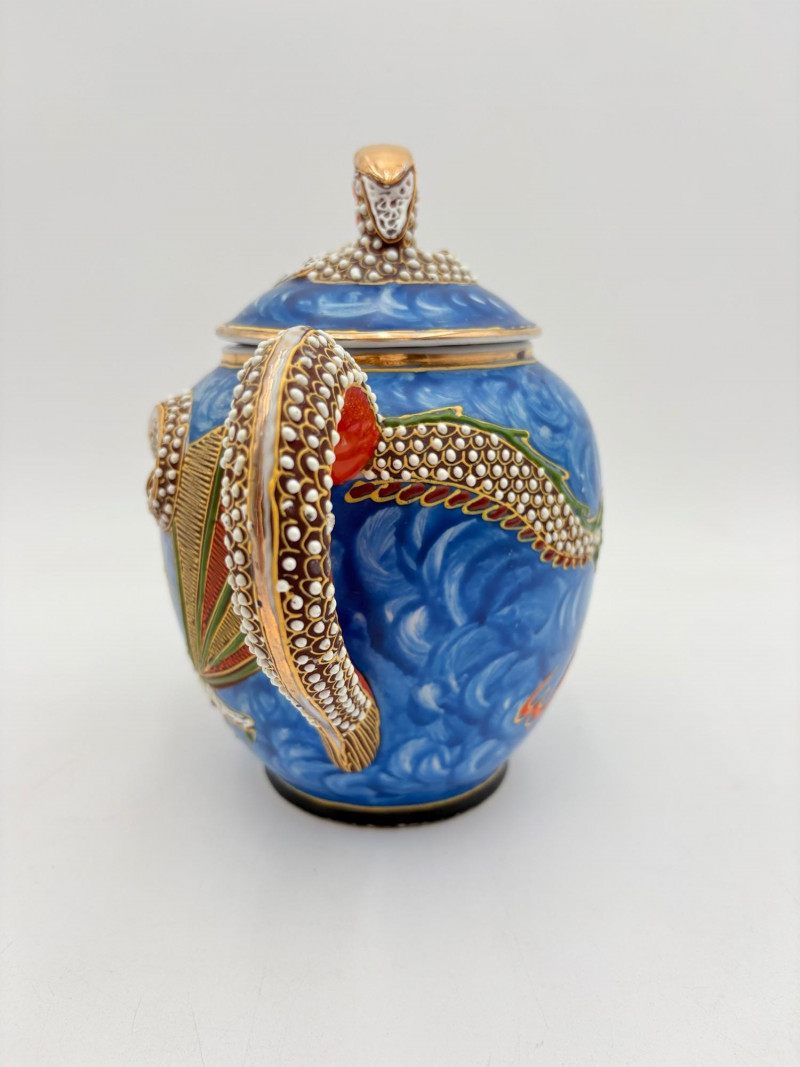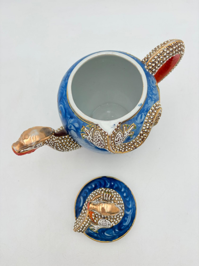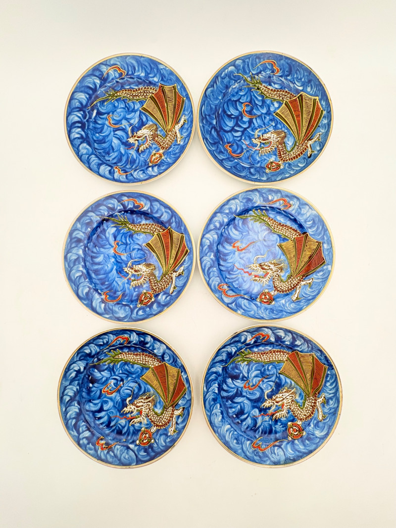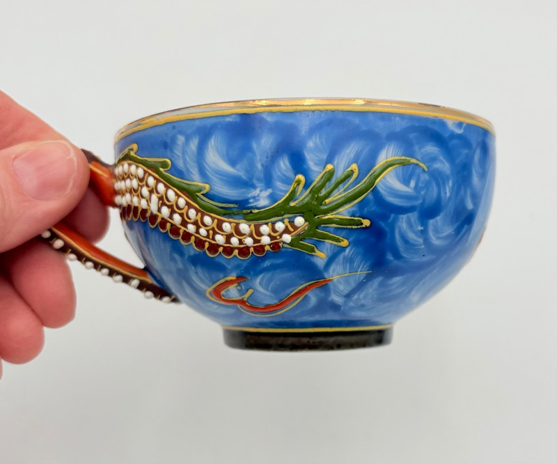 Lovely vintage tea & dessert set of Japanese moriage dragonware porcelain - all pieces are hand-decorated and in excellent condition with only minor cosmetic wear - no cracks or chips noticed. Moriage glazing technique results in 3-D texture on the pieces and this set is in the traditional blue with swirl background. Teacups are lithophane with the head of a geisha appearing when held to light. Dragons with dotted white scales form the handles and lids of the serving pieces. Made in Japan by Chukyo China. Lot includes: - 6 lithophane teacups - 6 saucers (5.5" W) - 6 dessert plates (shy 7.5" W) - Sugar bowl with lid (6" H) - Creamer with lid (6" H) - Teapot with lid (7.5" H)