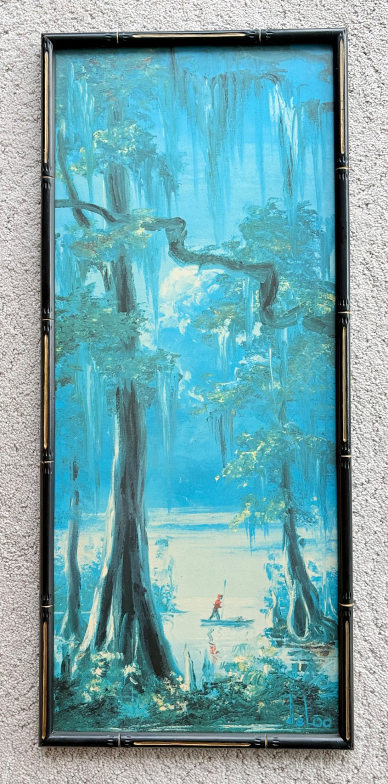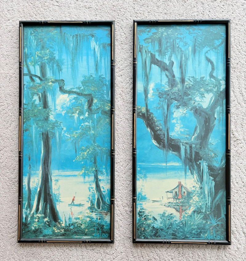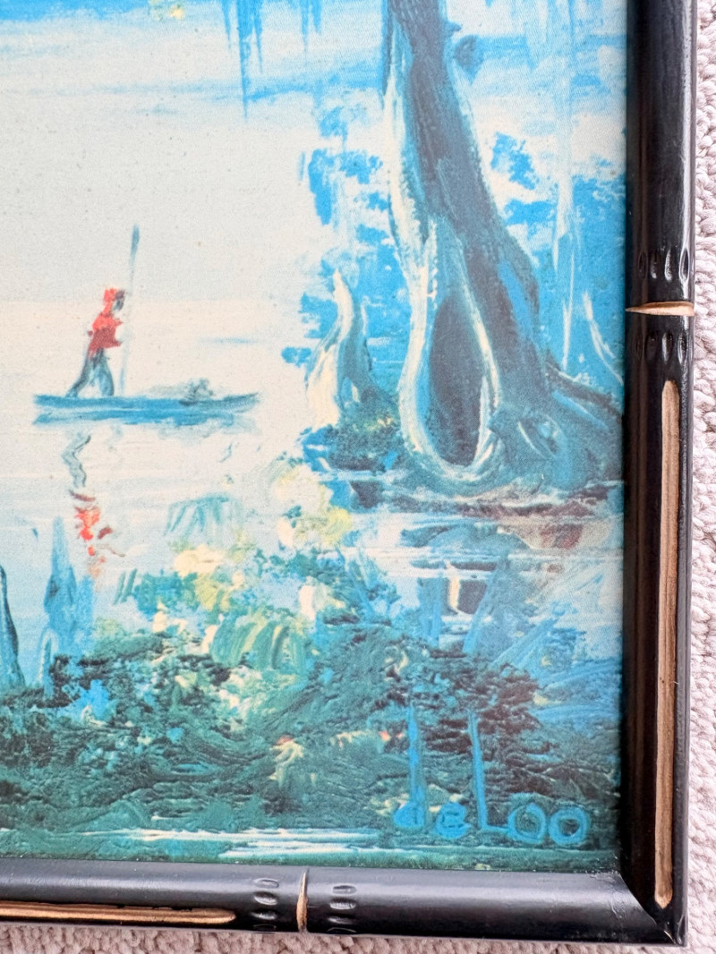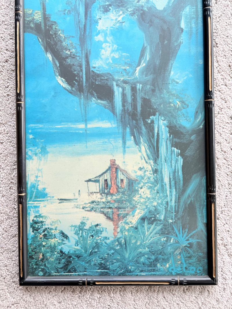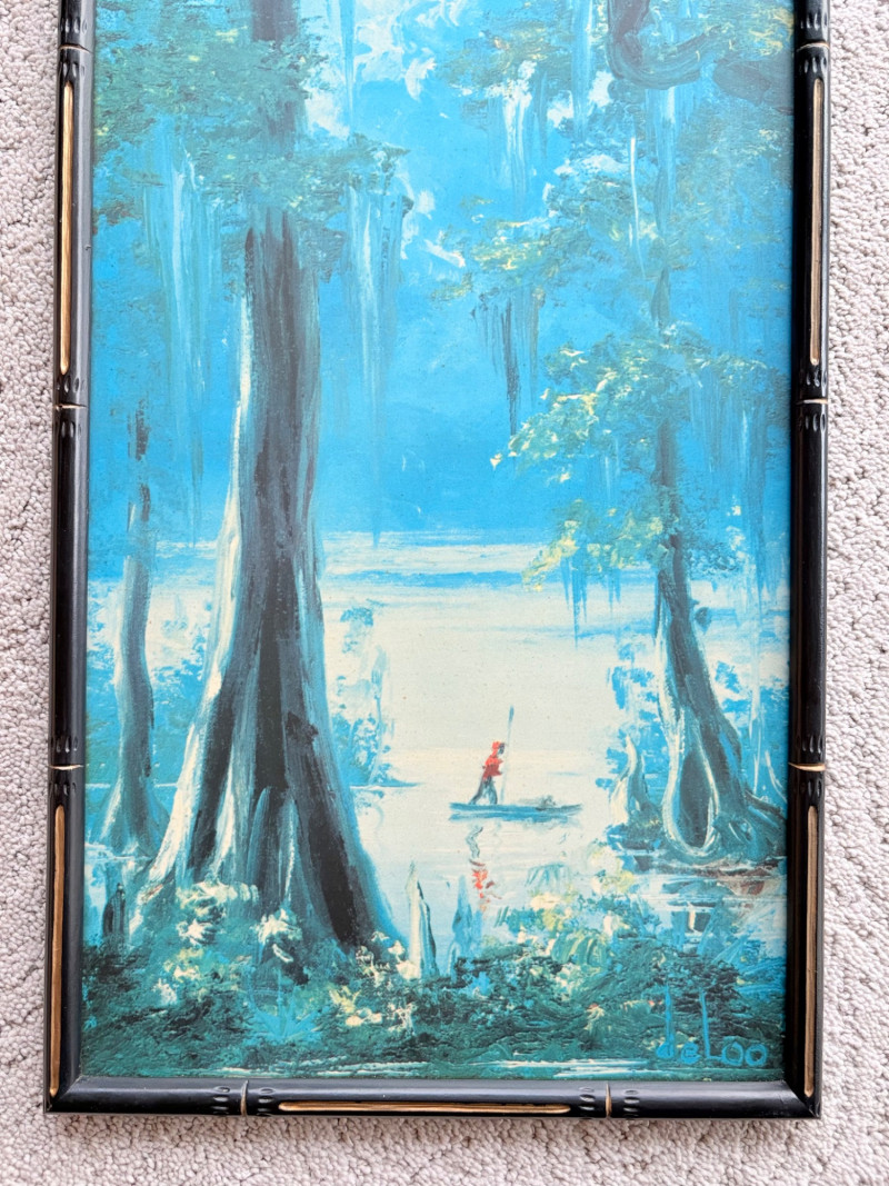 Terrific MCM pair of "swamp" prints by Margaret DeLoo in shades of teal with bursts of red/pink in the lower details (cabin & boater). Framed in a black pseudo-bamboo wood with gold painted highlights. In excellent vintage condition. Rear shows they were framed at the late, great Bon Marche (not sure if purchased there). Measure approx. 24.5" x 10.5" framed with cardboard backer board. Set of Two Margaret Deloo Framed Prints/margaret De Loo Swamp Scene Prints - Etsy note that this pair is considerably smaller than ours