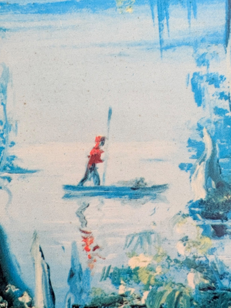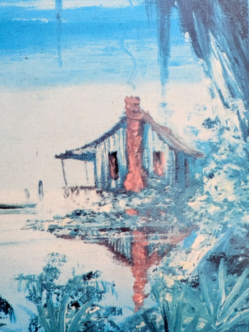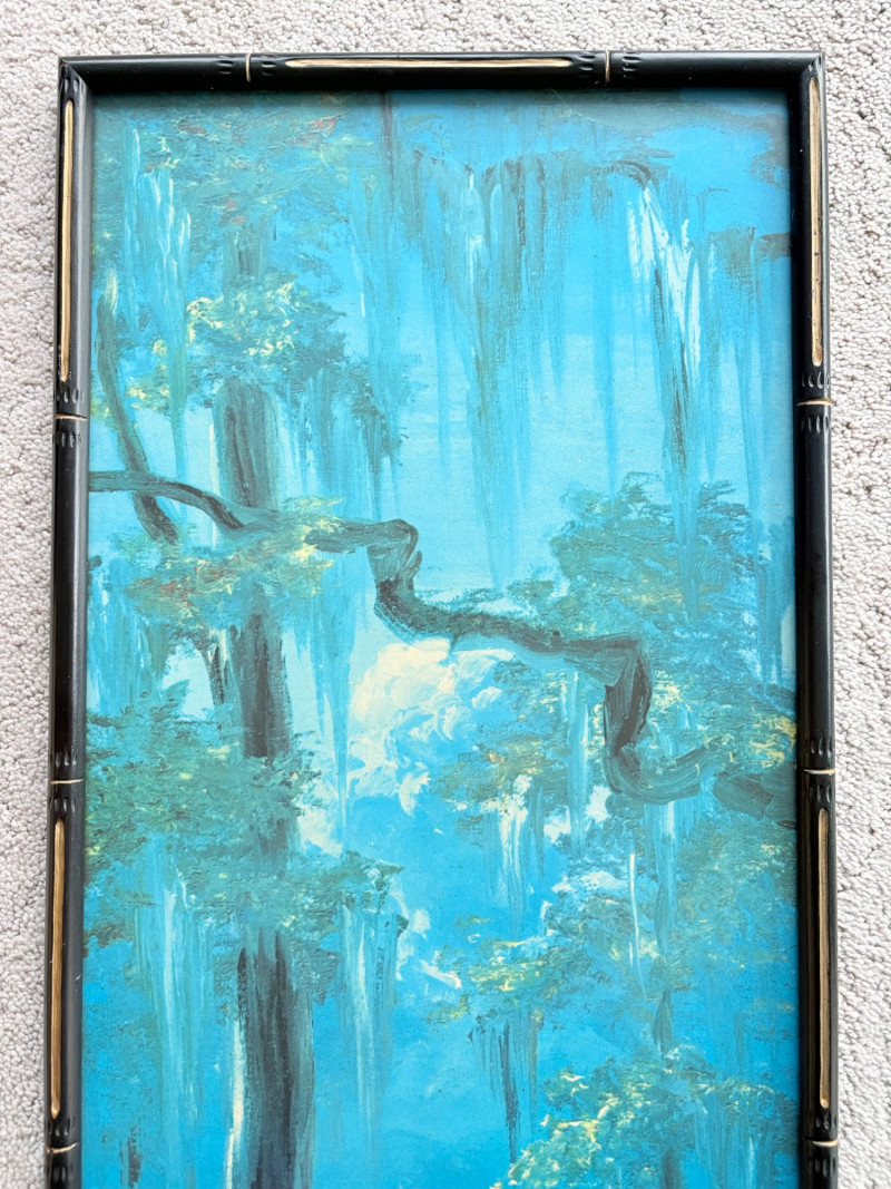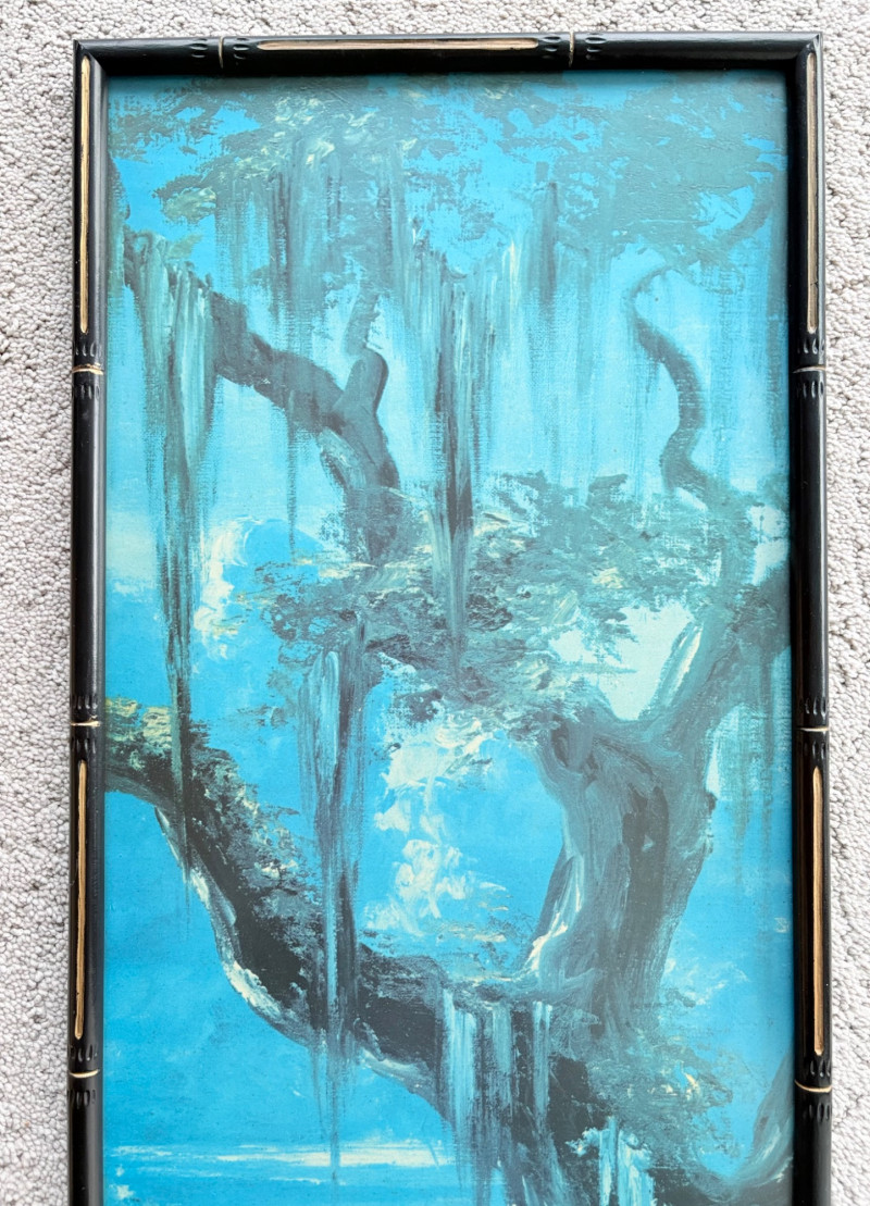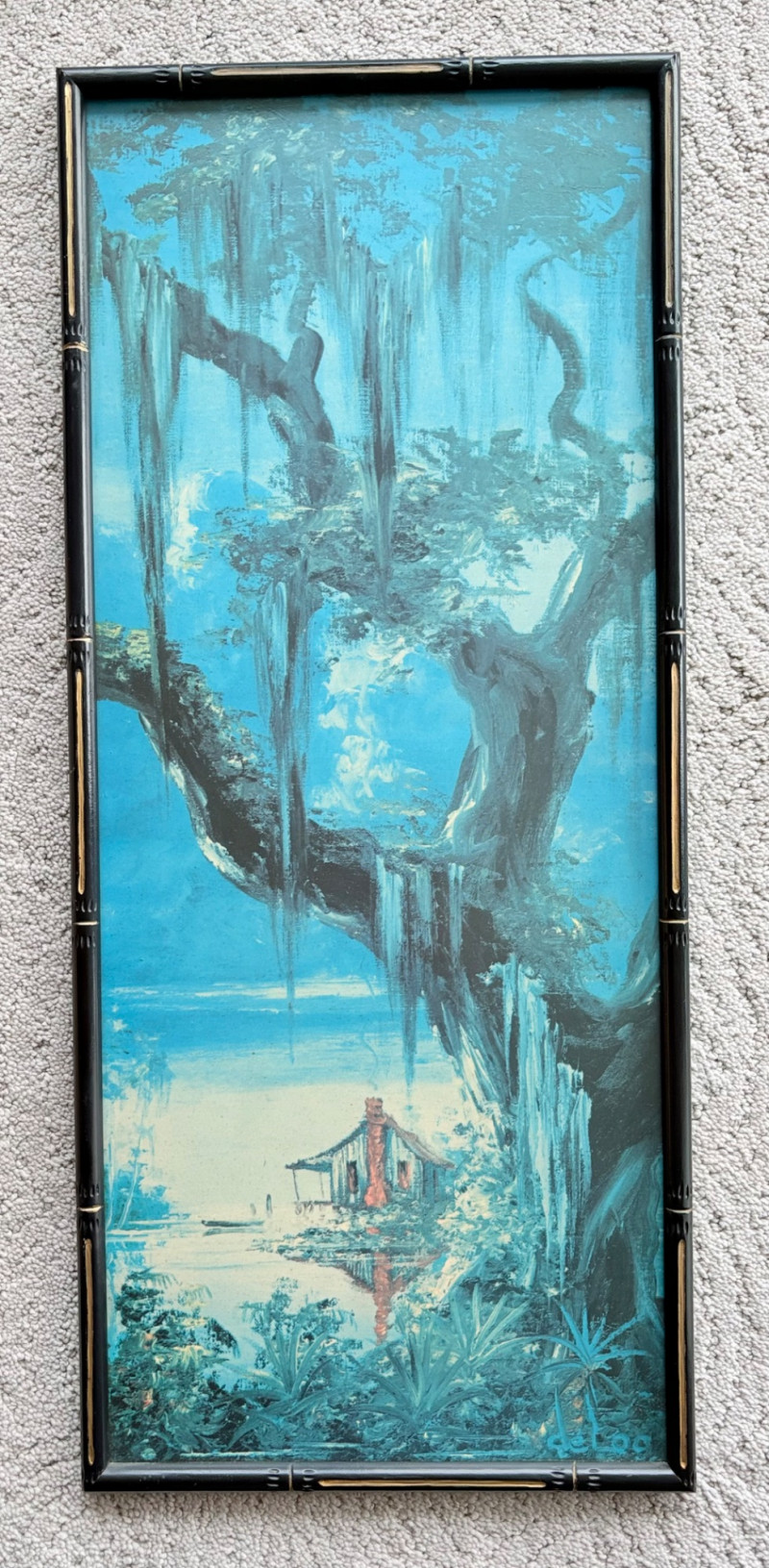 Terrific MCM pair of "swamp" prints by Margaret DeLoo in shades of teal with bursts of red/pink in the lower details (cabin & boater). Framed in a black pseudo-bamboo wood with gold painted highlights. In excellent vintage condition. Rear shows they were framed at the late, great Bon Marche (not sure if purchased there). Measure approx. 24.5" x 10.5" framed with cardboard backer board. Set of Two Margaret Deloo Framed Prints/margaret De Loo Swamp Scene Prints - Etsy note that this pair is considerably smaller than ours