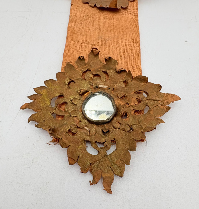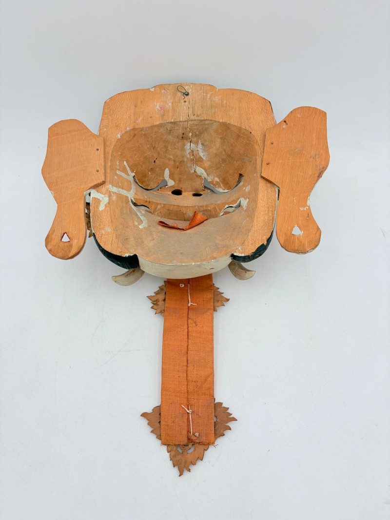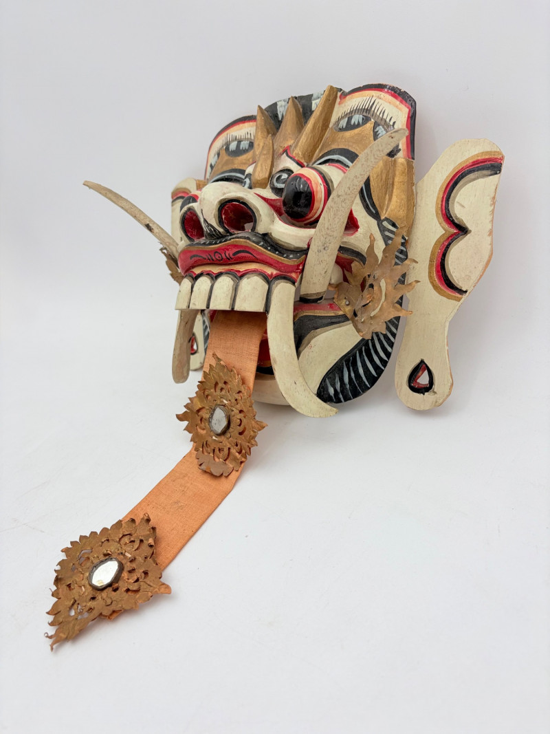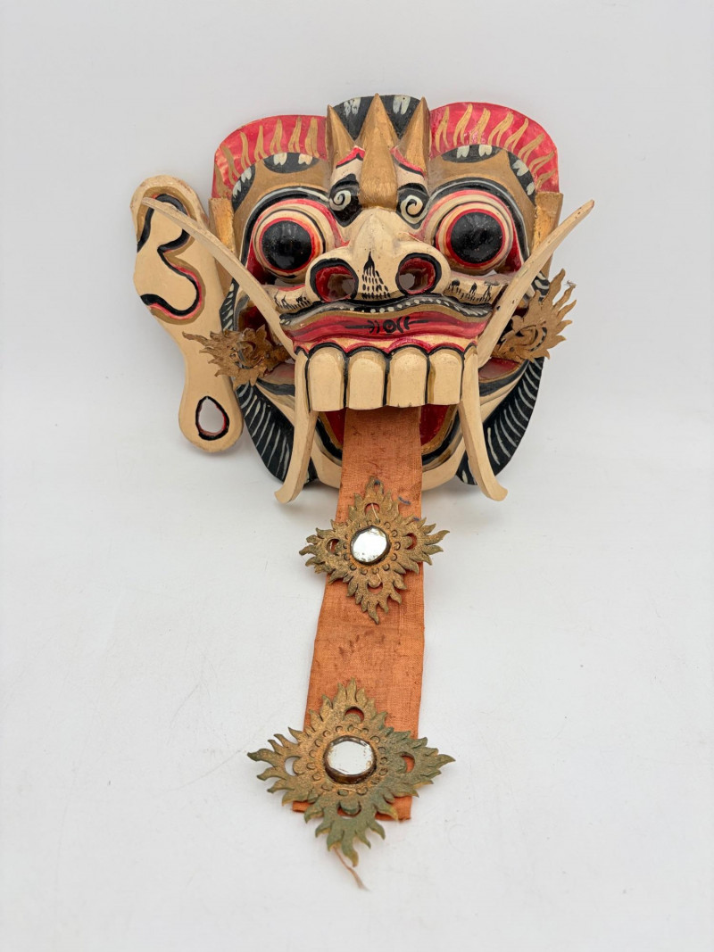 Really gorgeous vintage Rangda mask from Indonesia. Tusk-like upper and lower teeth, bulging eyes, and long mirrored tongue make this hand-carved wooden mask a real eye-catcher! In very good vintage condition with bright paint and all elements intact. Main part of mask is wood, but there also somewhat fragile gold paper, fabric, and mirrors in the mix. Could use a gentle cleaning to look its best since it's been hung up for many years & quite dusty. Measures 14" H including tongue x 12" W x 4" D. BONUS: we have a second Rangda mask. In the same condition as the previously described mask, but it's pulled a van Gogh and removed its left ear somewhere along life's journey.
