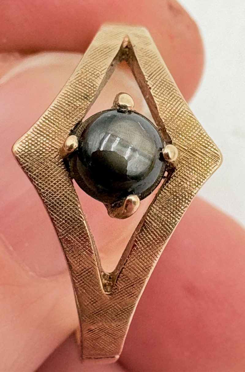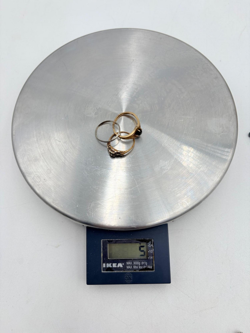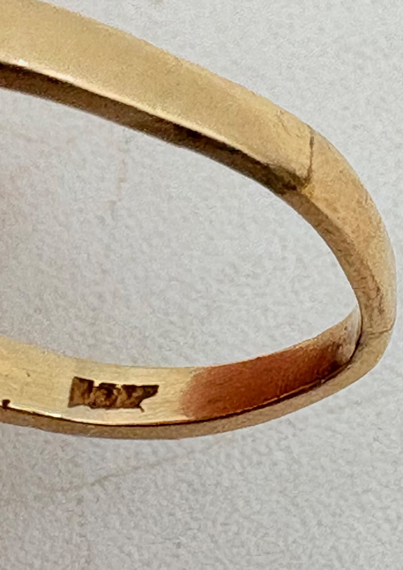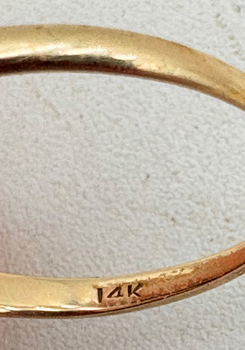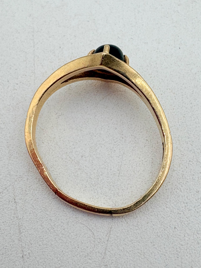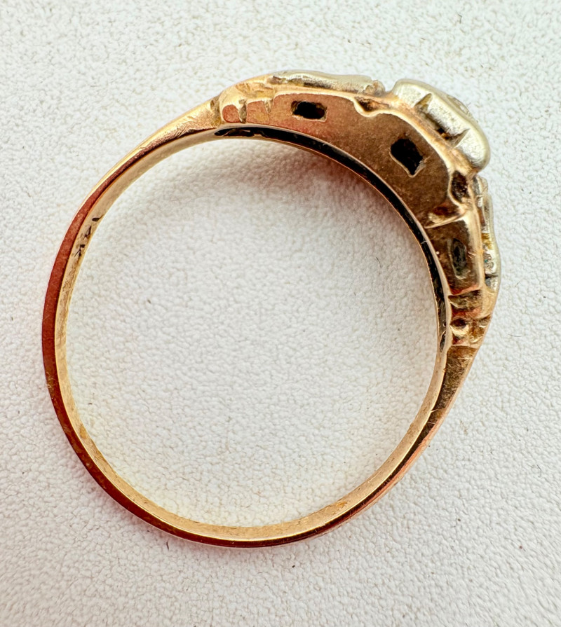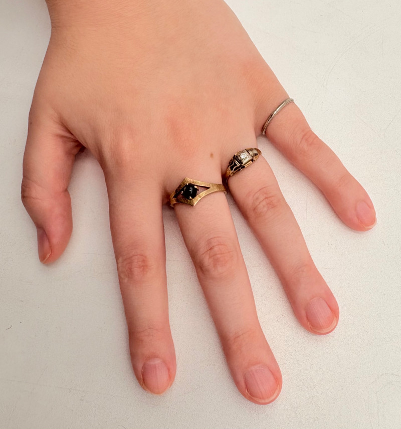 Three 14K gold rings for you to take a gander at: - Small ring with diamond (verified real by our jeweler) is marked 14K. - Slightly larger ring with black sapphire has a mark that is unreadable, but the sapphire and 14K gold content were verified by our jeweler. Please note that the ring has been bent and needs some repair to wear. - Simple vintage band with spare floral pattern is marked 14K gold. Total weight is 5 grams including stones.