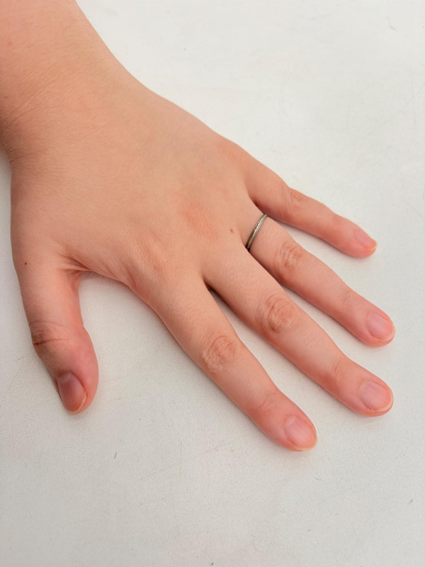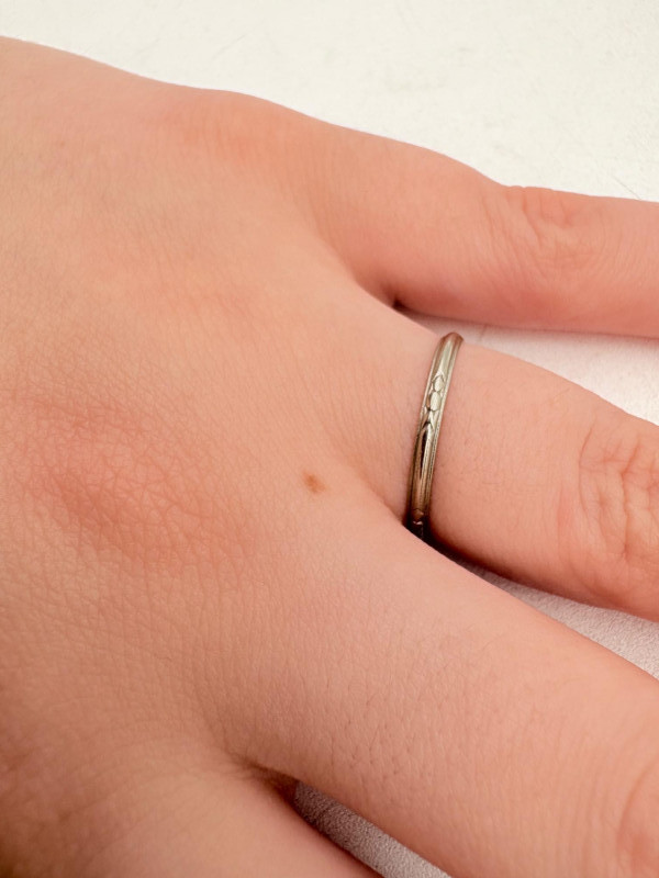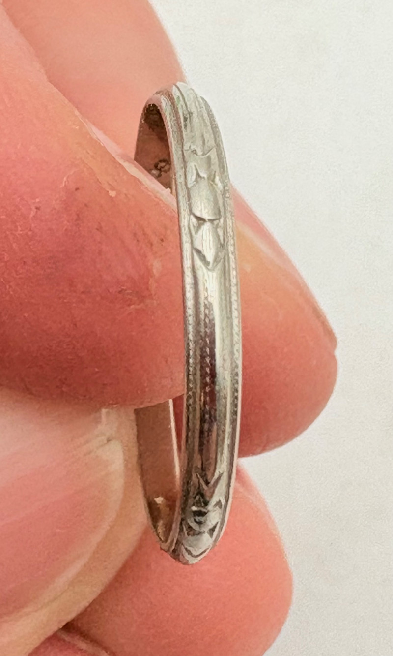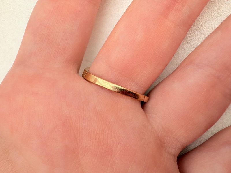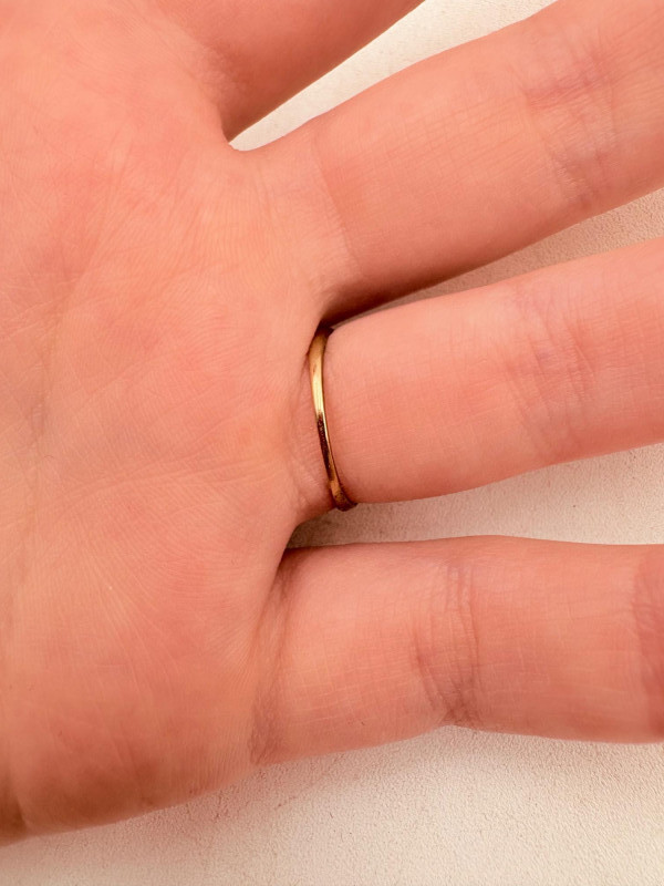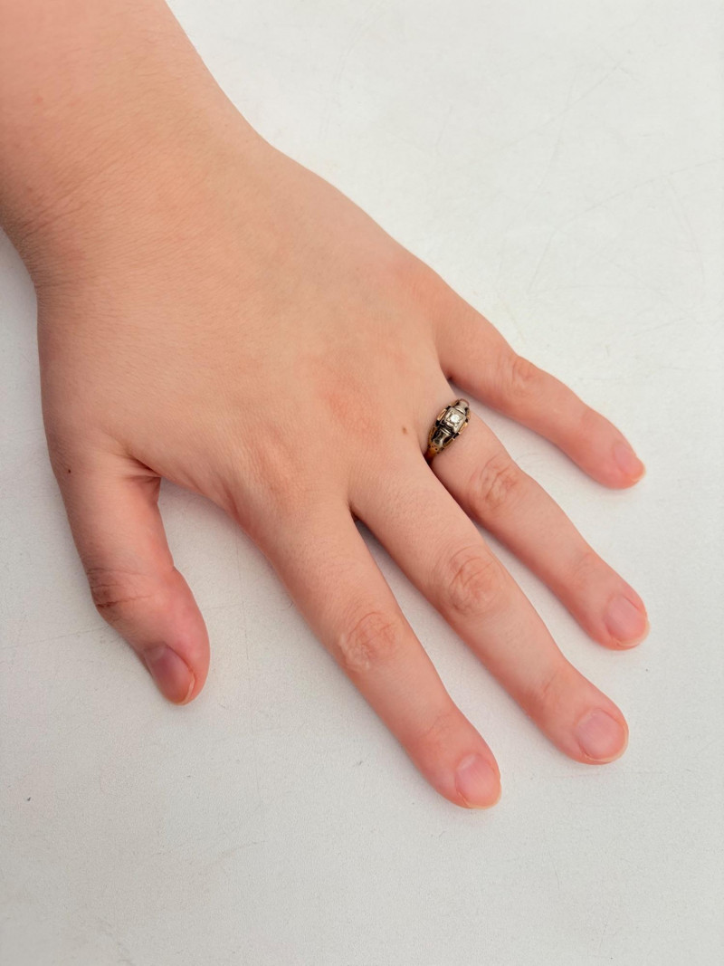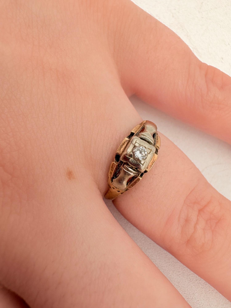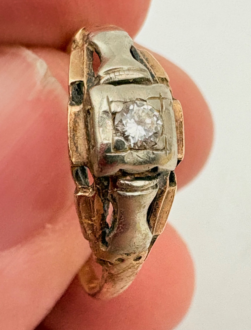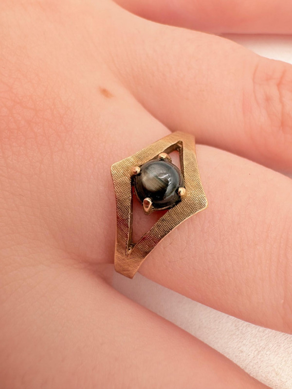Three 14K gold rings for you to take a gander at: - Small ring with diamond (verified real by our jeweler) is marked 14K. - Slightly larger ring with black sapphire has a mark that is unreadable, but the sapphire and 14K gold content were verified by our jeweler. Please note that the ring has been bent and needs some repair to wear. - Simple vintage band with spare floral pattern is marked 14K gold. Total weight is 5 grams including stones.