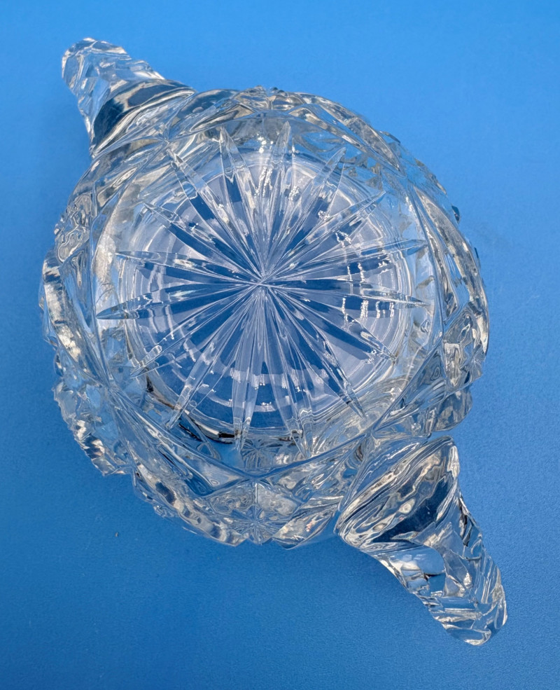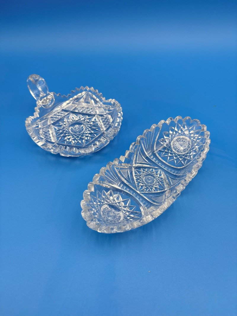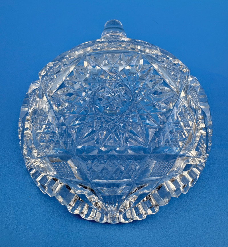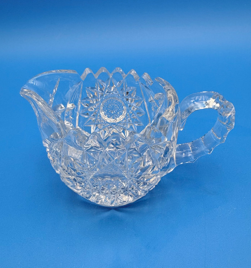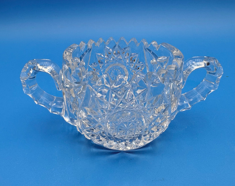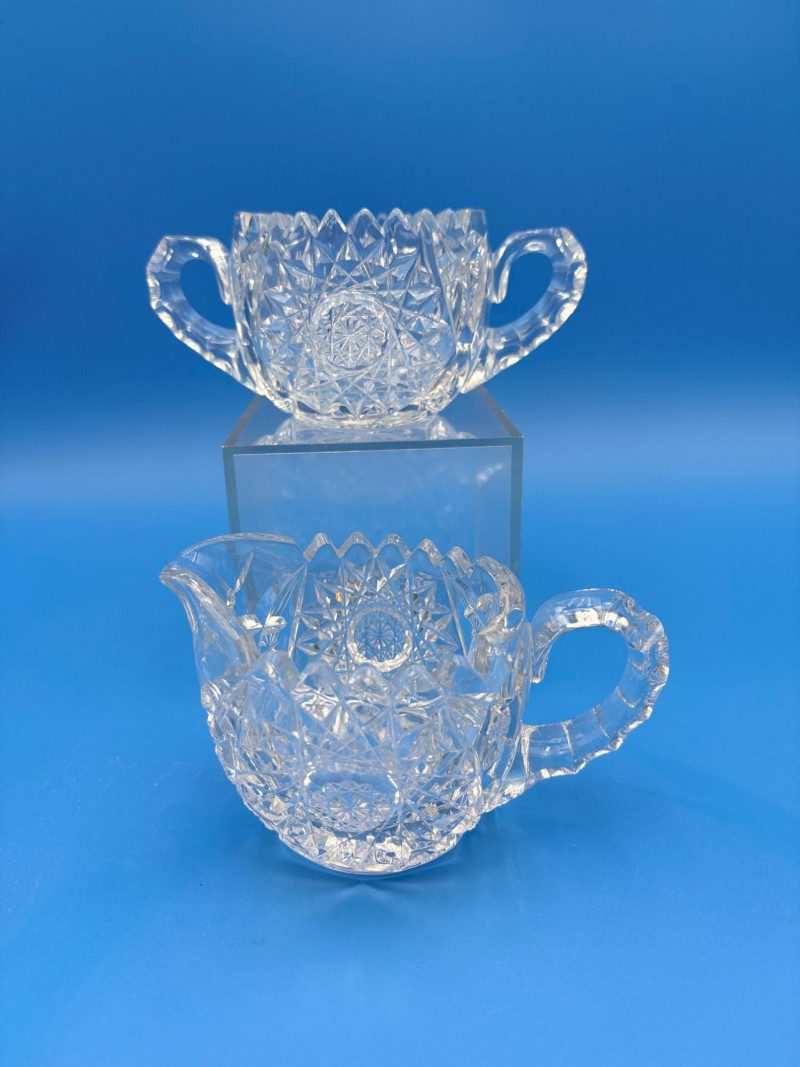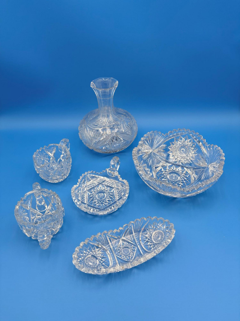 We believe these 6 pieces are American Brilliant Period crystal and are thus antique. They have that distinctive "ping" and are quite heavy with no noticeable flaws. Included in the lot are: Sugar bowl (3" H) Creamer (3" H) Serving bowl (8" W) Carafe (7" H x 7" W) Butter dish (3.25" W x 7.75" L) Handled small round dish (5" W)