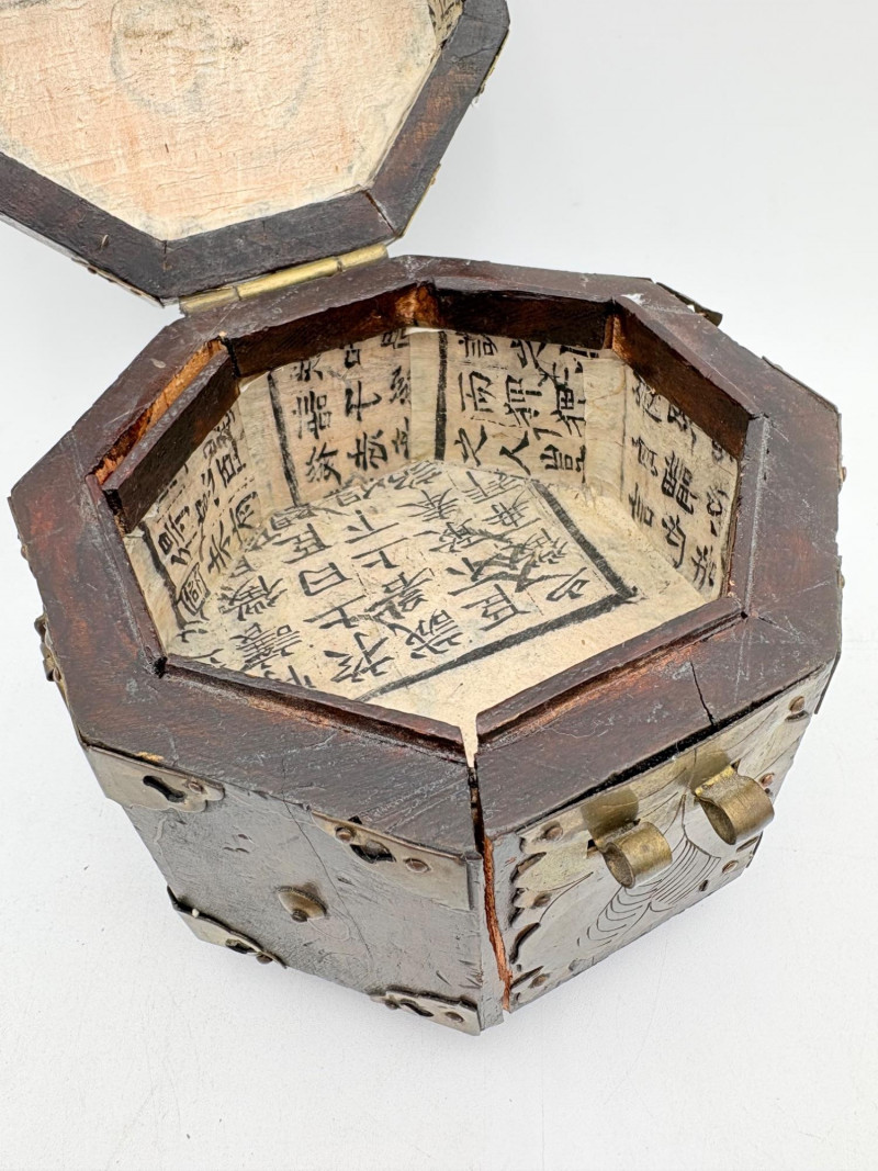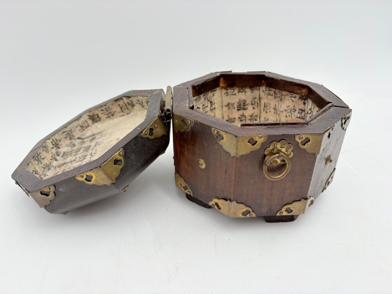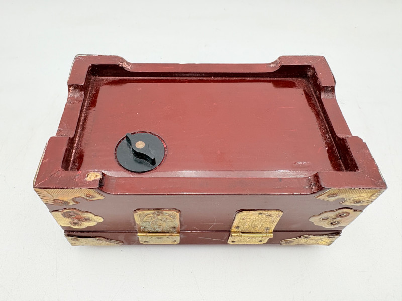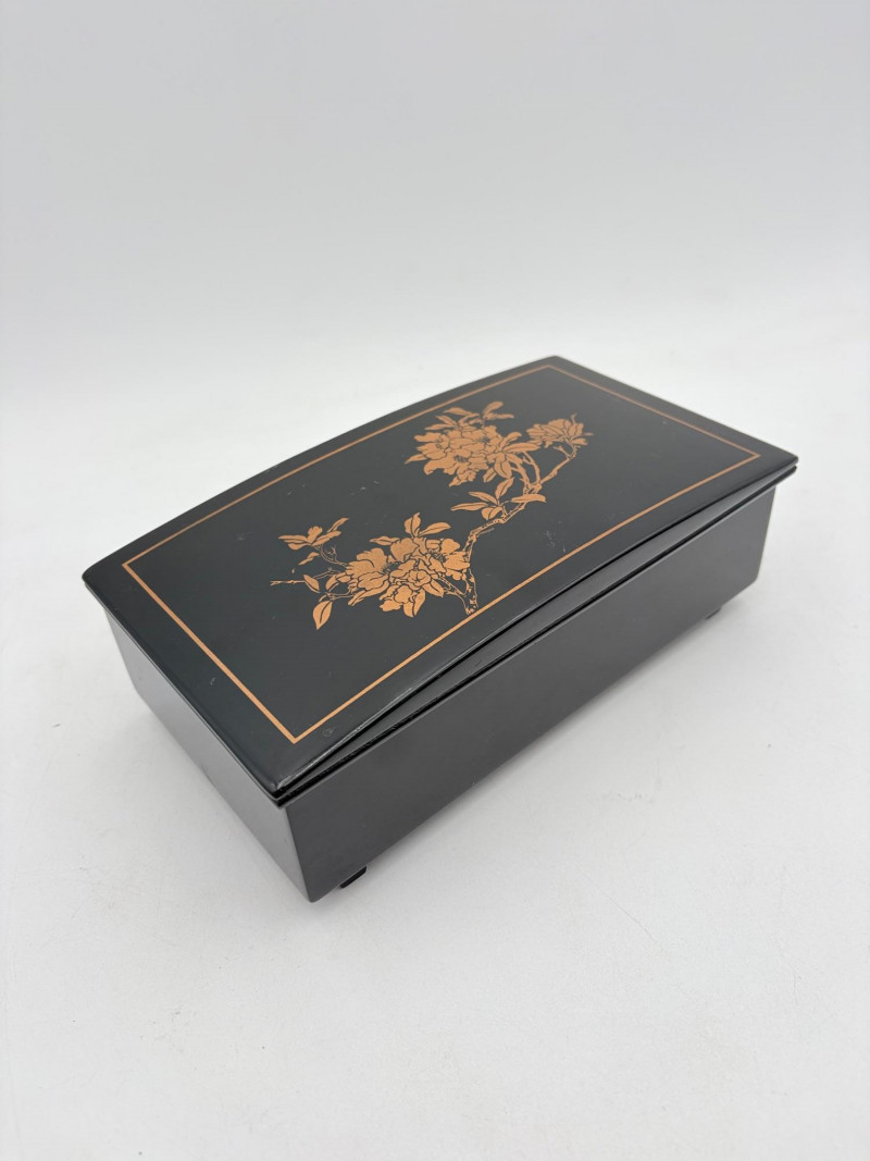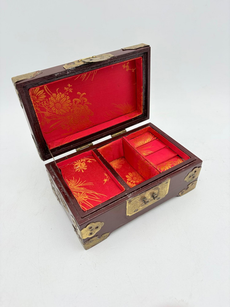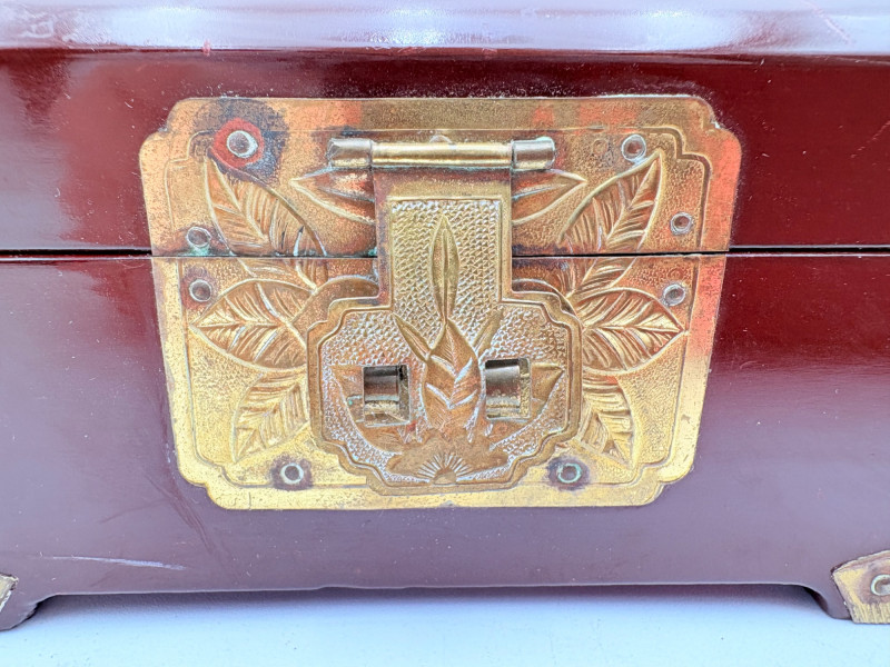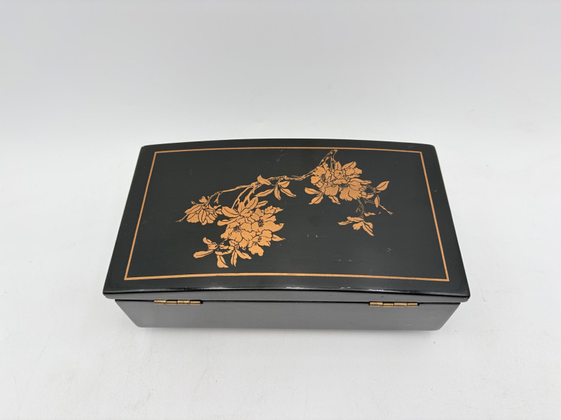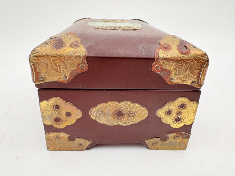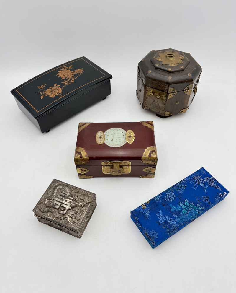 Assortment of jewelry/treasure boxes to hide your personal items away. All are vintage with two appearing to be quite old. Hexagonal box with lots of hardware appears to be quite old - it is wooden and lined with rice paper on the interior. Measures 5" H x 6" W. Note that one wooden piece on the interior is loose - and there is a split on one side, however, it still functions. See last photo. Black lacquered box is actually a musical jewelry box lined in red. Measures 3" H x 9" W x 5" D. Slight cosmetic smudges in places. (Plays a classic tune, but very slowly - need to wind completely up to play normally) Blue fabric-covered bracelet box has interior padding and is newer. Measures 1" H x 7" L x 2.75" D. Rectangular wooden box has brass hardware, is lined in fabric, and is a music box. Measures 3" H x 6.5" L x 4" D. (Plays "Oh Susannah") Smaller rectangular metal box appears to be quite old - dragon motif on top and lined with wood. Made in Japan. Measures 1.75" H x 3.5" L x 3" D. Showing age with slightly wobbly hinges & looseness on interior.