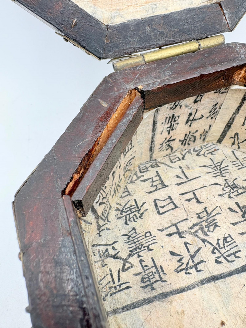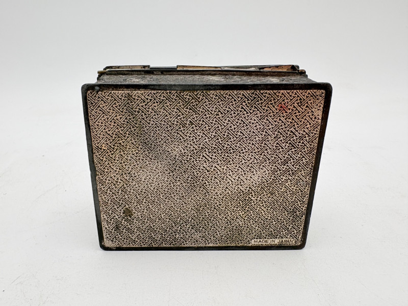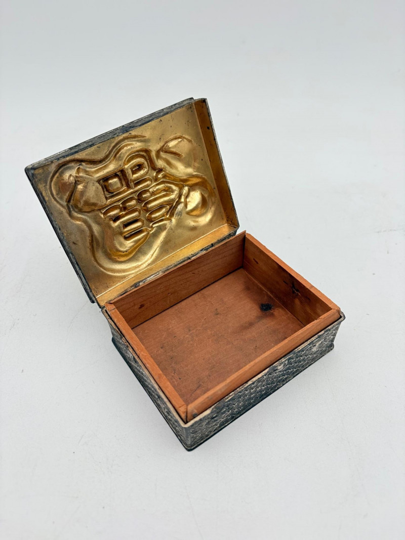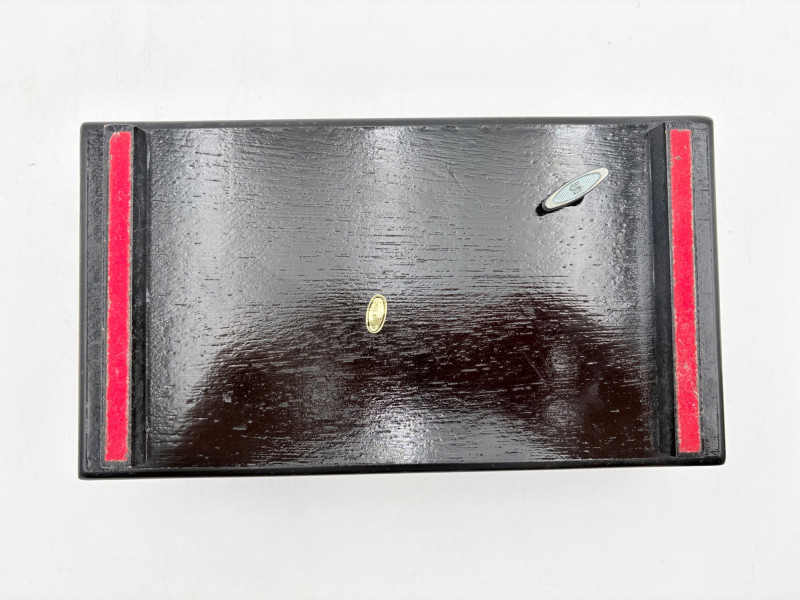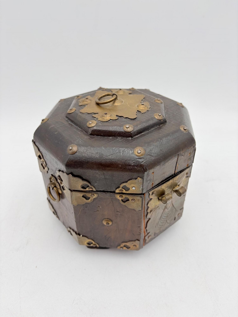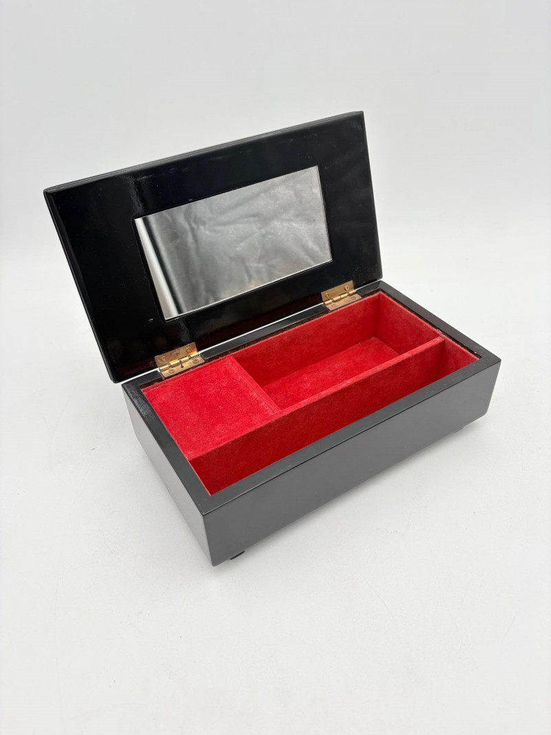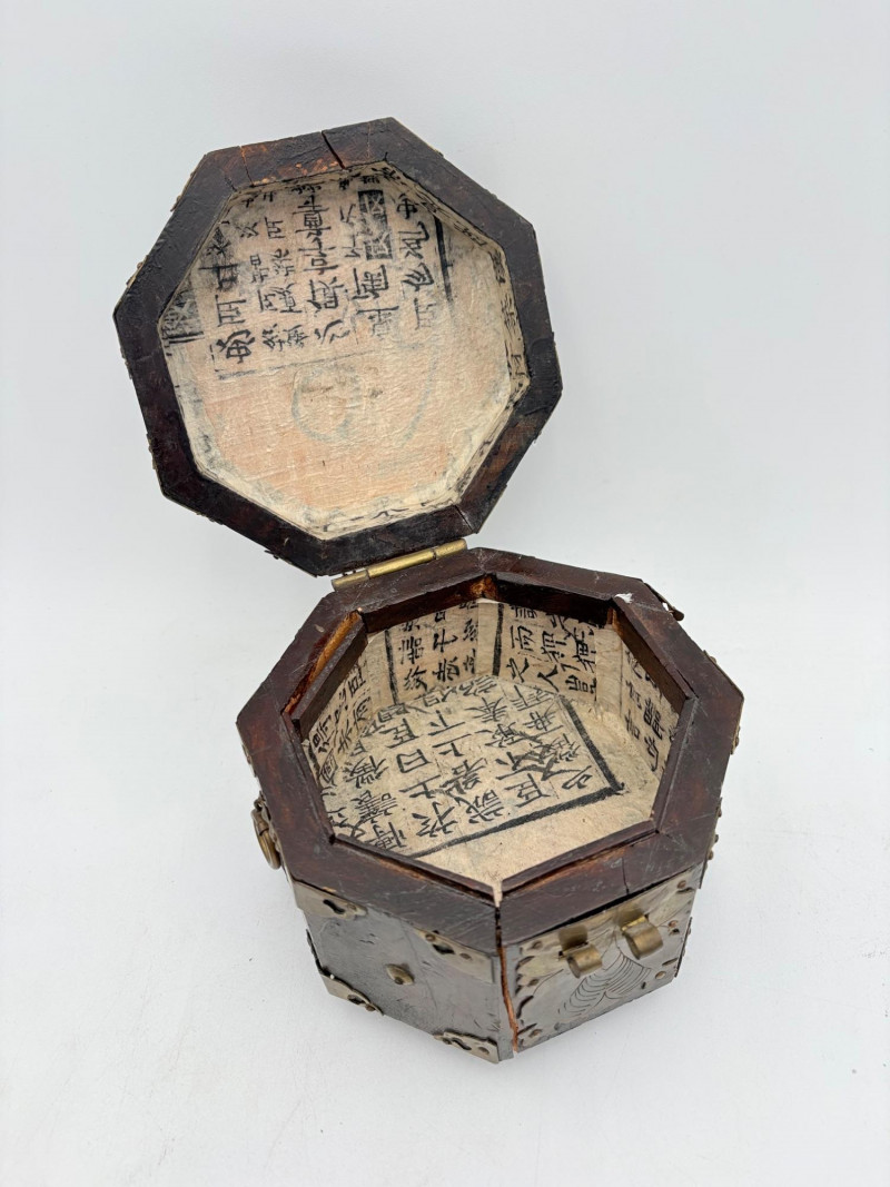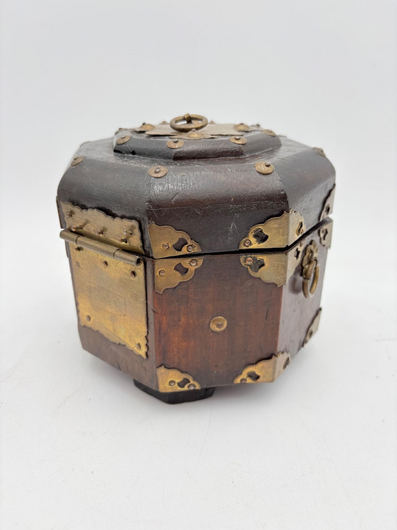 Assortment of jewelry/treasure boxes to hide your personal items away. All are vintage with two appearing to be quite old. Hexagonal box with lots of hardware appears to be quite old - it is wooden and lined with rice paper on the interior. Measures 5" H x 6" W. Note that one wooden piece on the interior is loose - and there is a split on one side, however, it still functions. See last photo. Black lacquered box is actually a musical jewelry box lined in red. Measures 3" H x 9" W x 5" D. Slight cosmetic smudges in places. (Plays a classic tune, but very slowly - need to wind completely up to play normally) Blue fabric-covered bracelet box has interior padding and is newer. Measures 1" H x 7" L x 2.75" D. Rectangular wooden box has brass hardware, is lined in fabric, and is a music box. Measures 3" H x 6.5" L x 4" D. (Plays "Oh Susannah") Smaller rectangular metal box appears to be quite old - dragon motif on top and lined with wood. Made in Japan. Measures 1.75" H x 3.5" L x 3" D. Showing age with slightly wobbly hinges & looseness on interior.