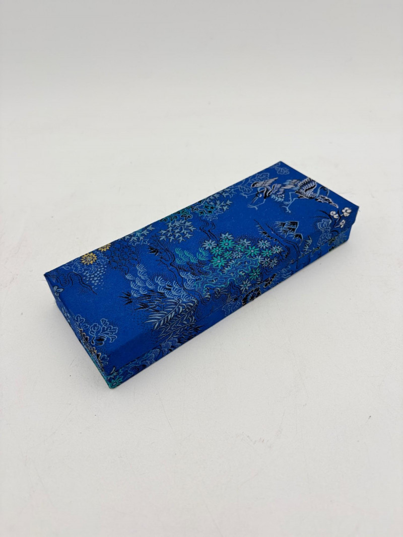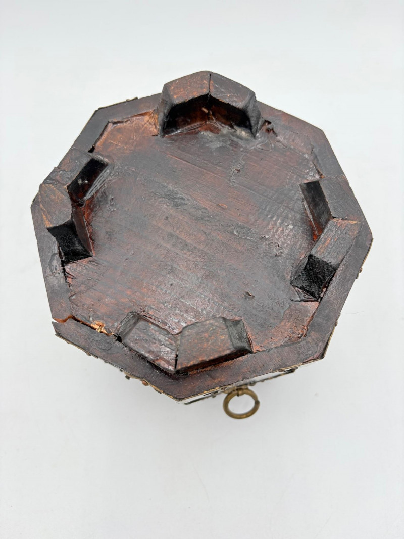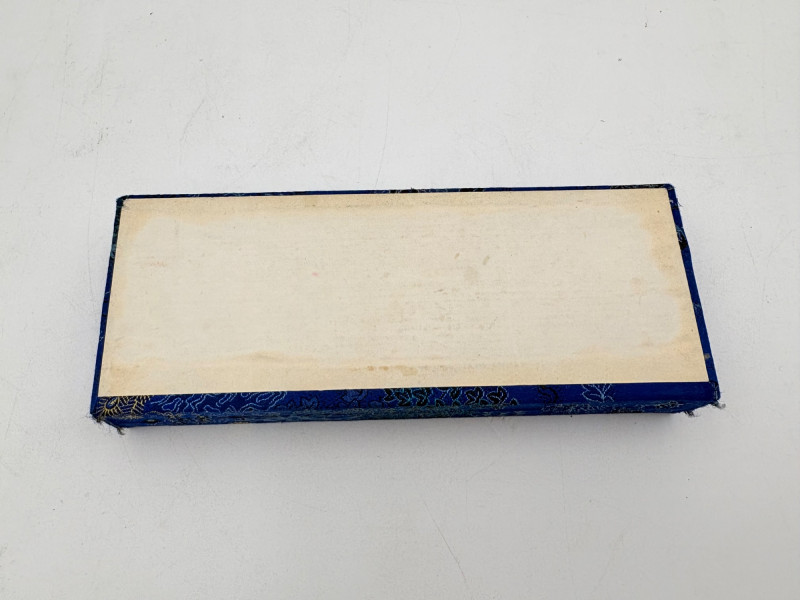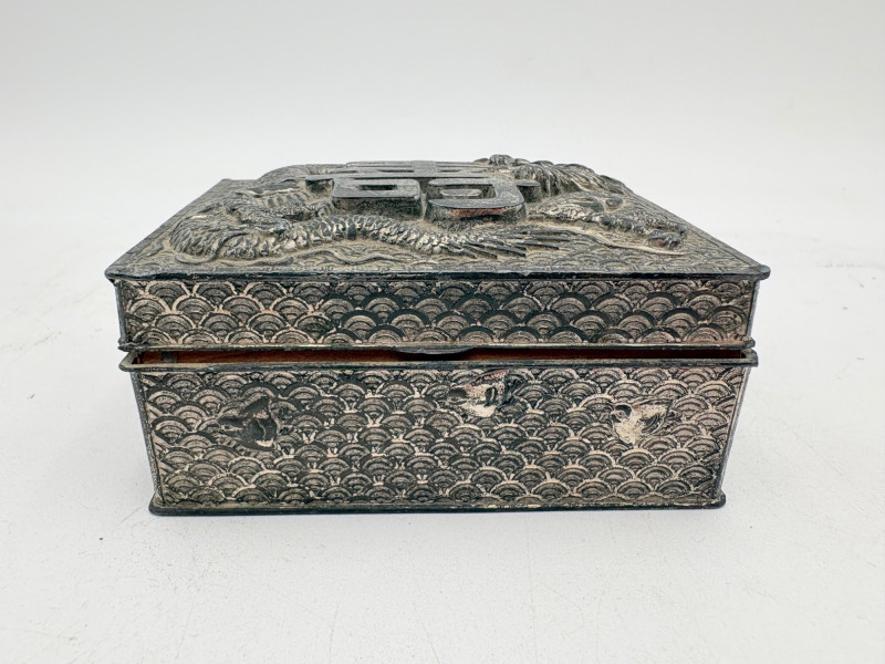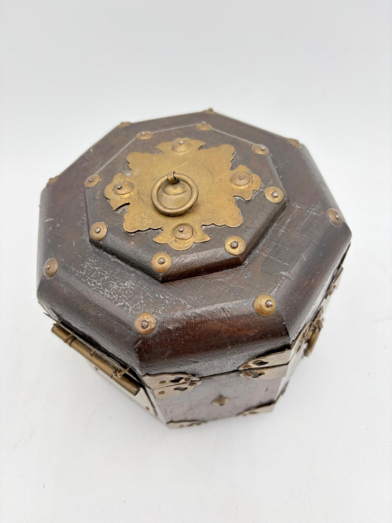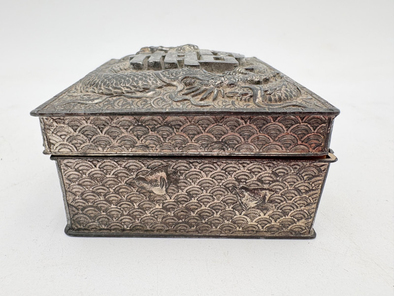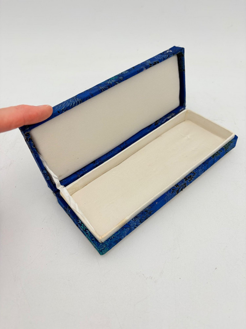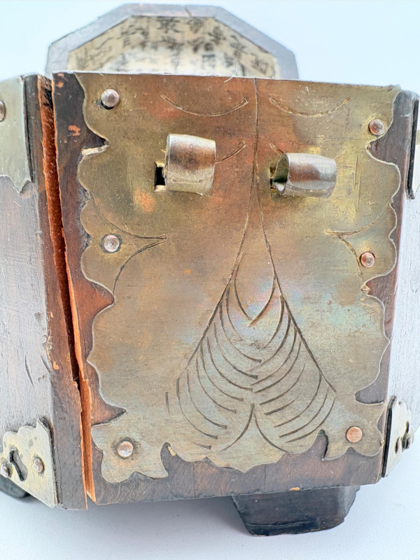 Assortment of jewelry/treasure boxes to hide your personal items away. All are vintage with two appearing to be quite old. Hexagonal box with lots of hardware appears to be quite old - it is wooden and lined with rice paper on the interior. Measures 5" H x 6" W. Note that one wooden piece on the interior is loose - and there is a split on one side, however, it still functions. See last photo. Black lacquered box is actually a musical jewelry box lined in red. Measures 3" H x 9" W x 5" D. Slight cosmetic smudges in places. (Plays a classic tune, but very slowly - need to wind completely up to play normally) Blue fabric-covered bracelet box has interior padding and is newer. Measures 1" H x 7" L x 2.75" D. Rectangular wooden box has brass hardware, is lined in fabric, and is a music box. Measures 3" H x 6.5" L x 4" D. (Plays "Oh Susannah") Smaller rectangular metal box appears to be quite old - dragon motif on top and lined with wood. Made in Japan. Measures 1.75" H x 3.5" L x 3" D. Showing age with slightly wobbly hinges & looseness on interior.