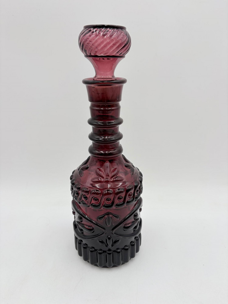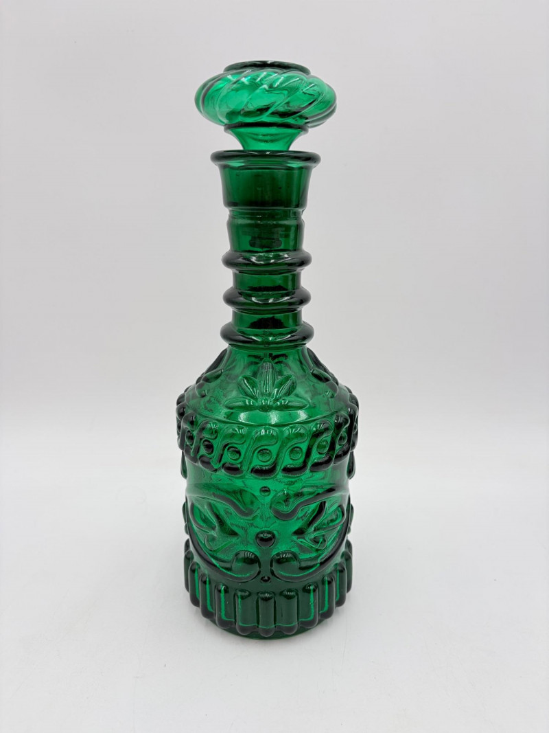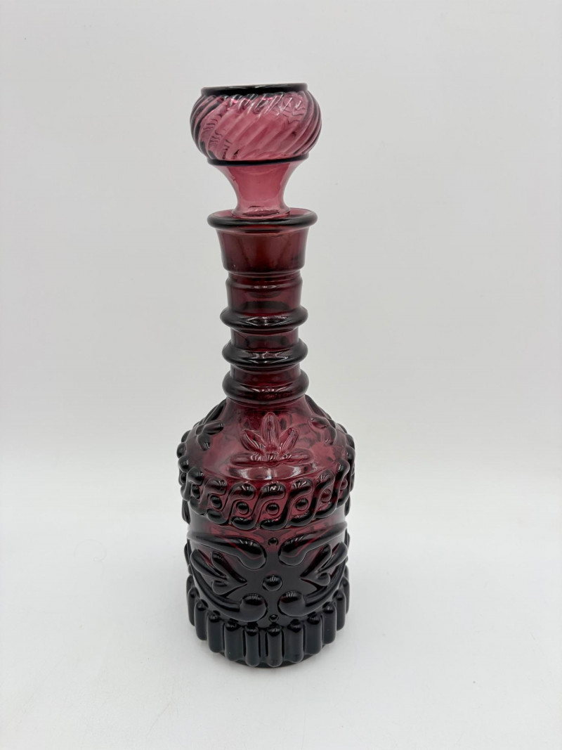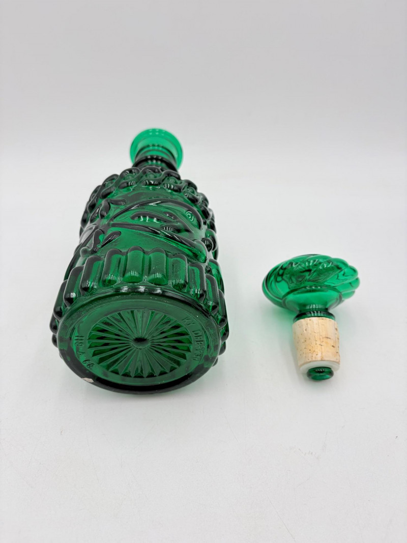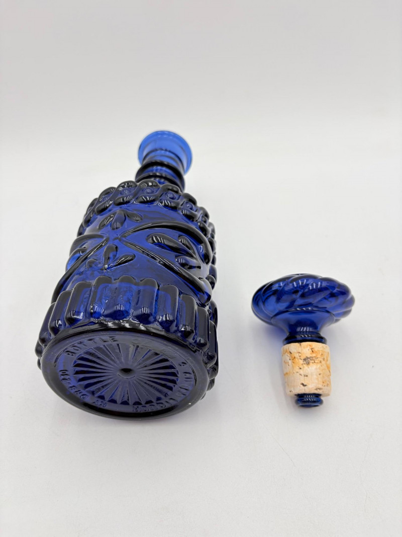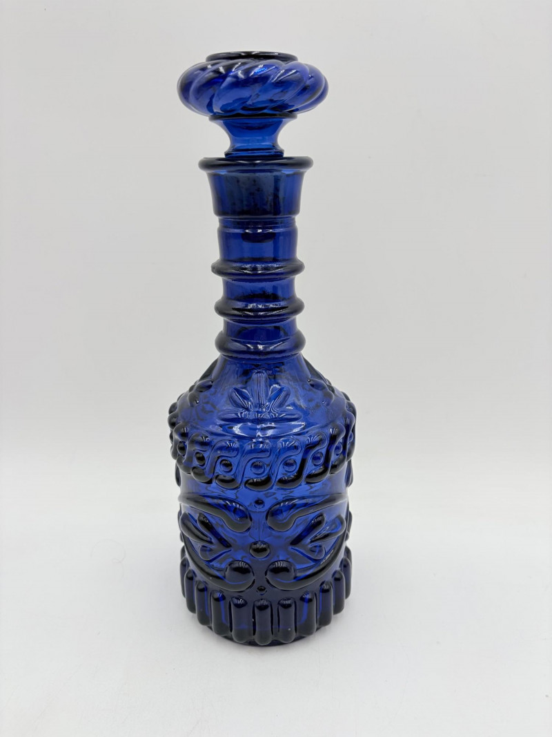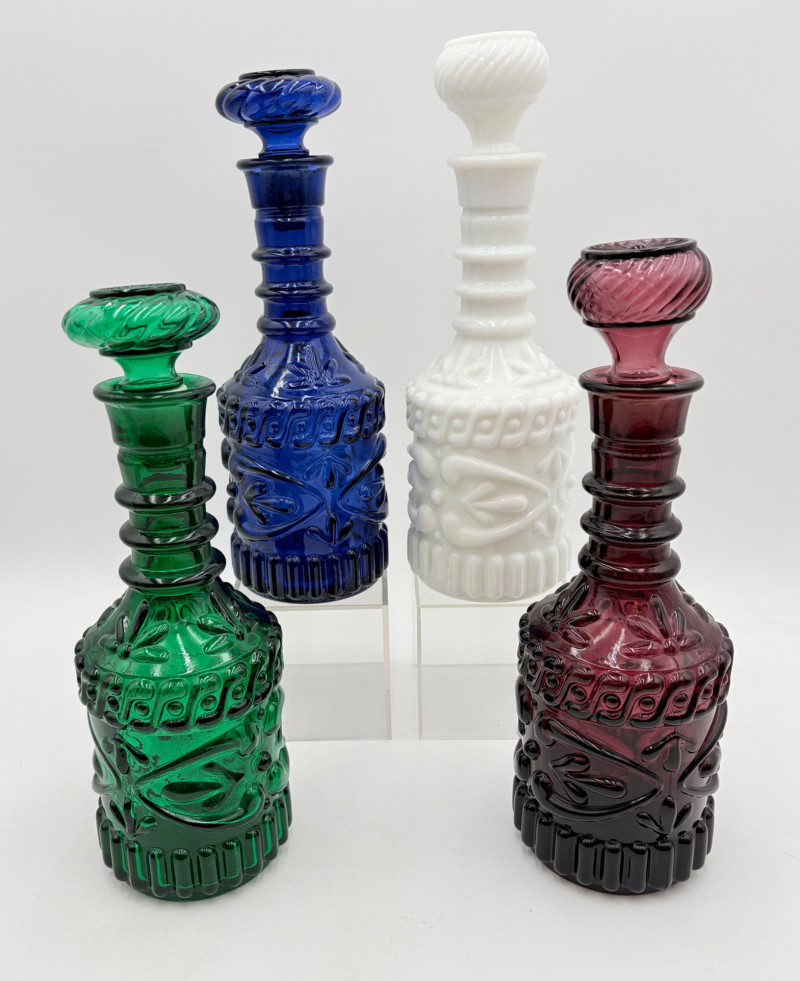 4 heavy relief glass decanters with cork stoppers. In blue, green, white, and purple. All in great shape with no noticeable chips or cracks. While all are identical in design on the body, two different stopper designs. All measure 12" H x 4" W.