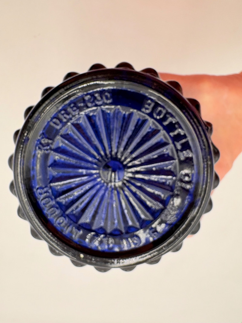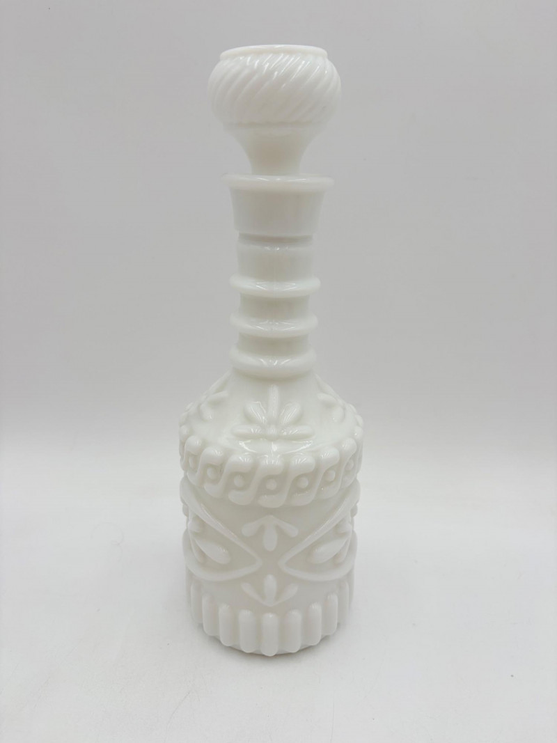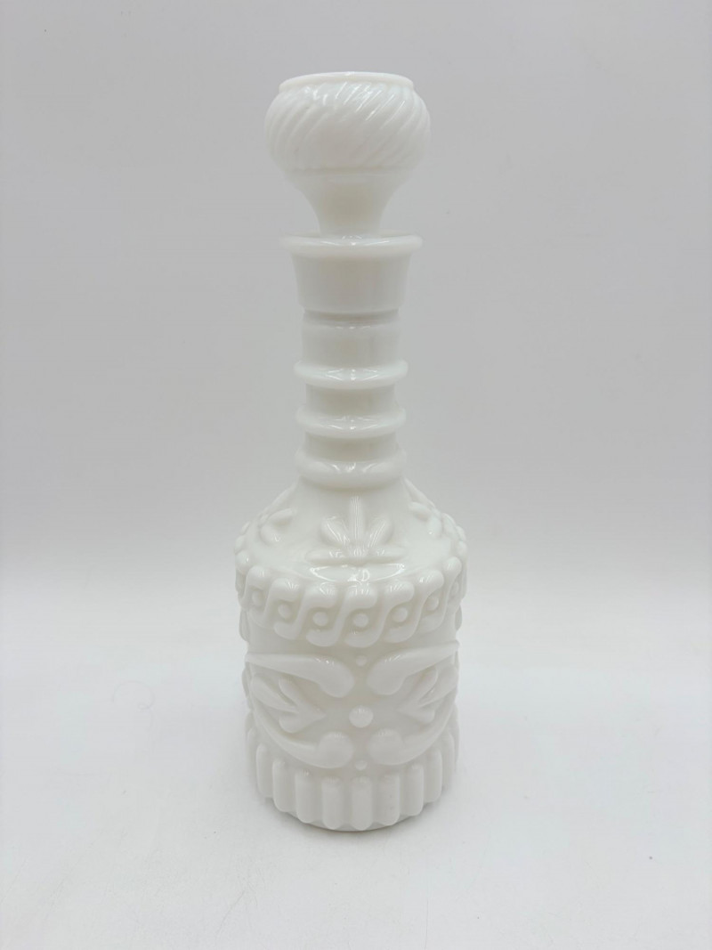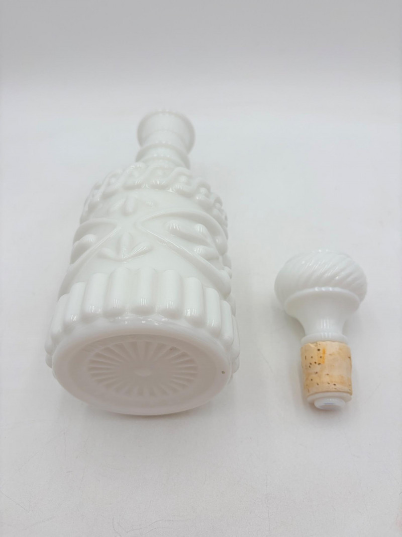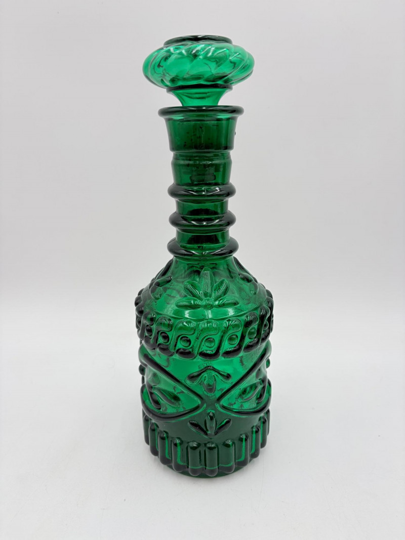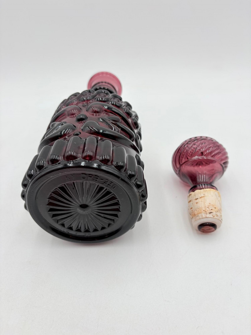 4 heavy relief glass decanters with cork stoppers. In blue, green, white, and purple. All in great shape with no noticeable chips or cracks. While all are identical in design on the body, two different stopper designs. All measure 12" H x 4" W.