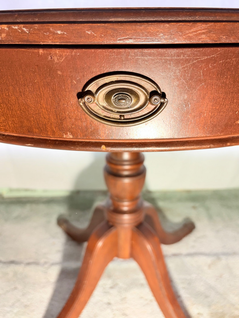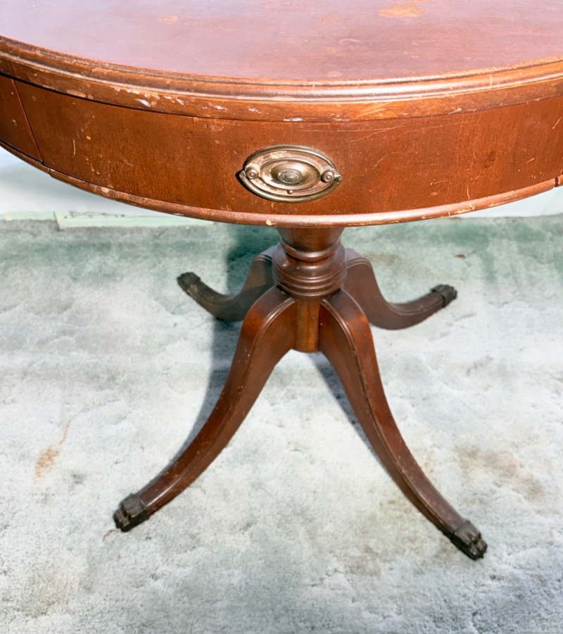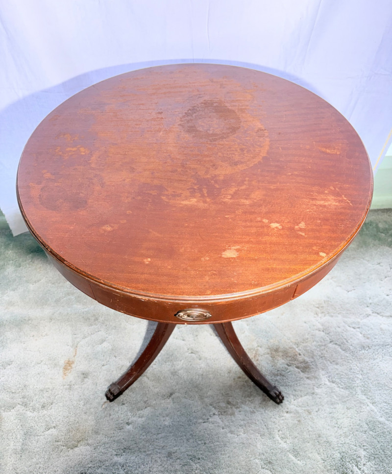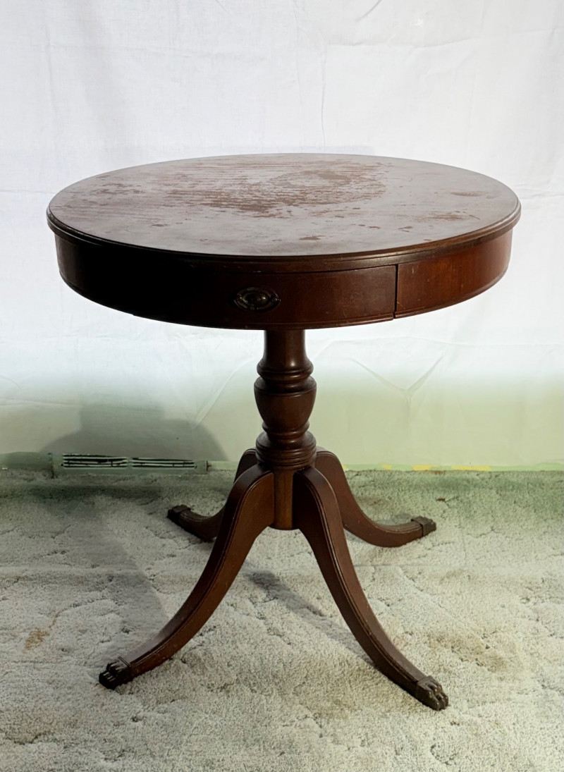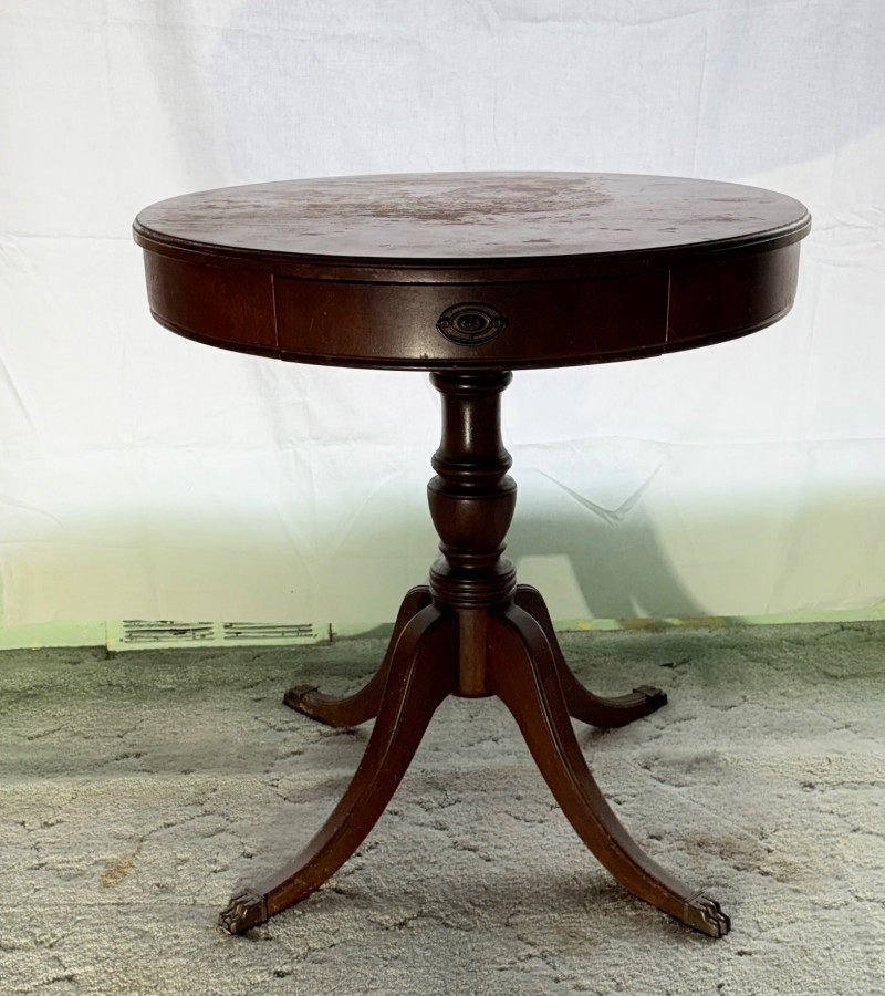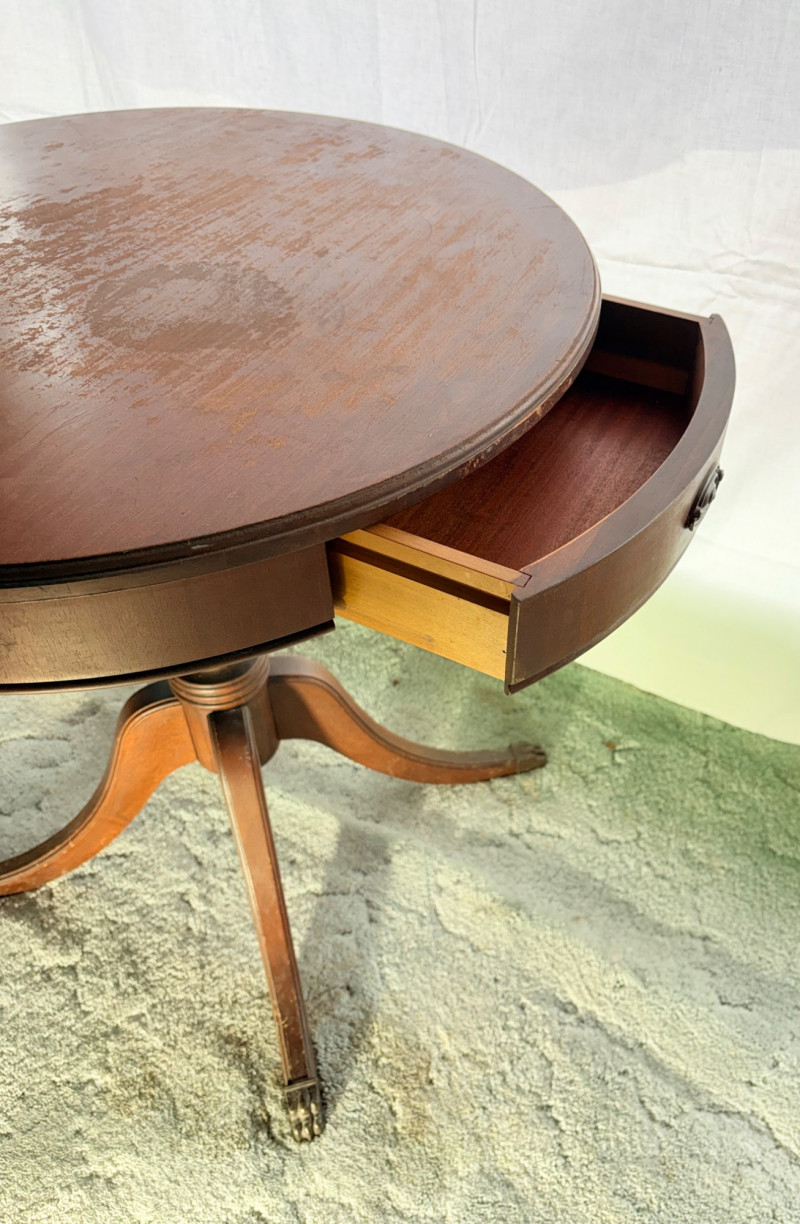Classic round drum table in the Duncan Phyfe style (lead photos are truer to the color - deep brown-black) Two drawers (front and back) with brass hardware pulls and brass foot caps with claws. Solidly built with only cosmetic wear on the surfaces; no major dents or deep divots. While it would greatly benefit from a good scrub and a refinish, it is useable now with a tablecloth if the wear on the top surface bothers you. Measures approx. 29" H x 28" diameter.