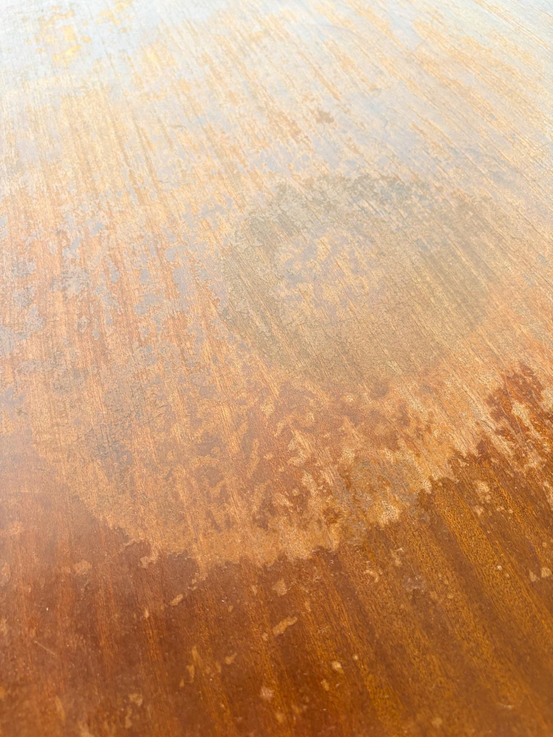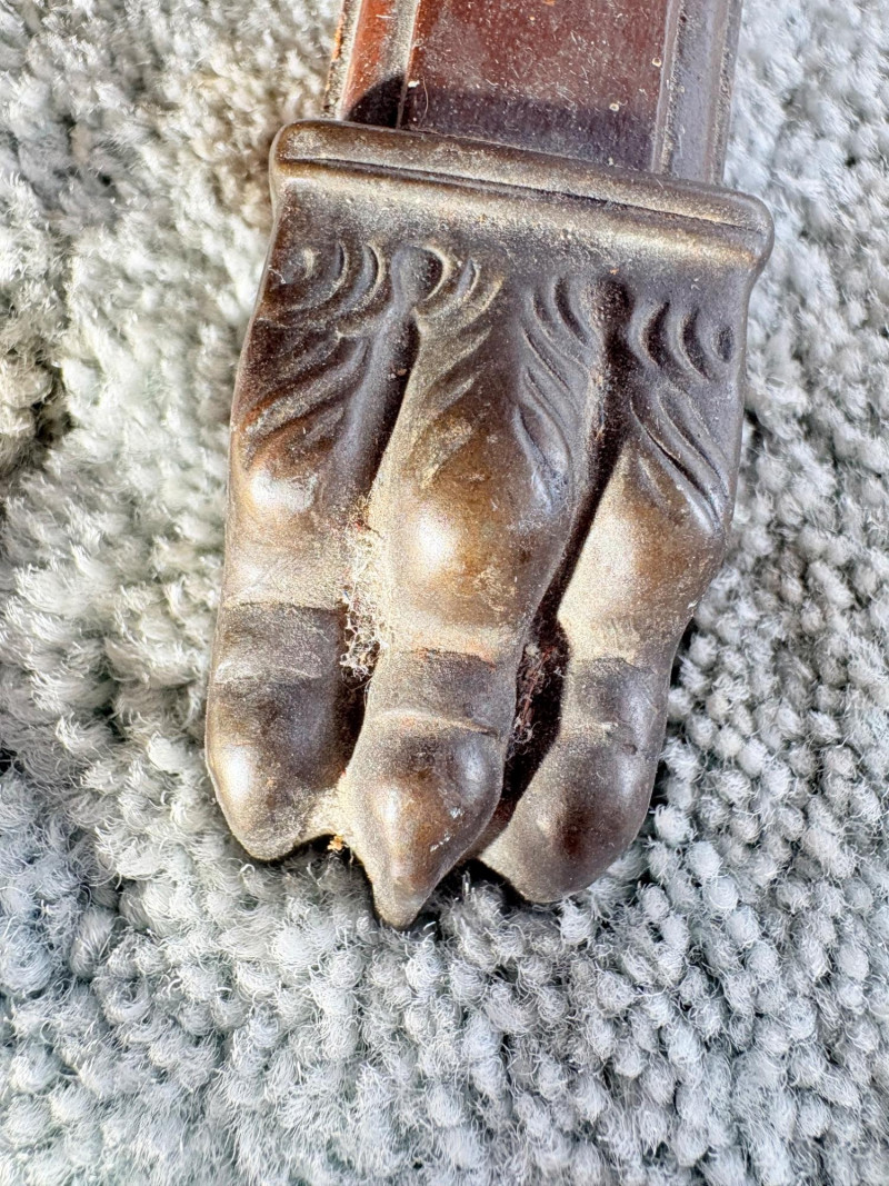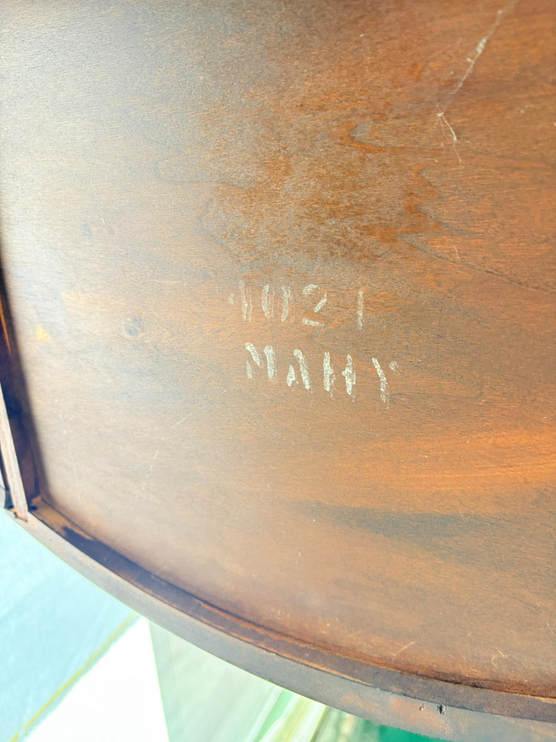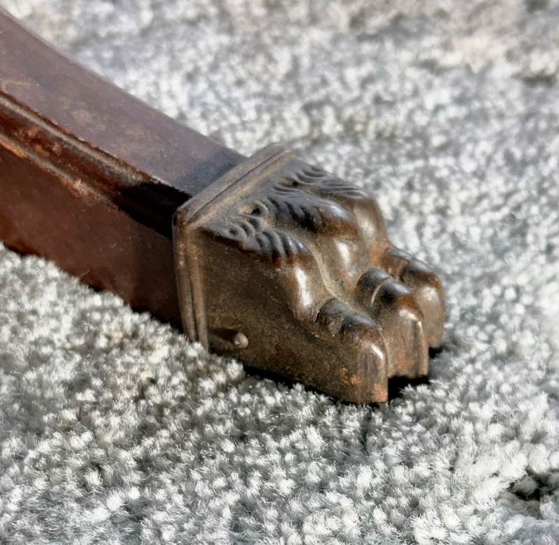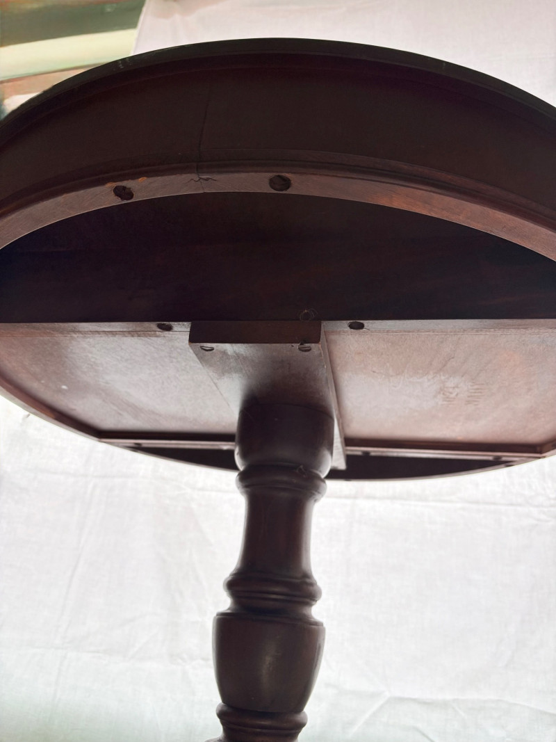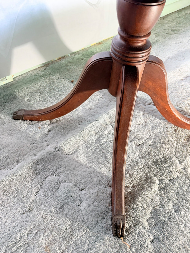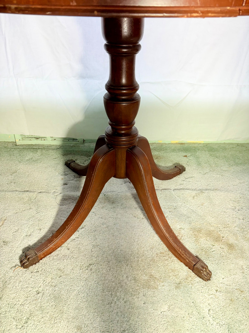 Classic round drum table in the Duncan Phyfe style (lead photos are truer to the color - deep brown-black) Two drawers (front and back) with brass hardware pulls and brass foot caps with claws. Solidly built with only cosmetic wear on the surfaces; no major dents or deep divots. While it would greatly benefit from a good scrub and a refinish, it is useable now with a tablecloth if the wear on the top surface bothers you. Measures approx. 29" H x 28" diameter.