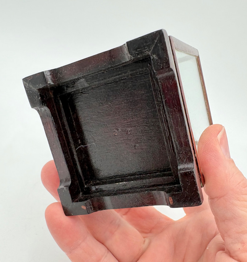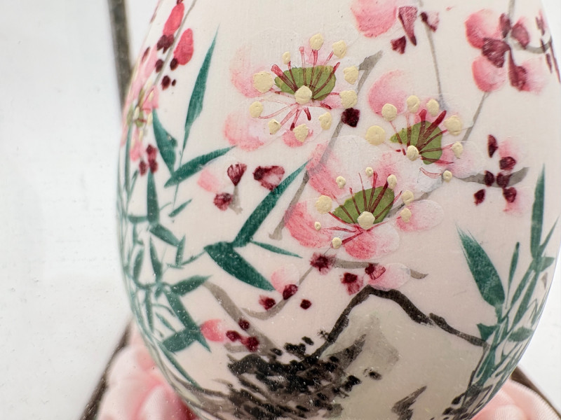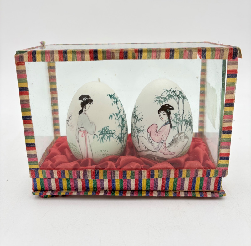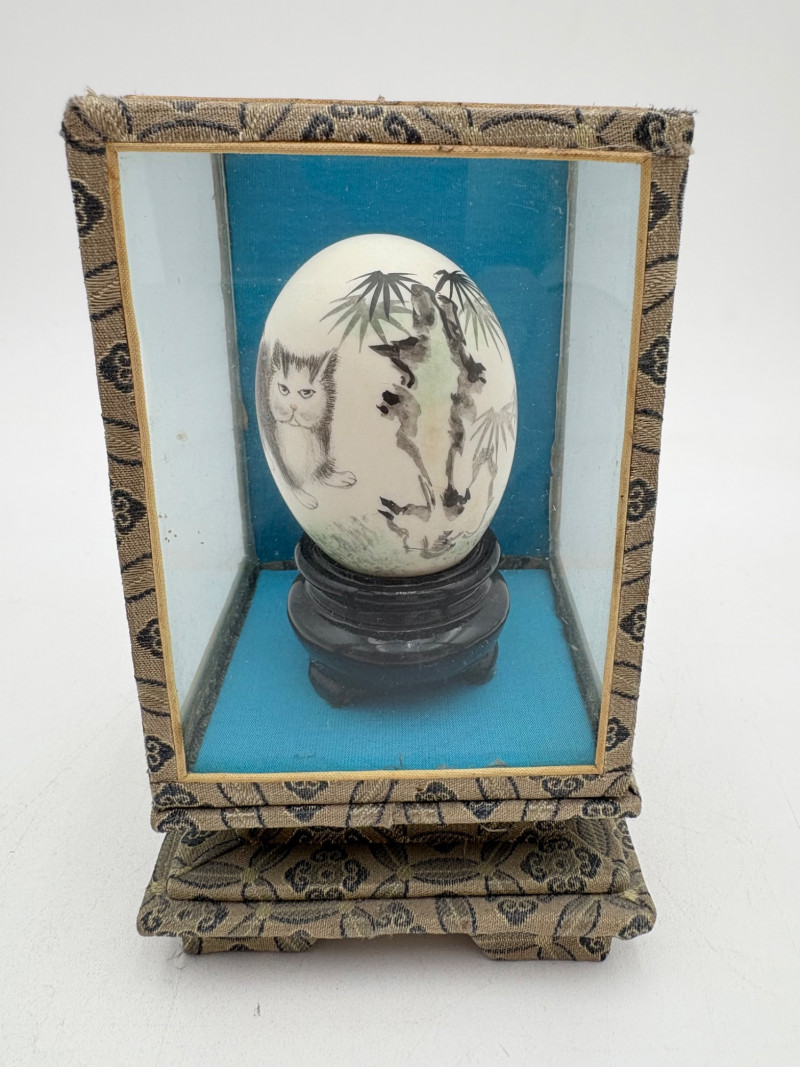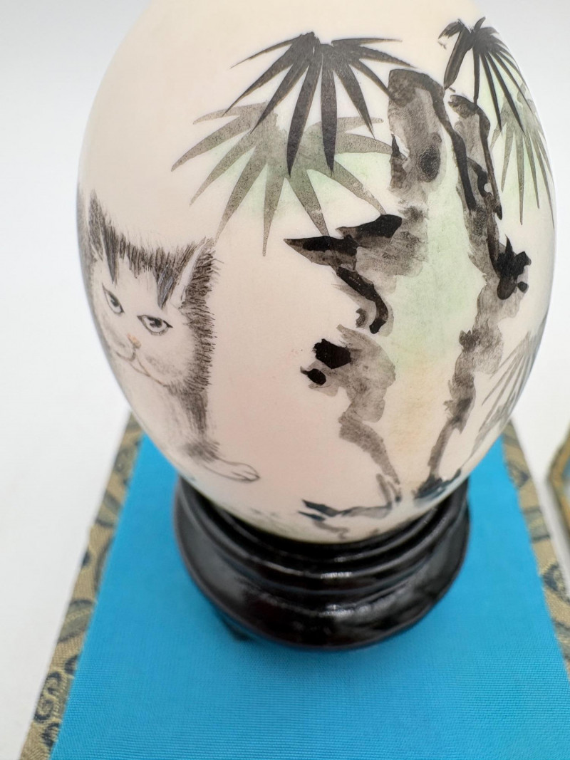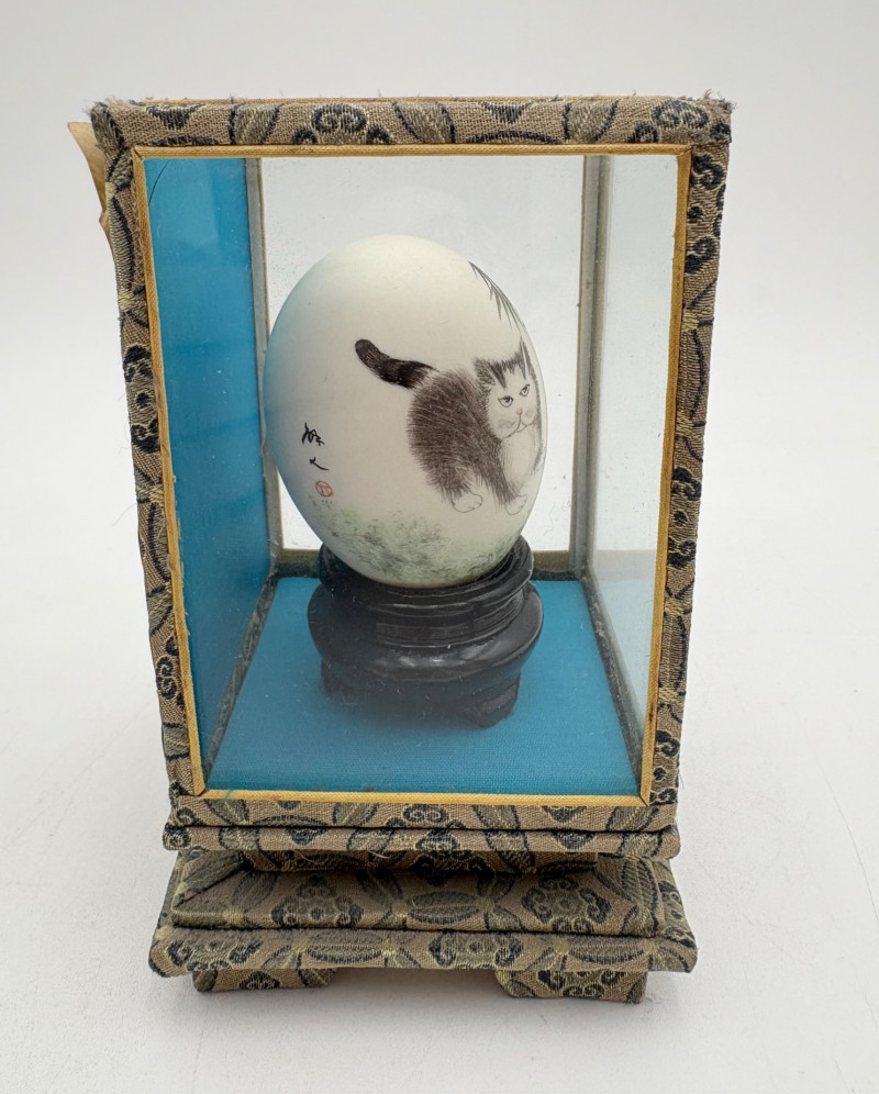 We believe these 5 elegant hand-painted eggshells are vintage from China. The brushwork on these is fabulous! Flower motifs, women, and cats are the dominant themes. Painted on actual eggshells, the works are very fragile but display beautifully. While the cases are ok, two of the three cases are a bit worse for wear. If these were ours, we would remove the eggshells from the cases and display them all together in a single shadow case where artisans' handiwork would play off one another. (The impact of a group would be more substantial, and a new case would protect the eggs better than the current ones). Painted