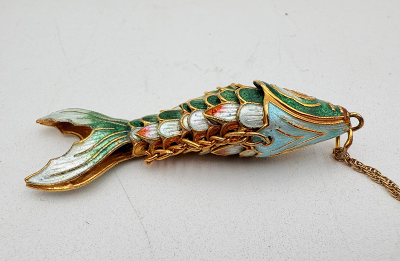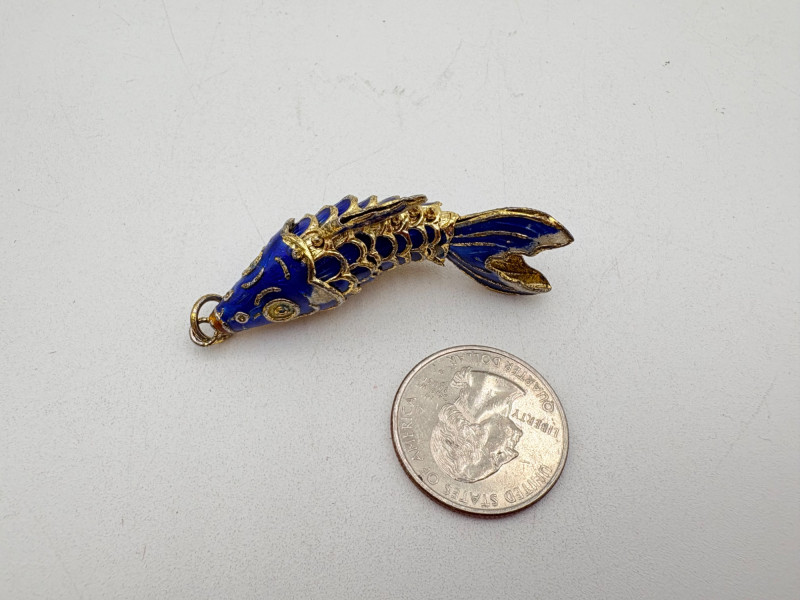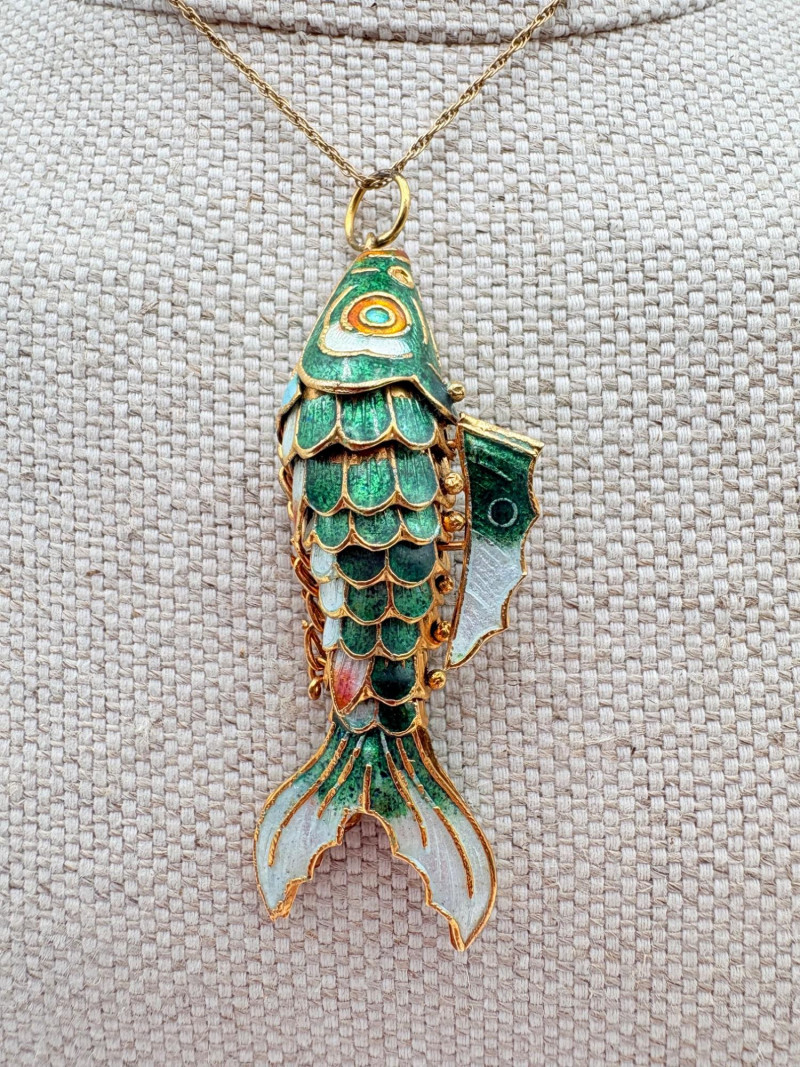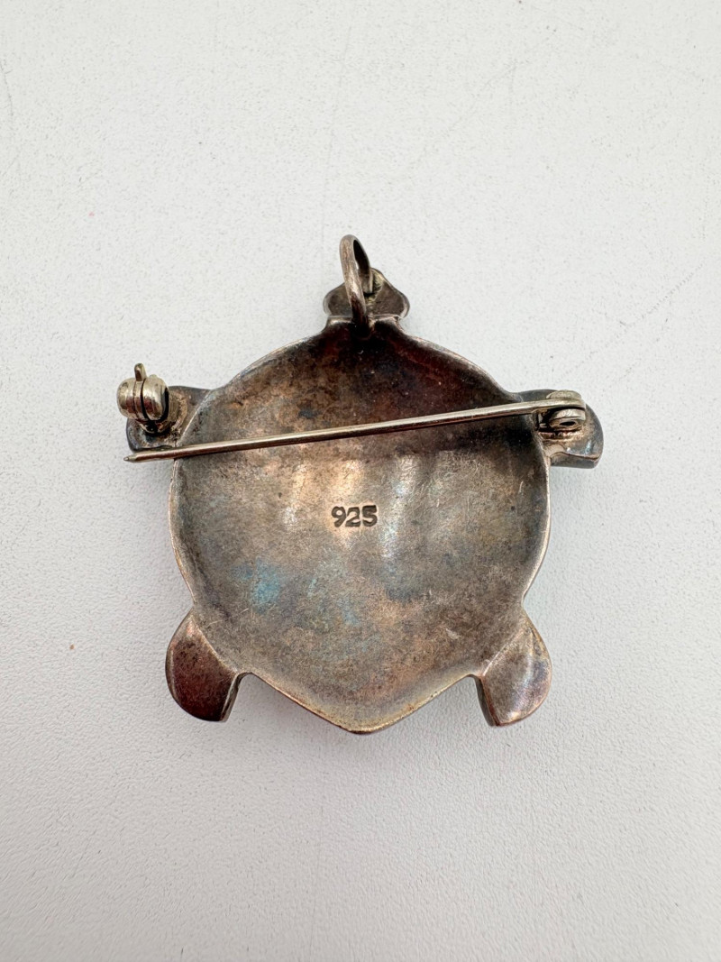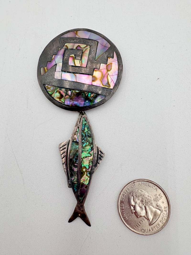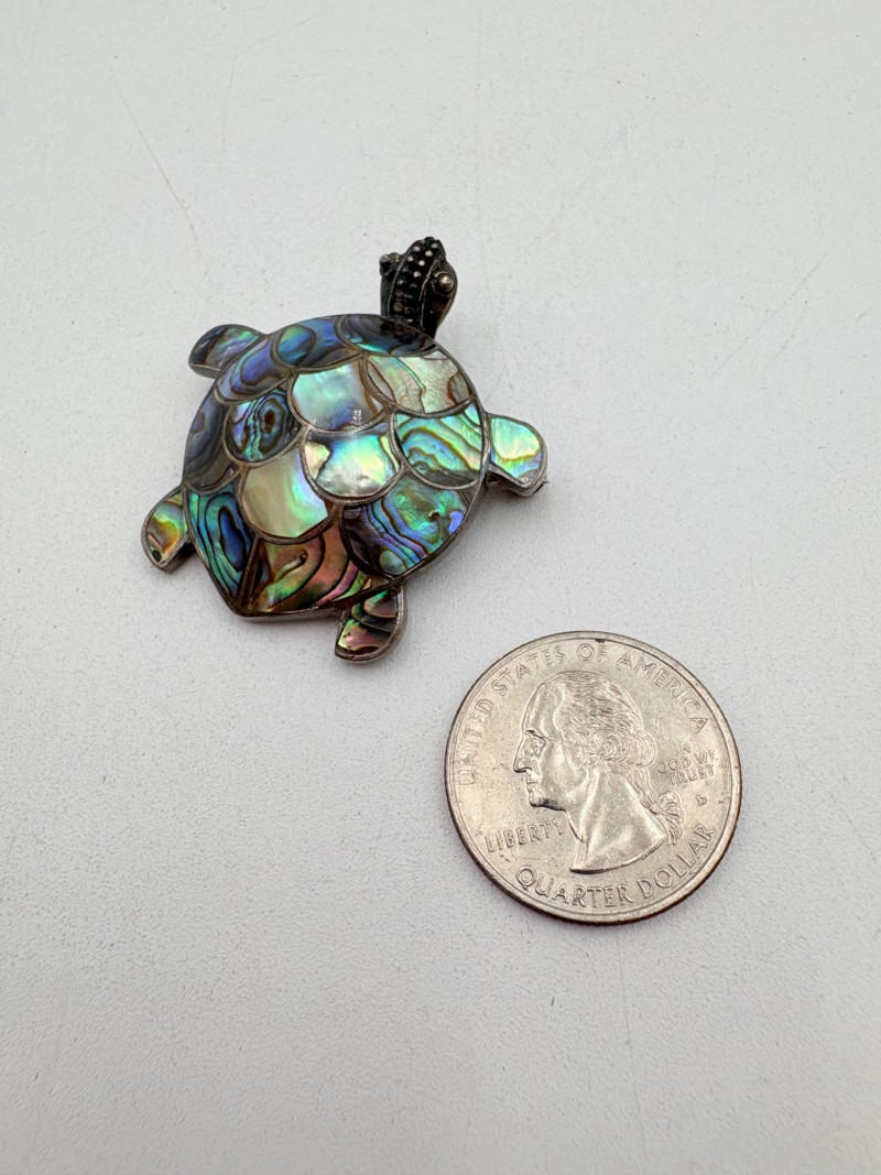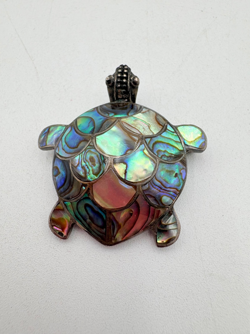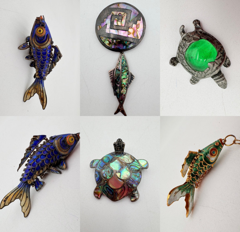 Great group of 6 sea-themed jewelry pieces; several in sterling. - Sterling fish pin inlaid with abalone shell can double as a pendant necklace. Marked sterling on back. - Large blue & gold articulating fish pendant necklace. This piece is a real vintage beauty with smoothly curved scales, separate dorsal fin, and amazing detail. Enamel on metal, it hangs on a necklace chain suspended from a chain on its back. - Small blue & gold articulating fish pendant. This piece is more compact and slightly less detailed than the previous fish. Enamel on metal, the necklace chain attaches at the fish's mouth. - Green & white articulating fish is a hair larger than the previous fish. Enamel on metal, it is attached to an included 14K gold chain at the mouth. - Turtle pendant with green glass center may be silver, but it is unmarked. - Turtle with abalone shell scales on its back is marked 925 on the reverse.