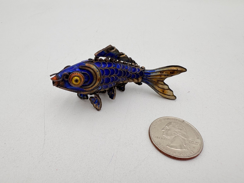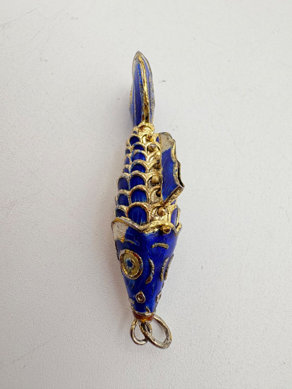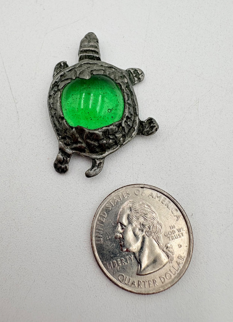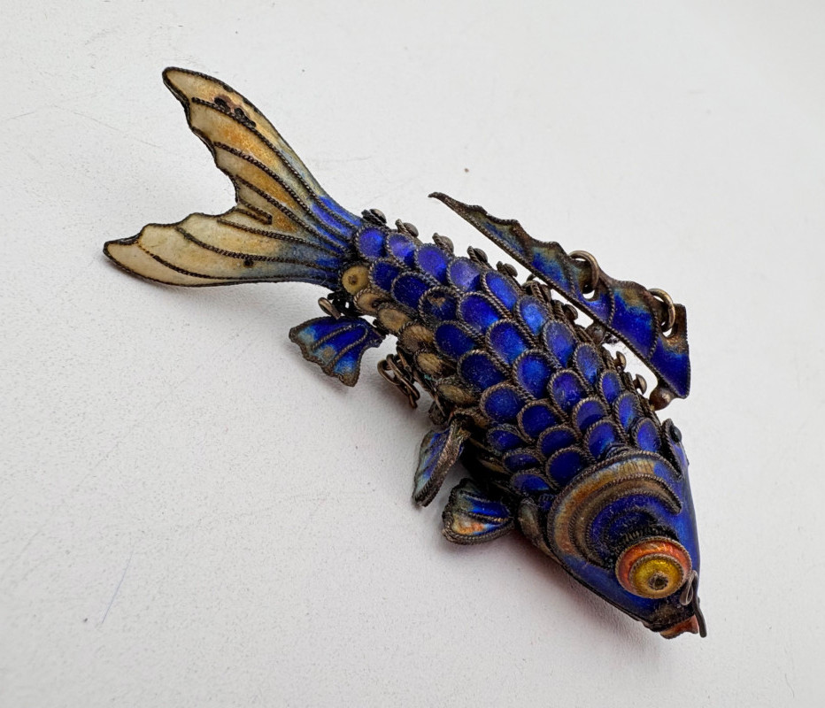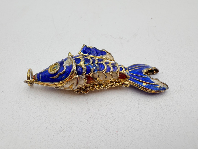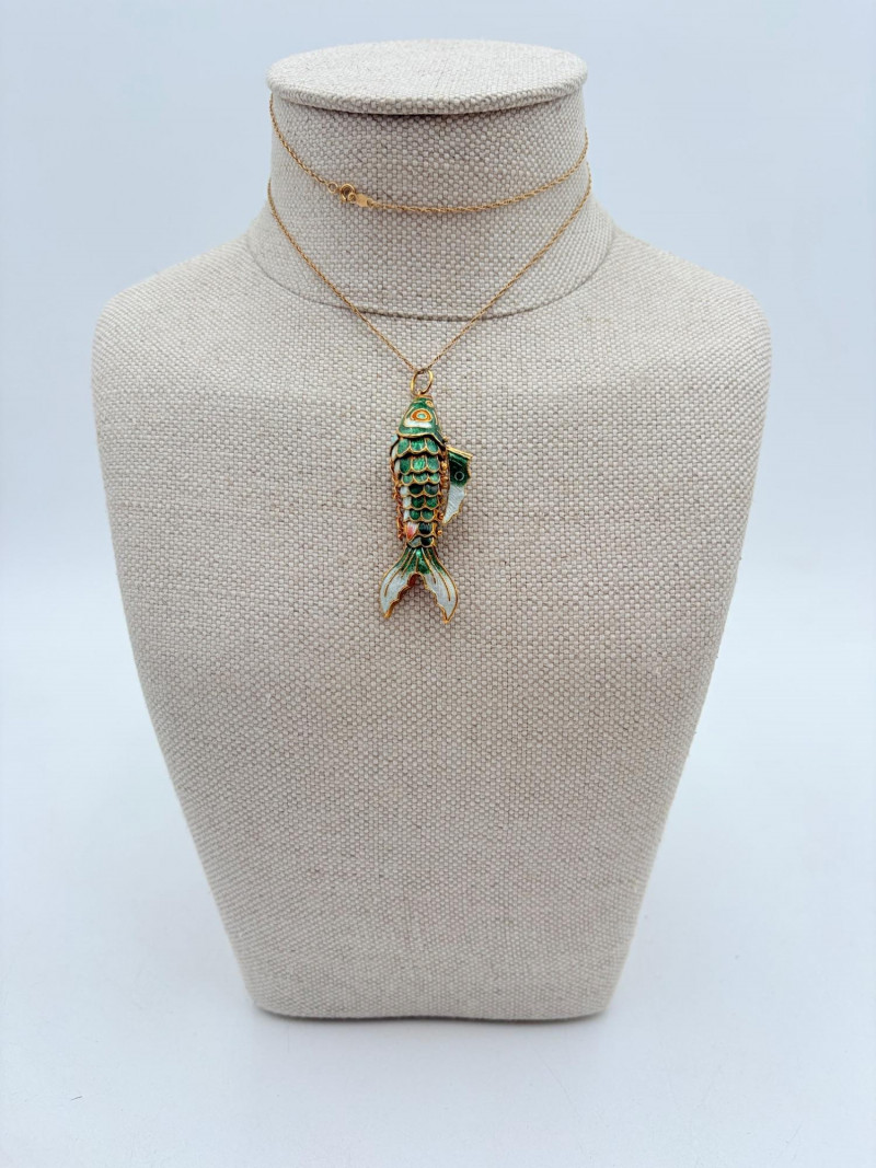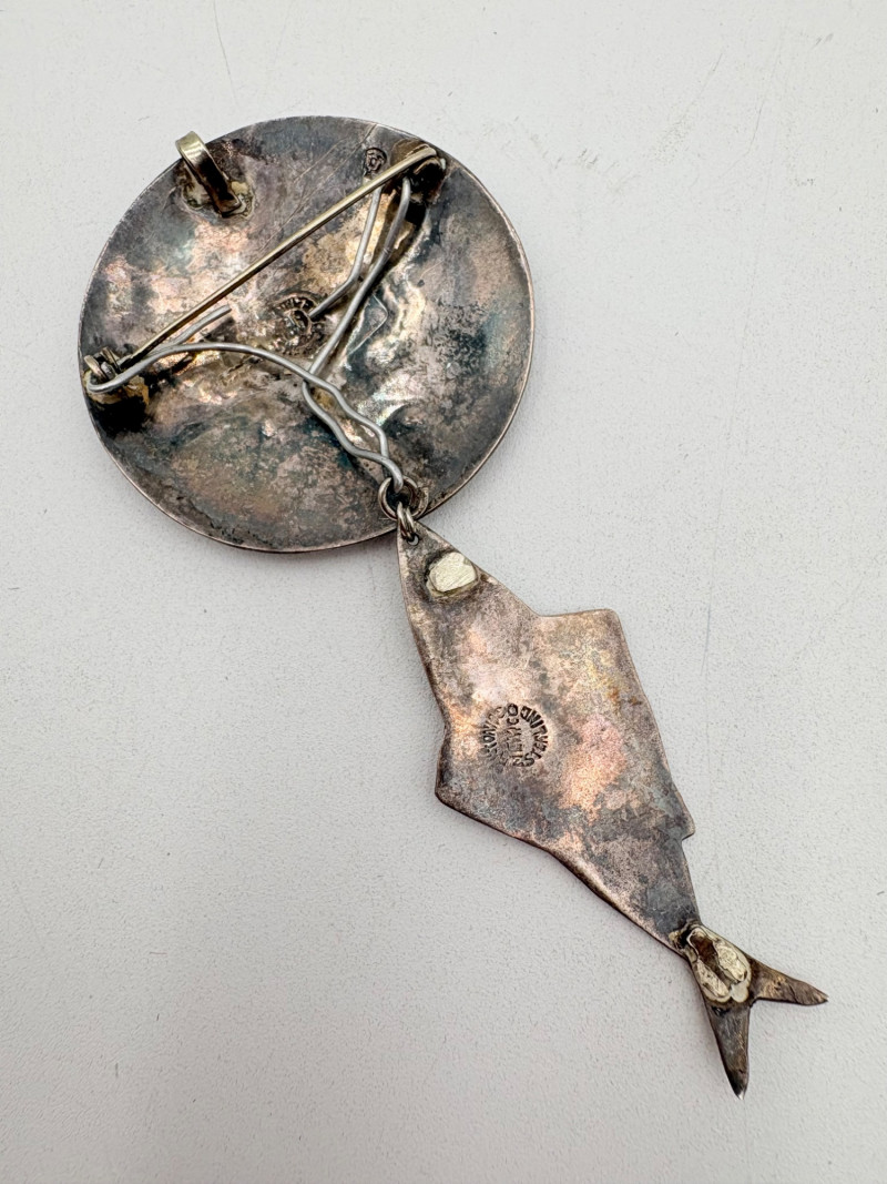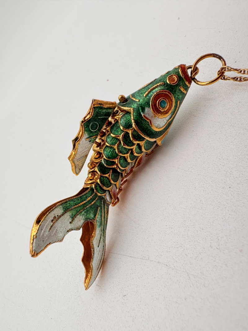 Great group of 6 sea-themed jewelry pieces; several in sterling. - Sterling fish pin inlaid with abalone shell can double as a pendant necklace. Marked sterling on back. - Large blue & gold articulating fish pendant necklace. This piece is a real vintage beauty with smoothly curved scales, separate dorsal fin, and amazing detail. Enamel on metal, it hangs on a necklace chain suspended from a chain on its back. - Small blue & gold articulating fish pendant. This piece is more compact and slightly less detailed than the previous fish. Enamel on metal, the necklace chain attaches at the fish's mouth. - Green & white articulating fish is a hair larger than the previous fish. Enamel on metal, it is attached to an included 14K gold chain at the mouth. - Turtle pendant with green glass center may be silver, but it is unmarked. - Turtle with abalone shell scales on its back is marked 925 on the reverse.