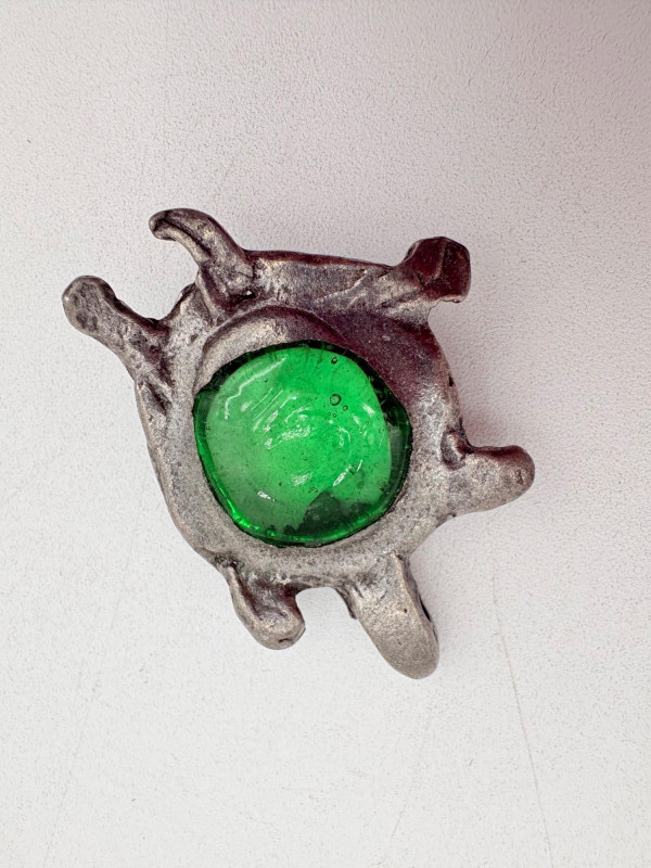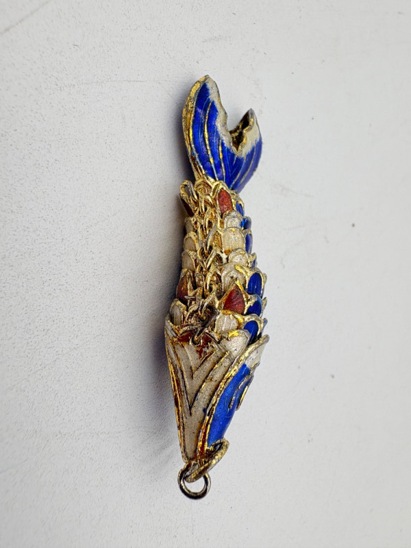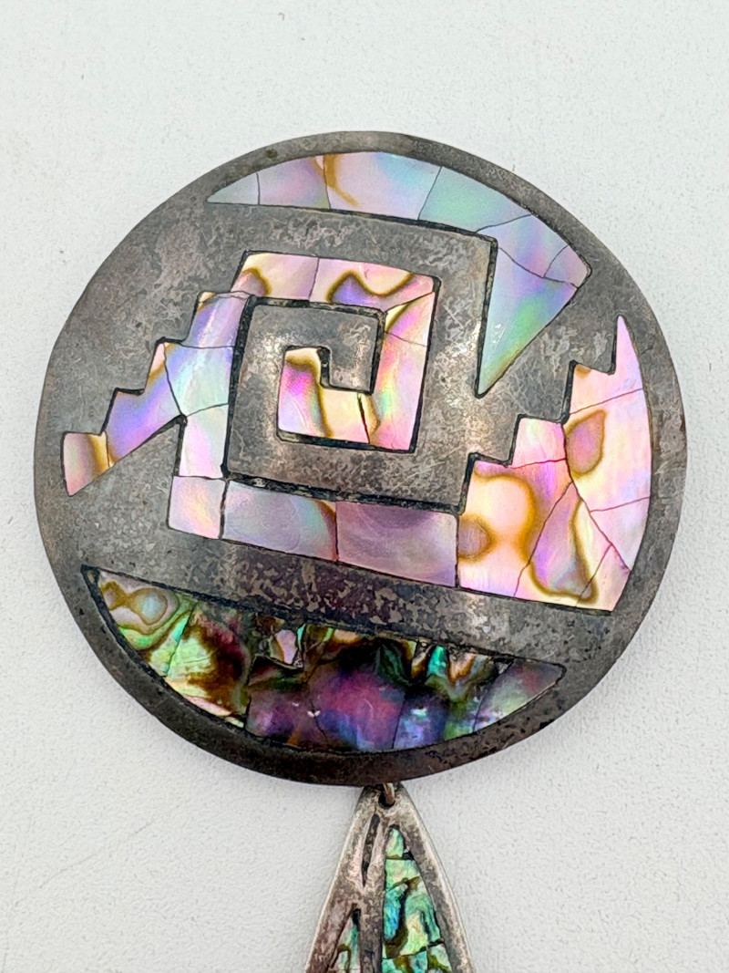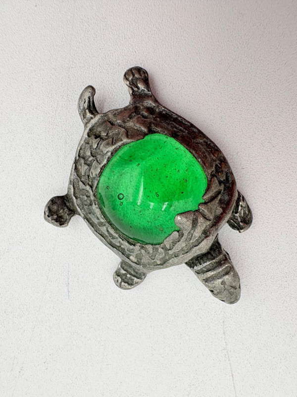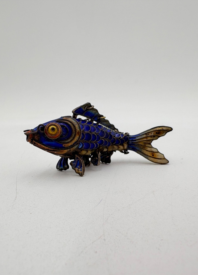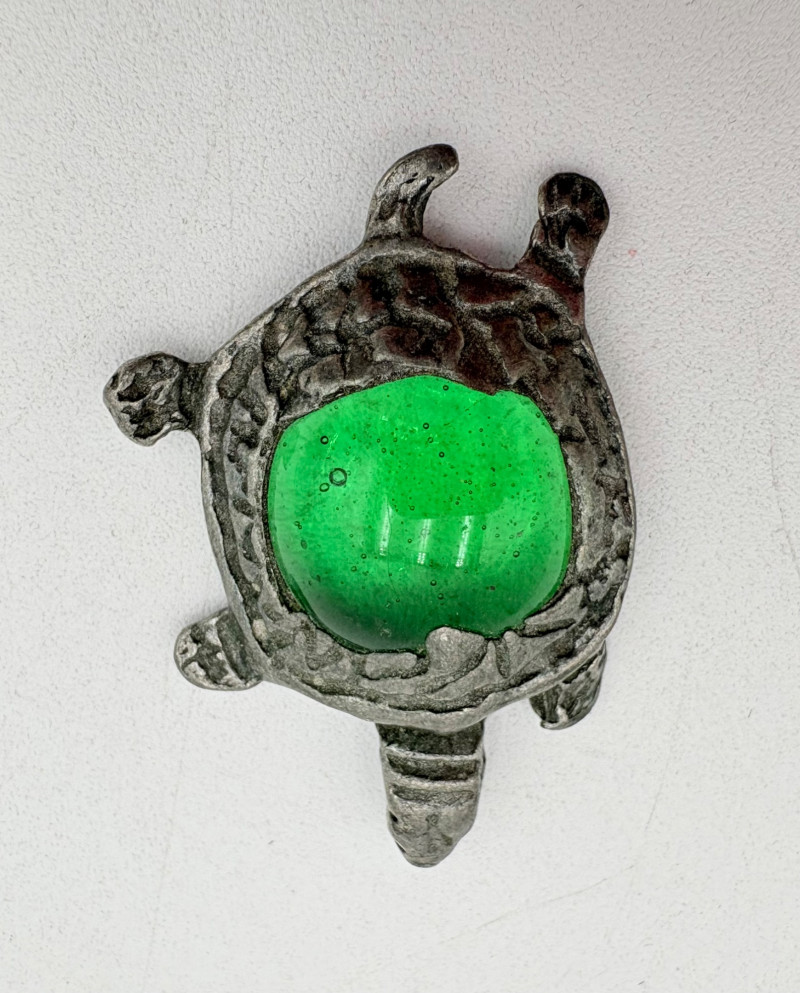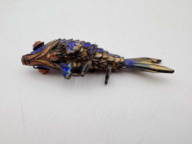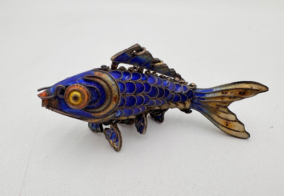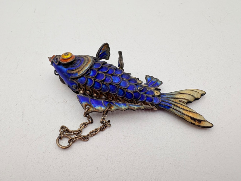 Great group of 6 sea-themed jewelry pieces; several in sterling. - Sterling fish pin inlaid with abalone shell can double as a pendant necklace. Marked sterling on back. - Large blue & gold articulating fish pendant necklace. This piece is a real vintage beauty with smoothly curved scales, separate dorsal fin, and amazing detail. Enamel on metal, it hangs on a necklace chain suspended from a chain on its back. - Small blue & gold articulating fish pendant. This piece is more compact and slightly less detailed than the previous fish. Enamel on metal, the necklace chain attaches at the fish's mouth. - Green & white articulating fish is a hair larger than the previous fish. Enamel on metal, it is attached to an included 14K gold chain at the mouth. - Turtle pendant with green glass center may be silver, but it is unmarked. - Turtle with abalone shell scales on its back is marked 925 on the reverse.