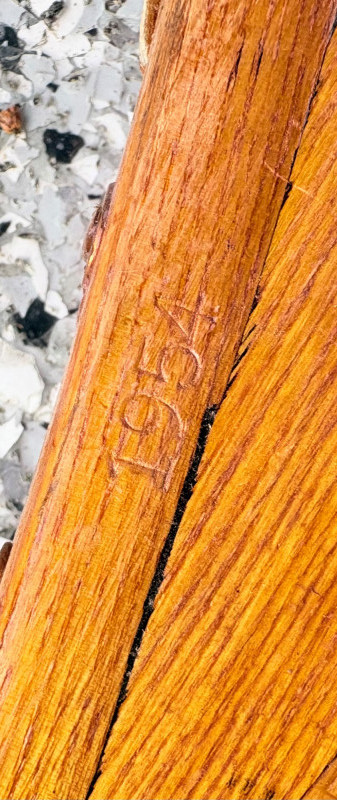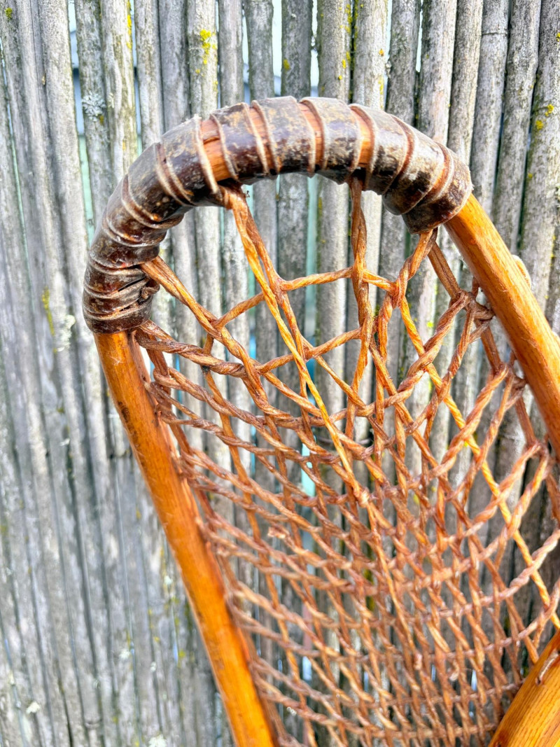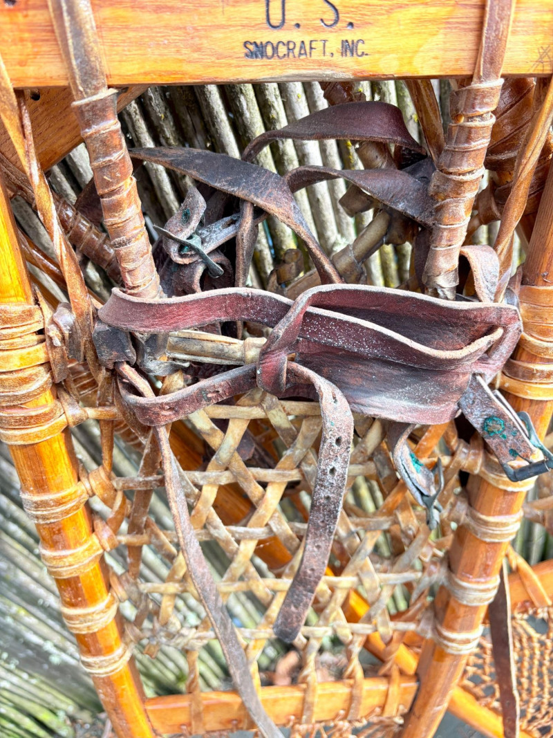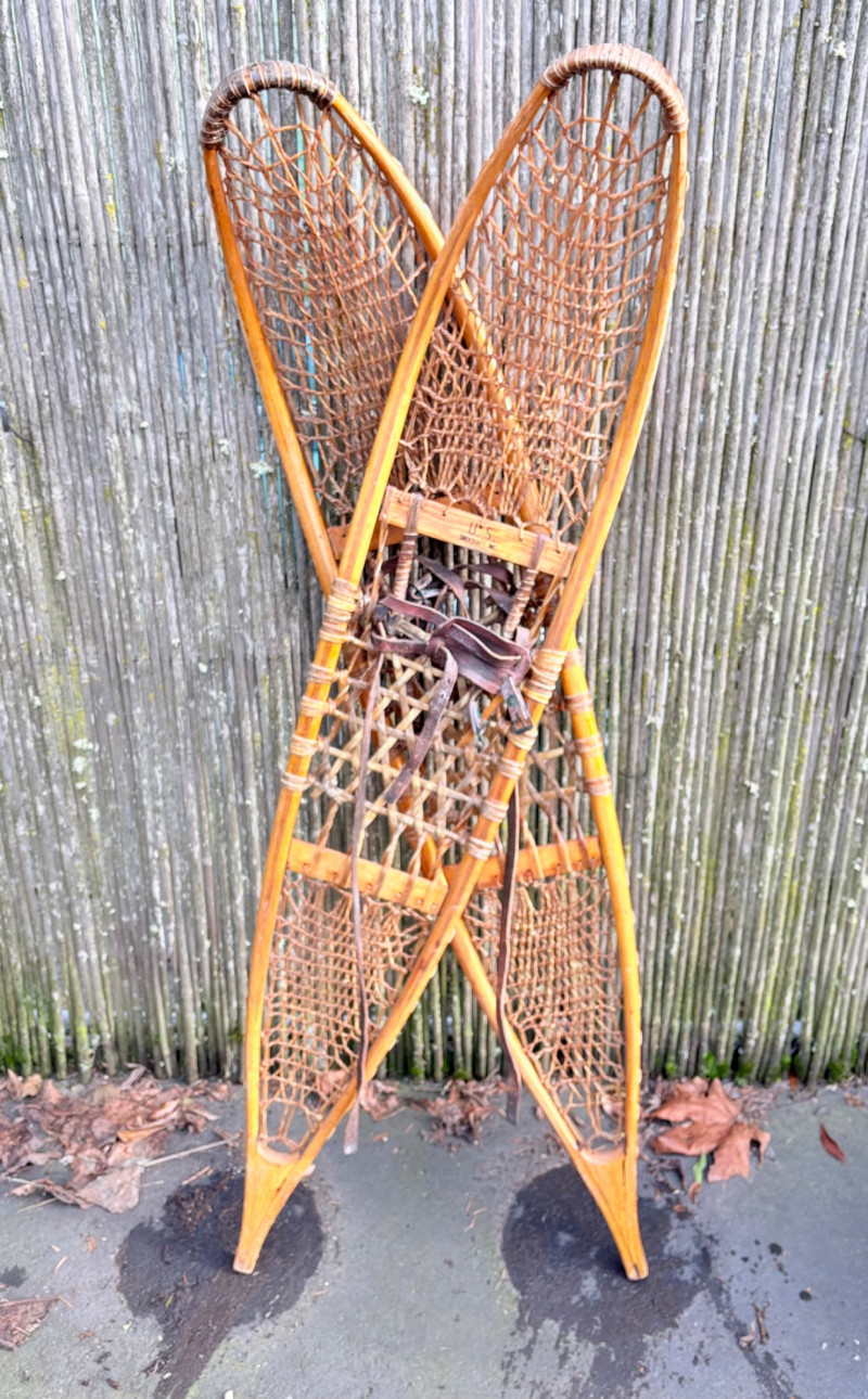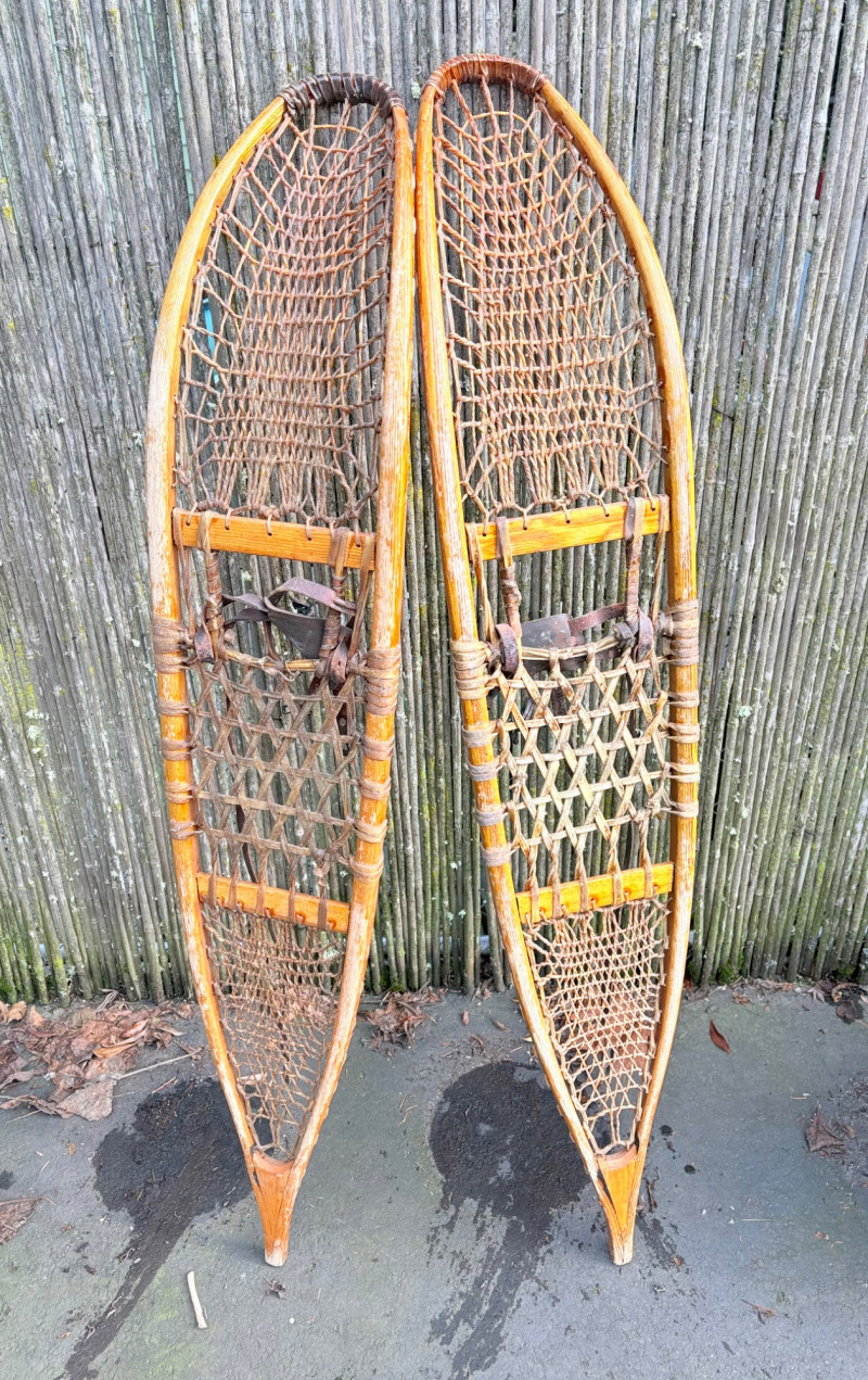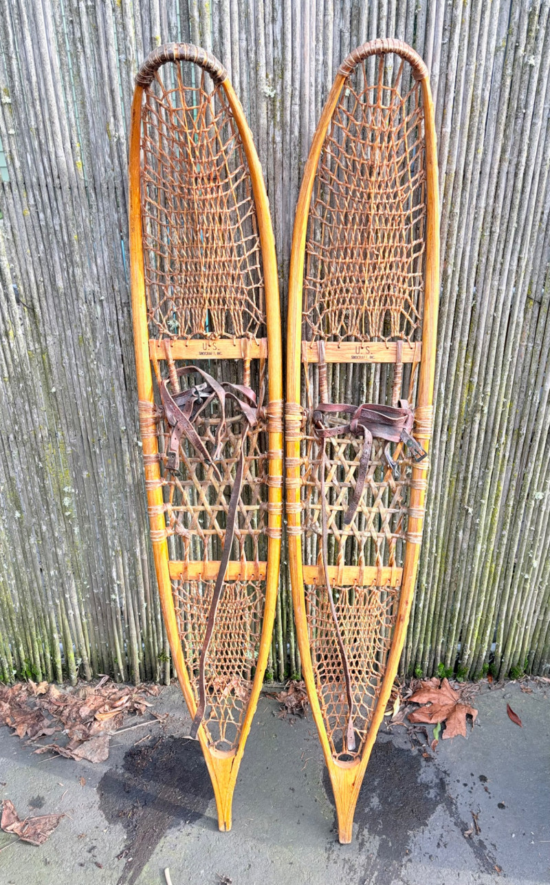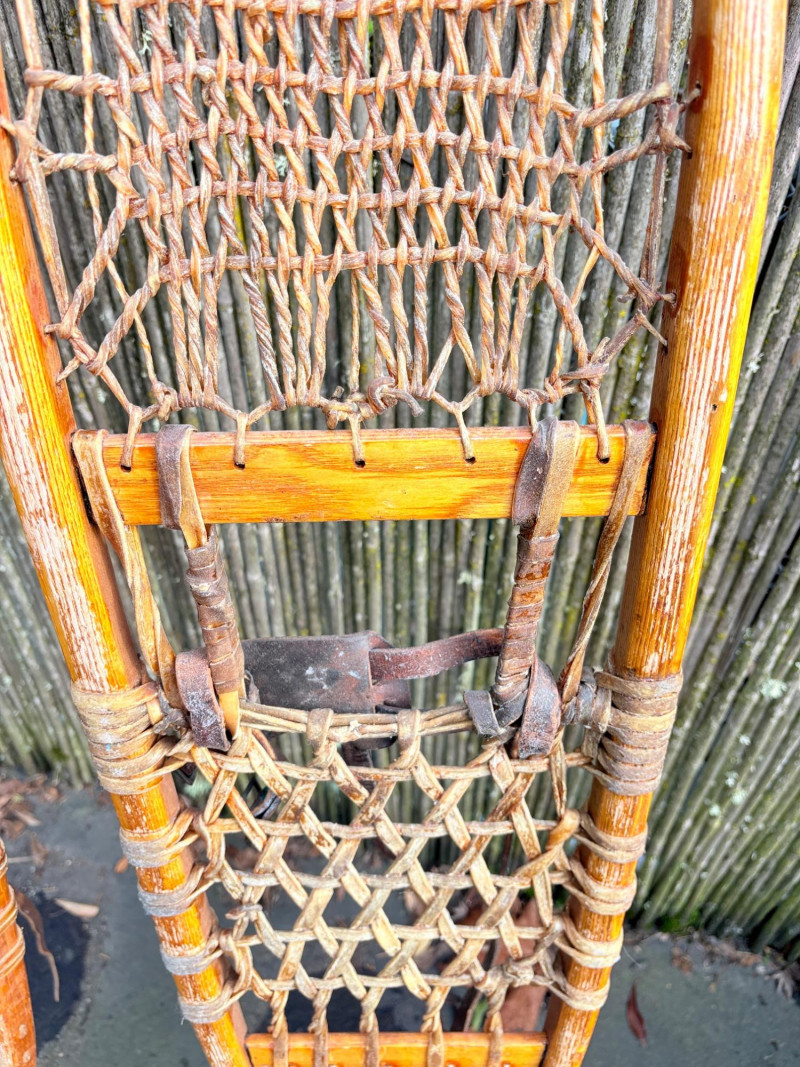 Imagine these on your wall at the cabin! Great antique snowshoes from U.S. Snocraft; we believe they are from the 1950s. Amazing workmanship in these with bentwood frame, rawhide weaving, and leather straps. They measure 53" L x 8" W and are in beautiful shape with the exception of the leather foot bindings which are a little bedraggled. Note that we have 3 pairs of these beauties - enough to do a whole wall of your retreat. See lots #23 & #137 for more.