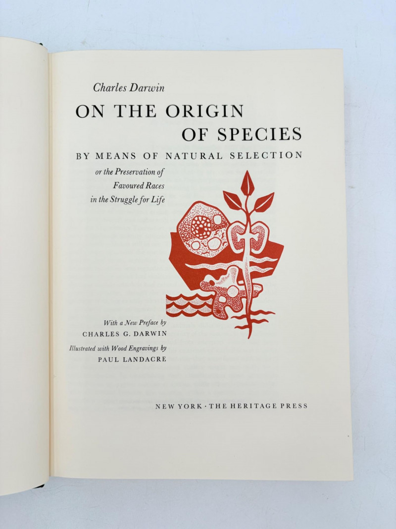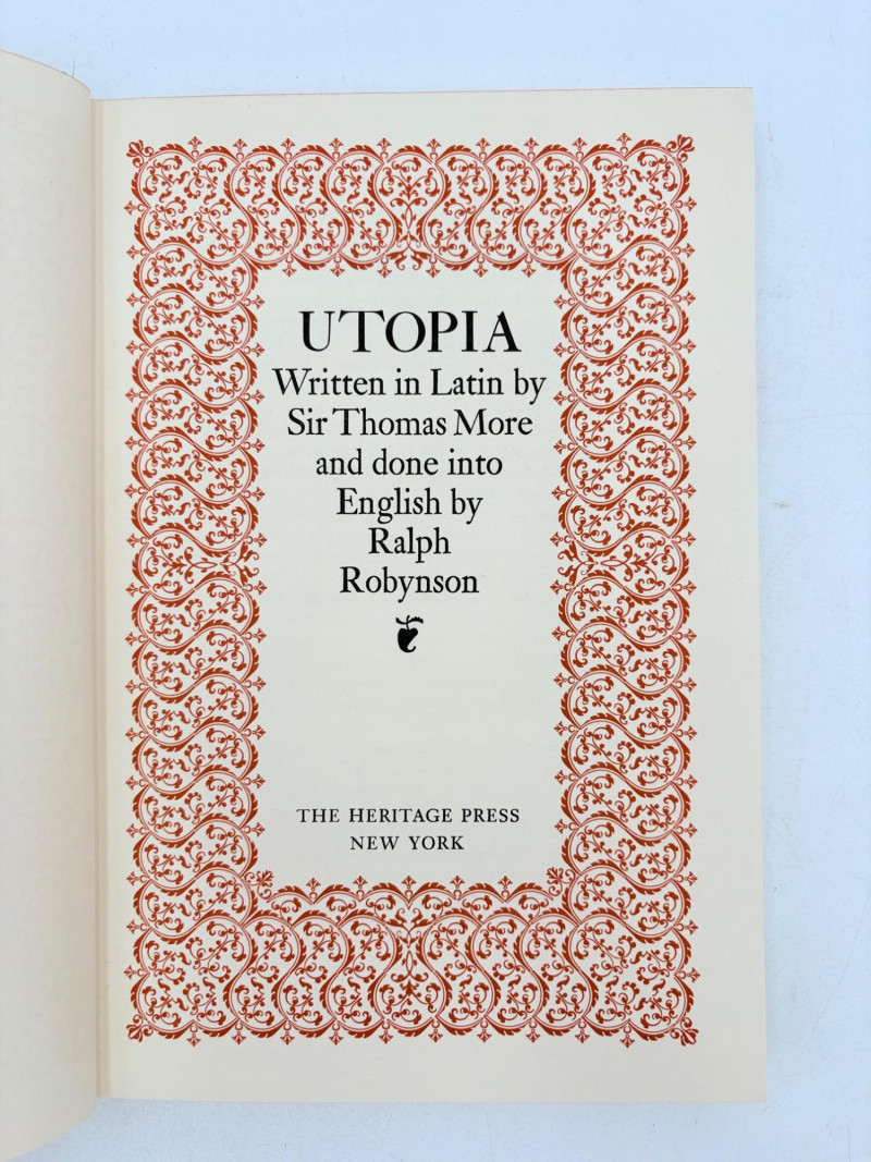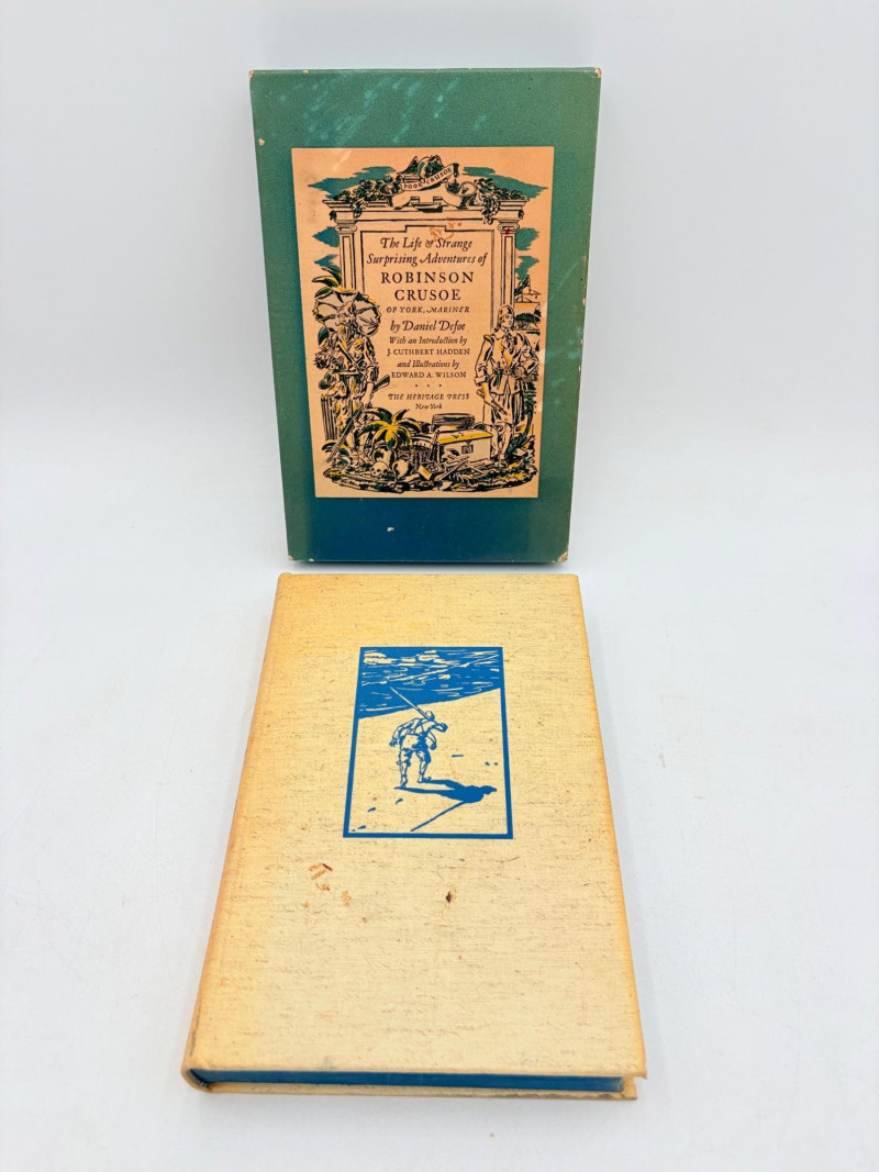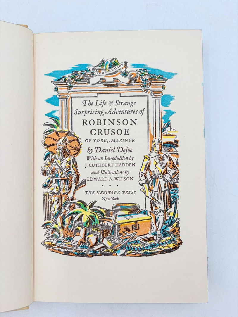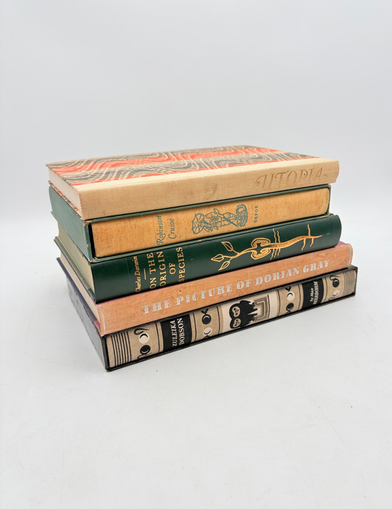 Wonderful works from the British Empire! Utopia (Thomas More) 1935. Heritage Press, New York.165 p. Owner's name on inside cover. Robinson Crusoe (Daniel Defoe)1930. Heritage Press, New York. 299 p. On The Origin of the Species (Charles Darwin) 1963. Heritage Press, New York. 470 p. Picture of Dorian Gray (Oscar Wilde) 1957. Heritage Press, New York. 287 p. Owner's name on inside cover Zulieka Dobson (Max Beerbohm) 1960. Heritage Press, New York. 277 p. Owner's name on inside cover Heritage Press existed from 1937 - 1982. They published almost exclusively classics in literature and history. Their publications were known for terrific illustrations, quality materials, and elegant covers that were lovely without being overly precious.