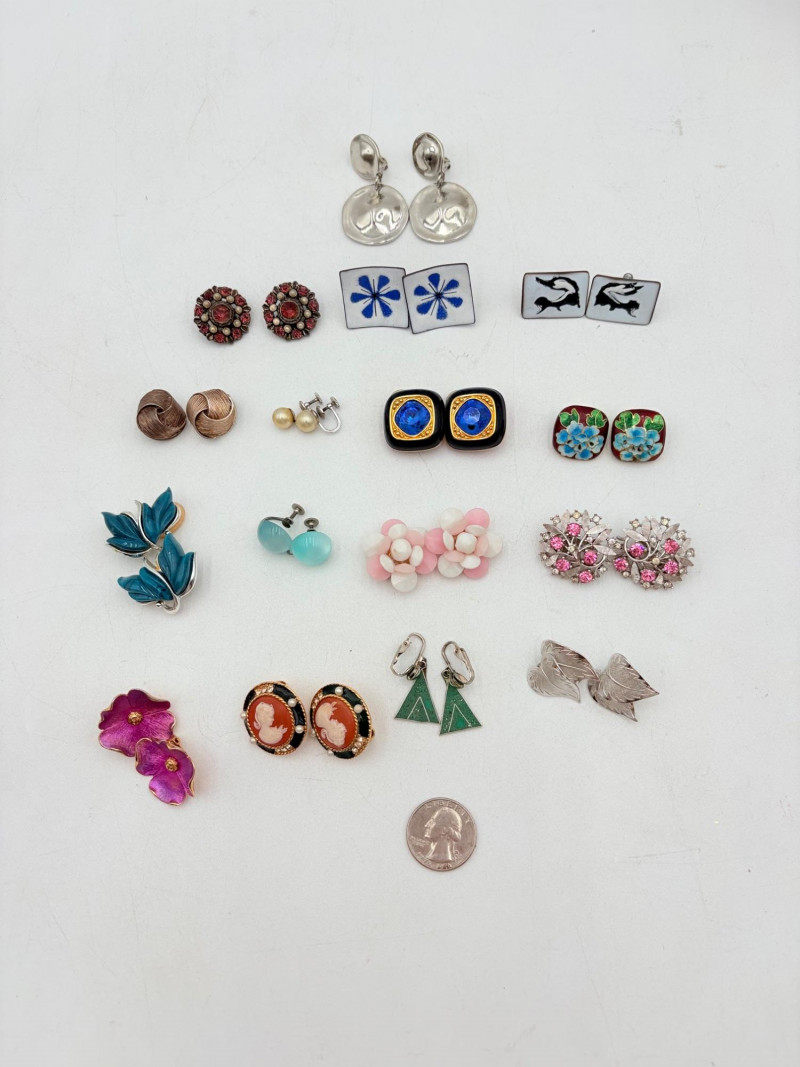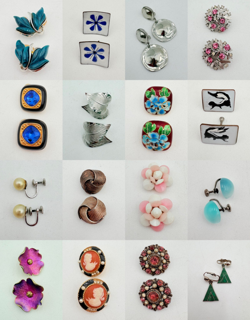 Terrific group of 16 pairs of vintage earrings in different styles, sizes, and materials. However, they do have one thing in common: lots of style and clip-backs.