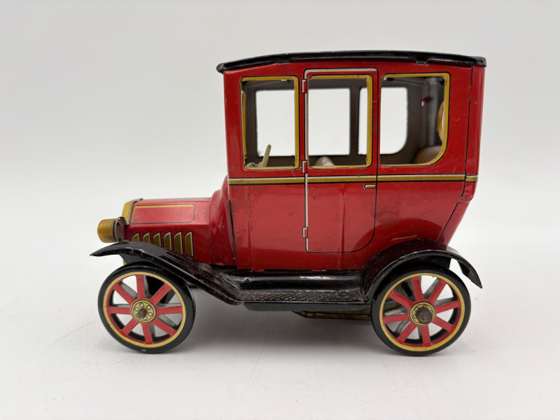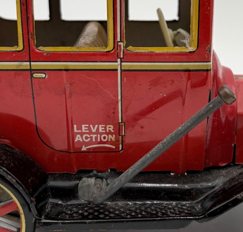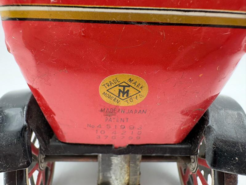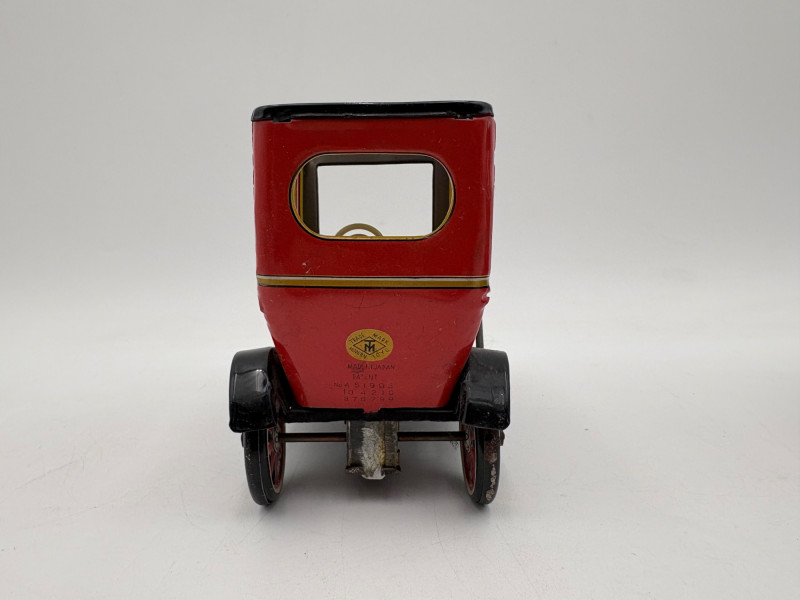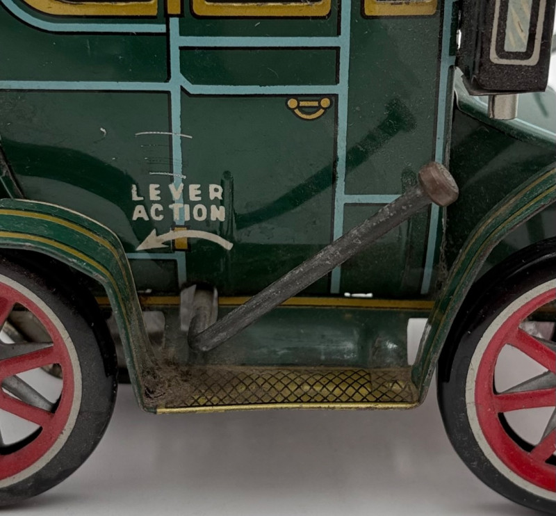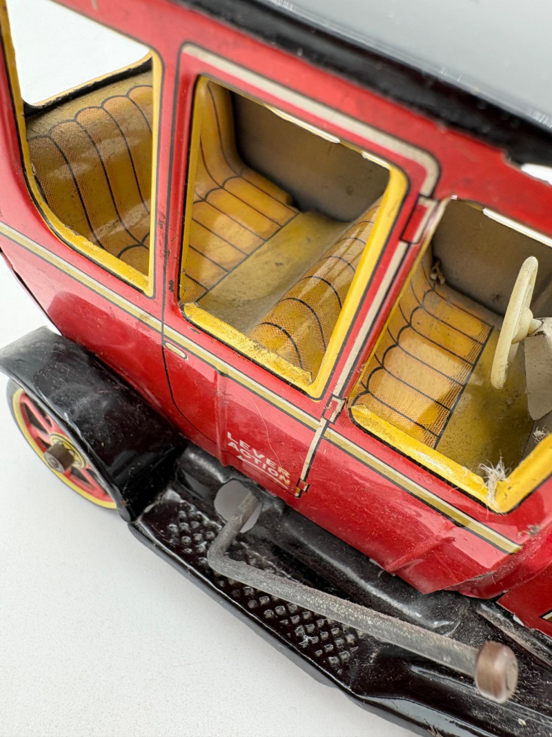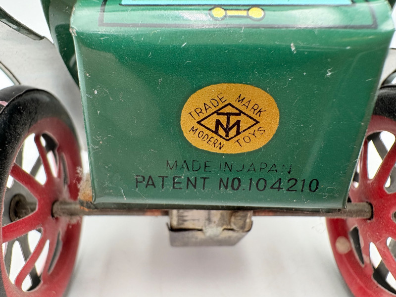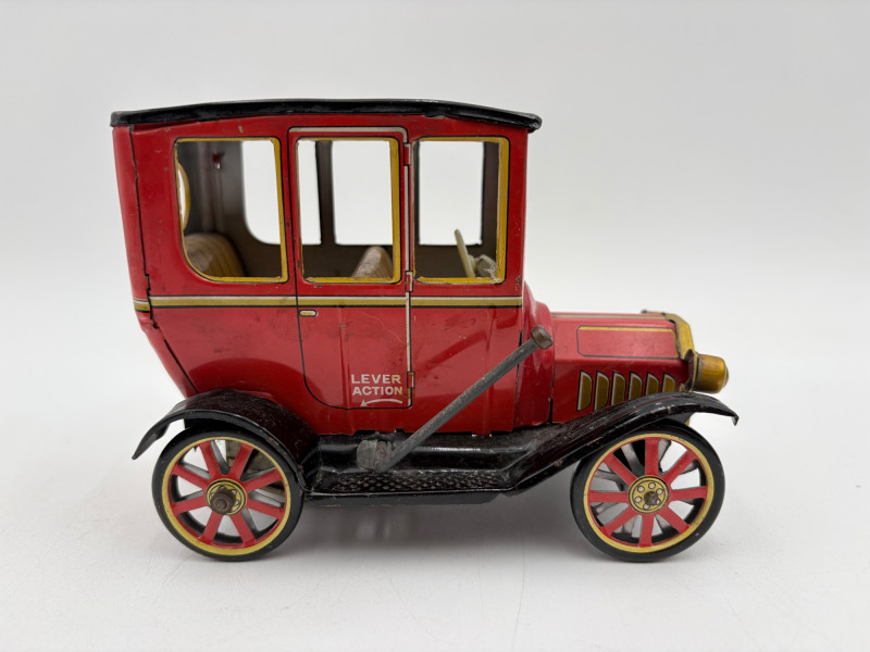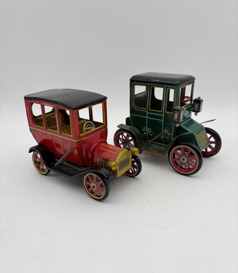 2 working "lever action" vintage tin toy cars from Japanese toymaker Modern Toys. (Matsudaya). Pull the lever on the running board back on a level surface & the cars self-propel. Both In excellent vintage condition - minimal signs of use and colors are still brilliant. Circa 1950. Note that there are no seats in the green car. Red measures 4" H x 5.25" L x 3" D. Green measures 4.25" x 5.25" L x 3.25" D.