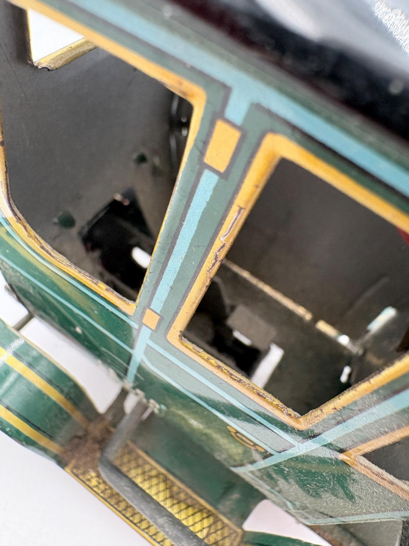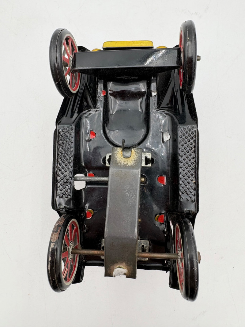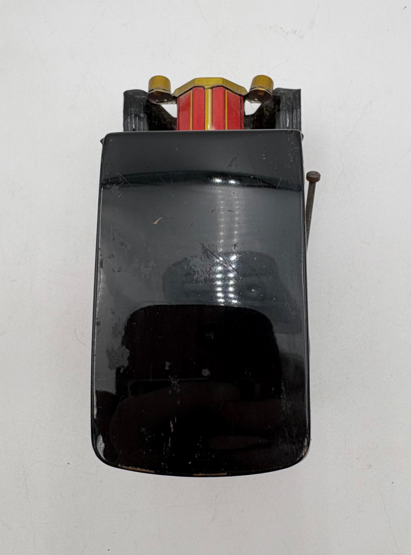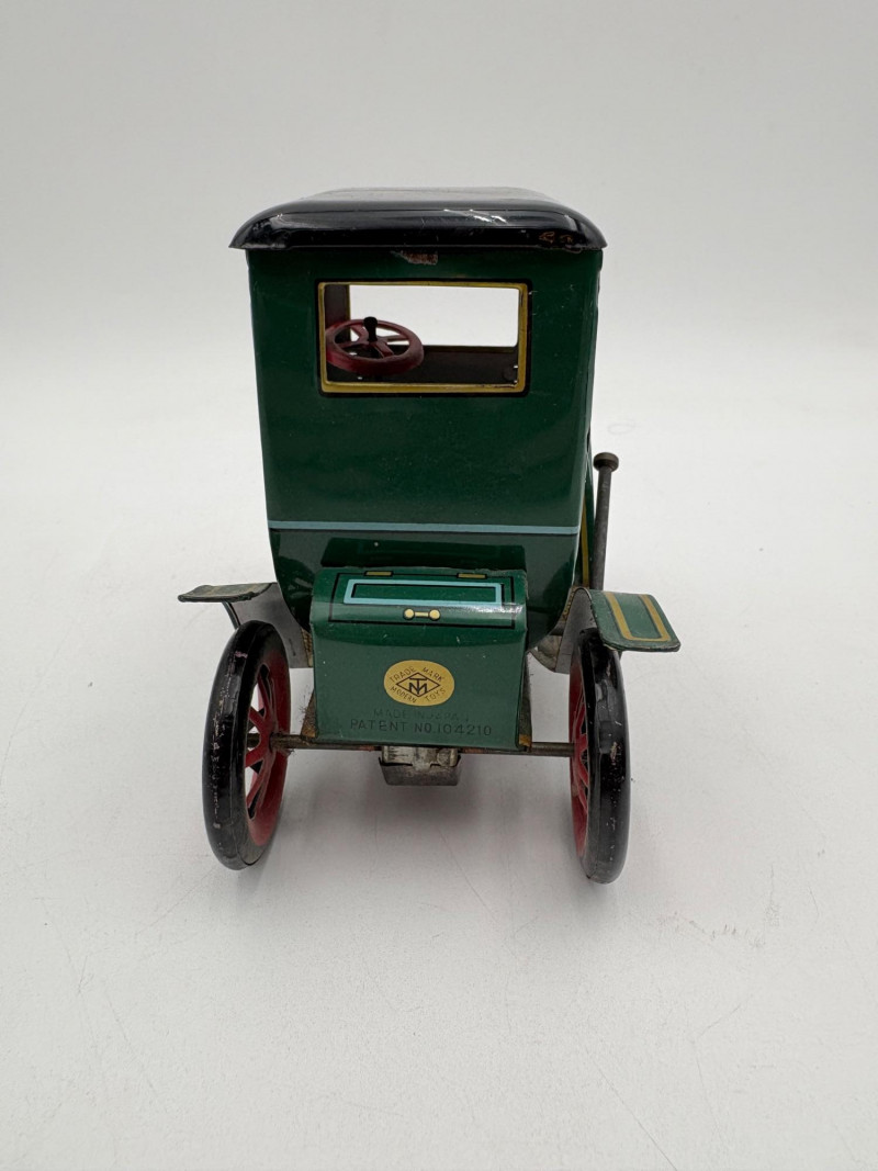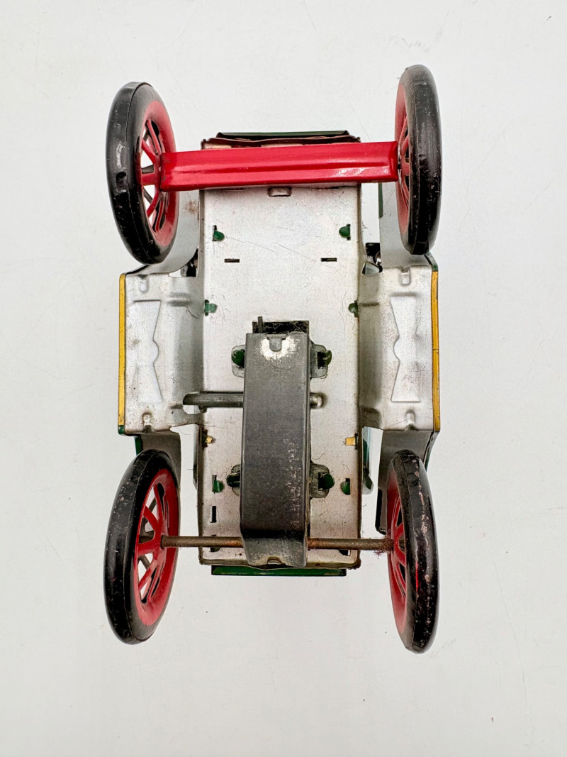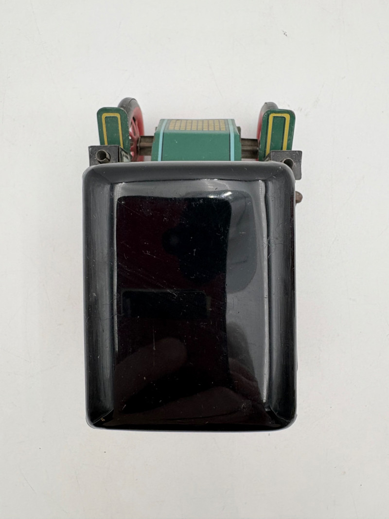 2 working "lever action" vintage tin toy cars from Japanese toymaker Modern Toys. (Matsudaya). Pull the lever on the running board back on a level surface & the cars self-propel. Both In excellent vintage condition - minimal signs of use and colors are still brilliant. Circa 1950. Note that there are no seats in the green car. Red measures 4" H x 5.25" L x 3" D. Green measures 4.25" x 5.25" L x 3.25" D.