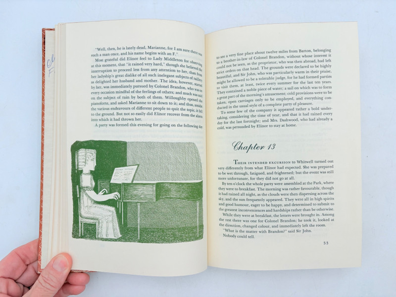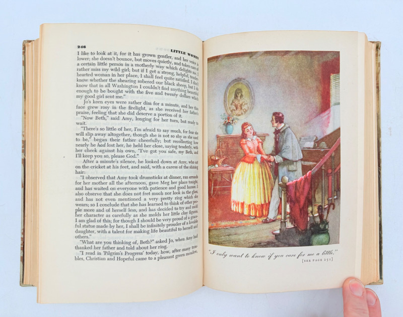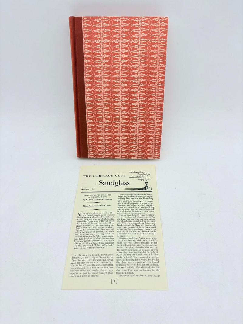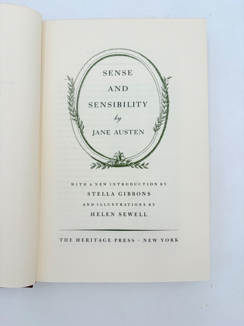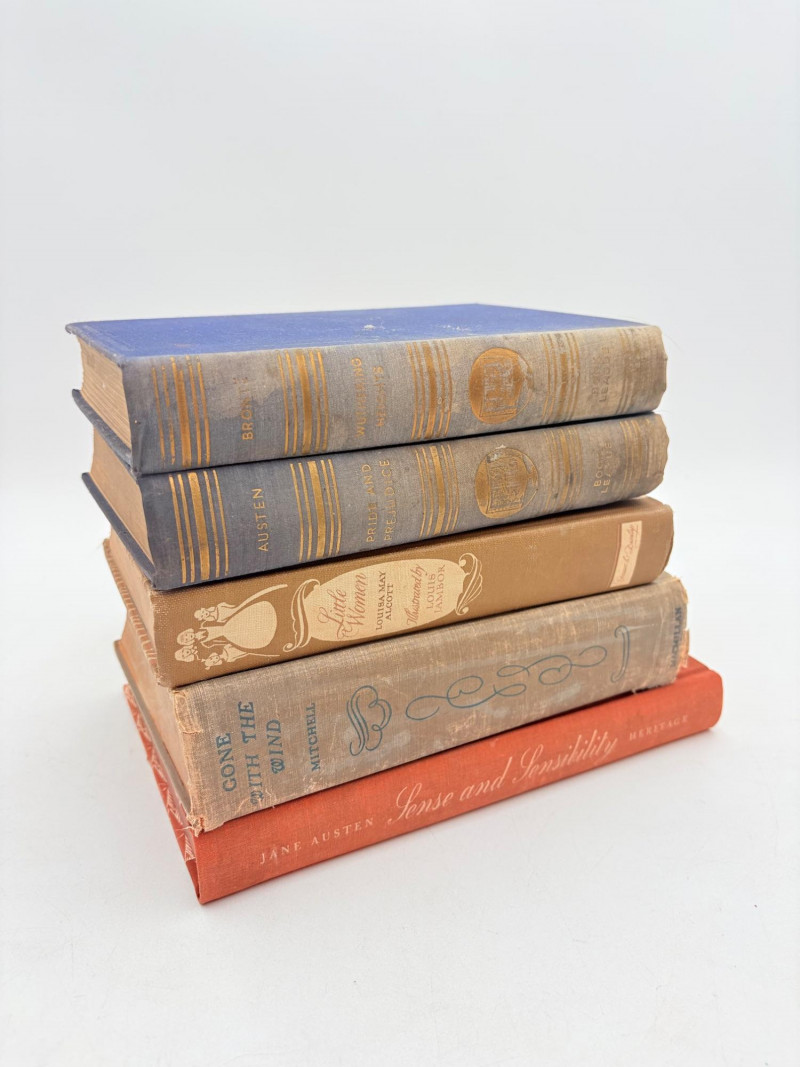 Five wonderful stories by 5 wonderful writers - who just happen to be female as well. Wuthering Heights (Charlotte Bronte) 1936. Book League of America, New York. 365 p. Pride and Prejudice (Jane Austen) 1937. Book League of America, New York. 364 p. LIttle Women (Louise May Alcott) 1947. Grosset & Dunlap, New York. 546 p. Gone With The Wind (Margaret Mitchell) 1937. Macmillan Co., New York. 1037 p. Please note that this book's binding is a bit loose and the front fly page is missing. Sense and Sensibility (Jane Austen) 1957. Heritage Press, New York. 333 p. Heritage Press existed from 1937 - 1982. They published almost exclusively classics in literature and history. Their publications were known for terrific illustrations, quality materials, and elegant covers that were lovely without being overly precious.
