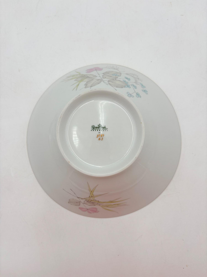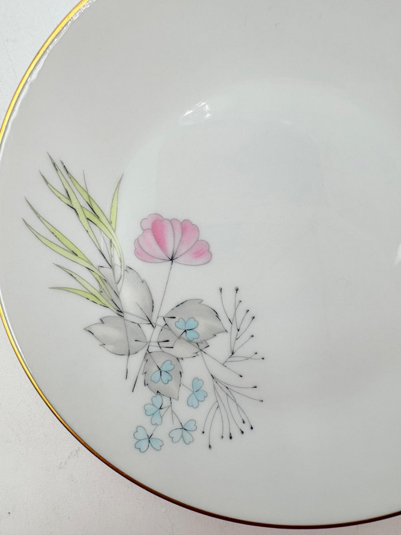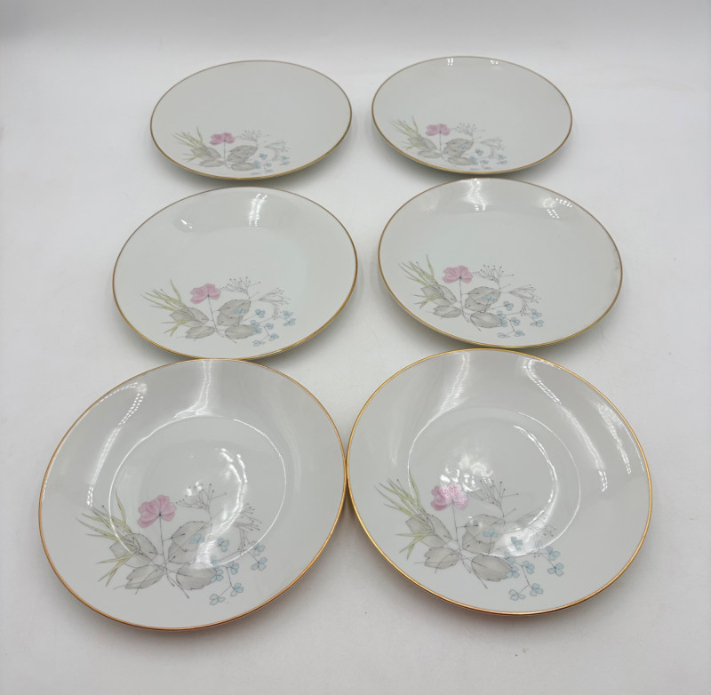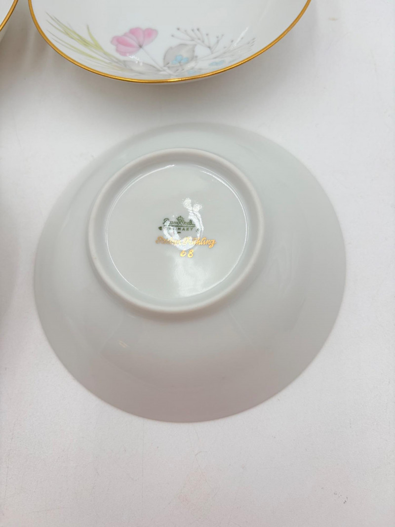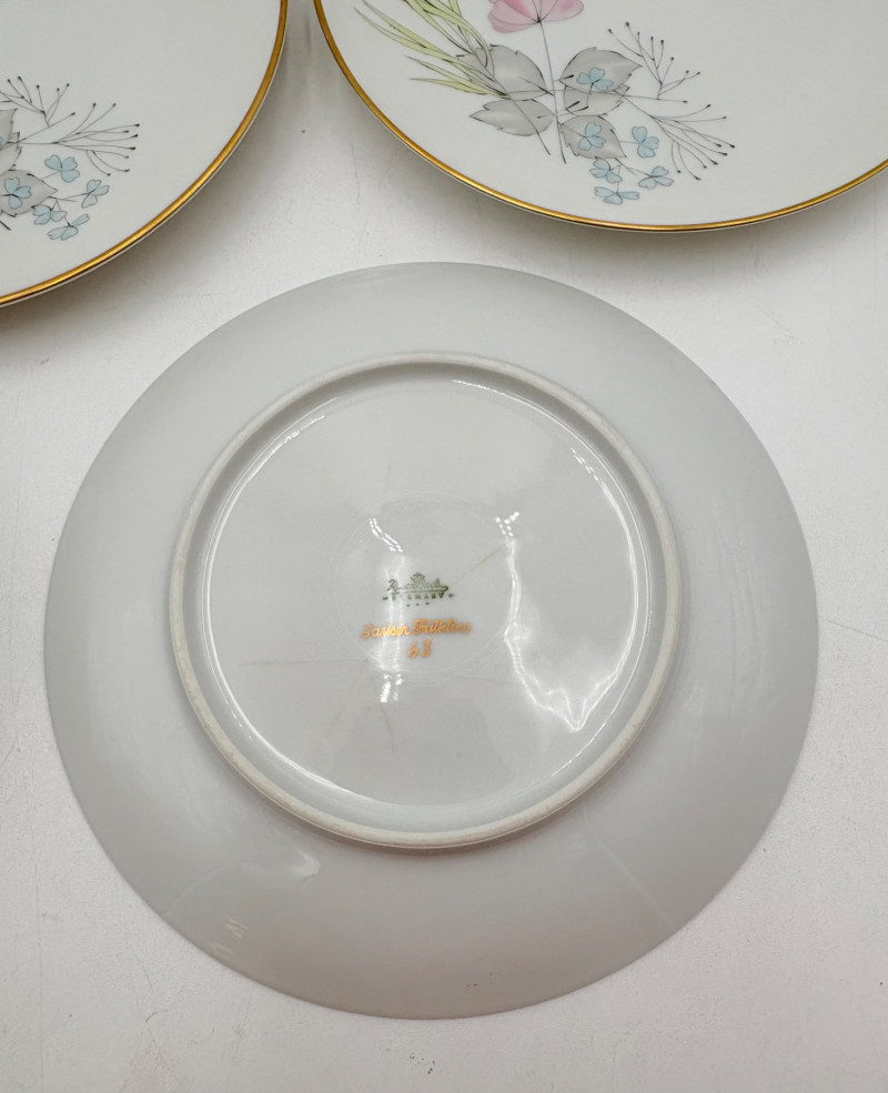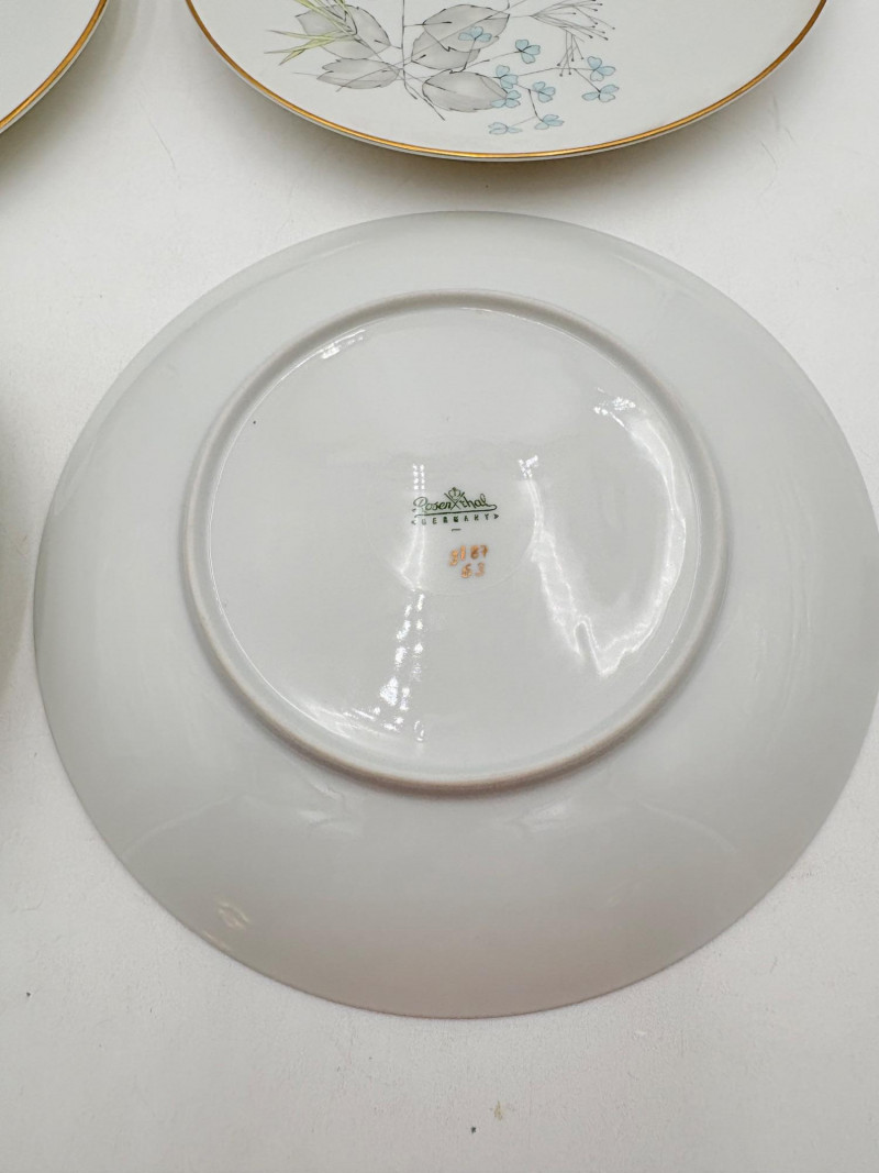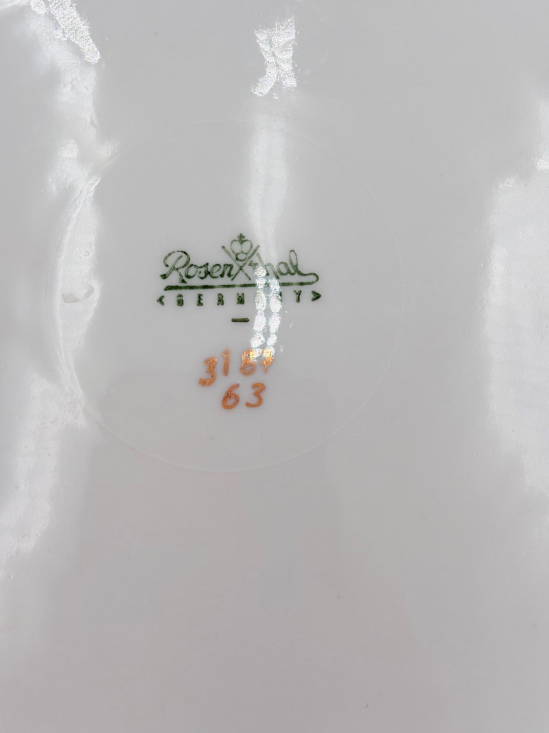6 complete settings (plus more of some pieces) and servewear of German maker Rosenthal's "Bettina Parisian Spring" with gold trim. Clean white background with delicate floral motif in pale tones - adds interest to the otherwise plain plate without taking away the clean white background for wonderful food presentation. It appears to be very difficult to find complete settings of this particular design in the quantity we have. We believe these were produced in the early1960s given the color and style of the Rosenthal mark on the reverse. We did not note any chips or cracks while photographing. Lot includes: - 8 dinner plates (9.75" W) - 6 salad plates (7.75" W) - 8 bread plates (6.25" W) - 6 coupe cereal/soup bowls (8.75" W) - 7 dessert bowls (5" W) - 6 teacups (4" W) - 9 saucers (6" W) - gravy boat (3" H x 8" L) - round serving bowl (3.5" H x 9.75" W) - lidded serving bowl/casserole (4" H x 9" W) - lidded small bowl (possibly sugar? 5" W) BONUS - we found the large platter and another salad plate after lead photos were taken. The platter measures 15" L - see last photo. RARE! VTG ROSENTHAL BETTINA PARISIAN SPRING PATTERN 15" OVAL PLATTER / TRAY NEW | eBay this is a listing just for the platter!