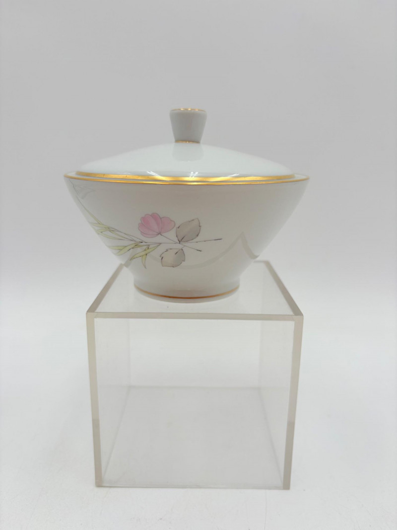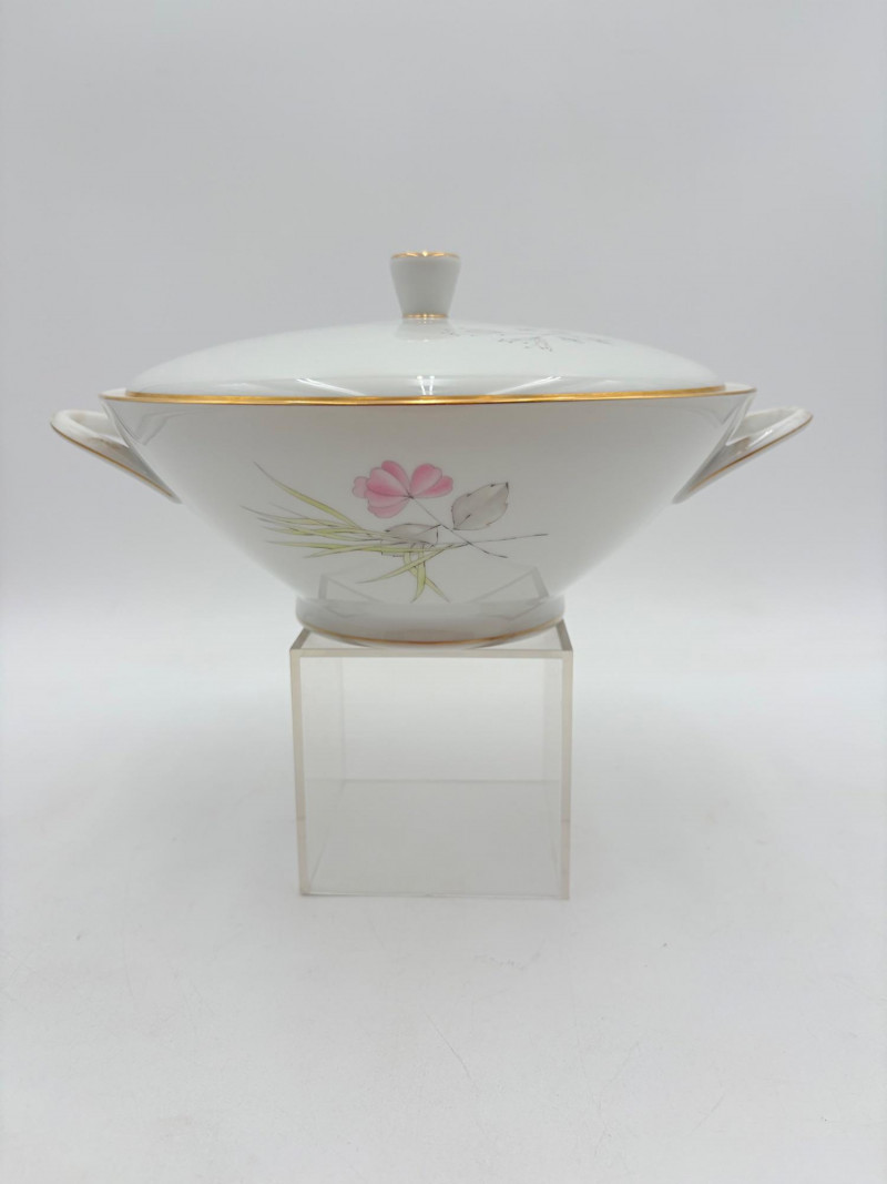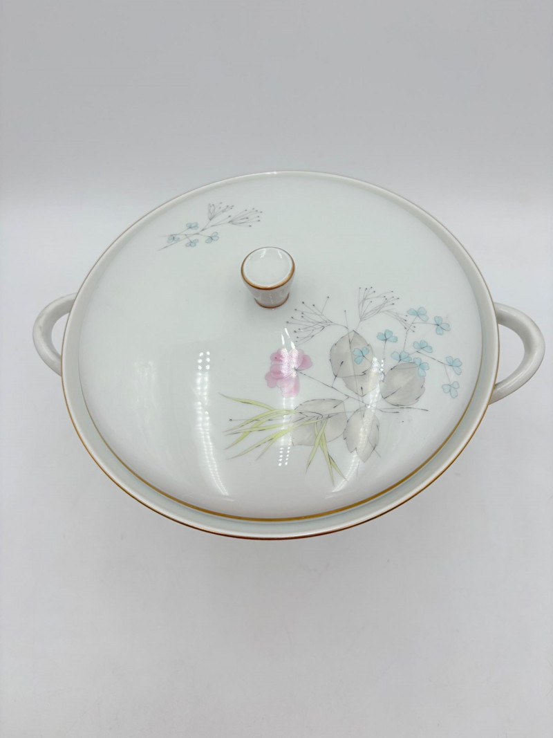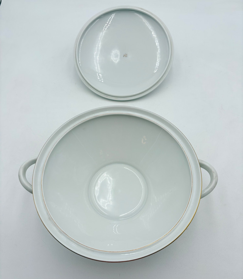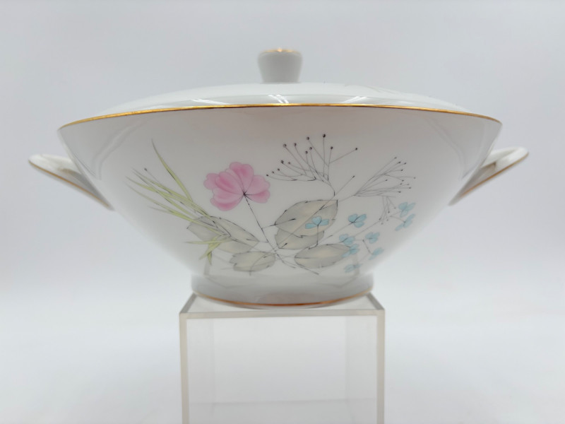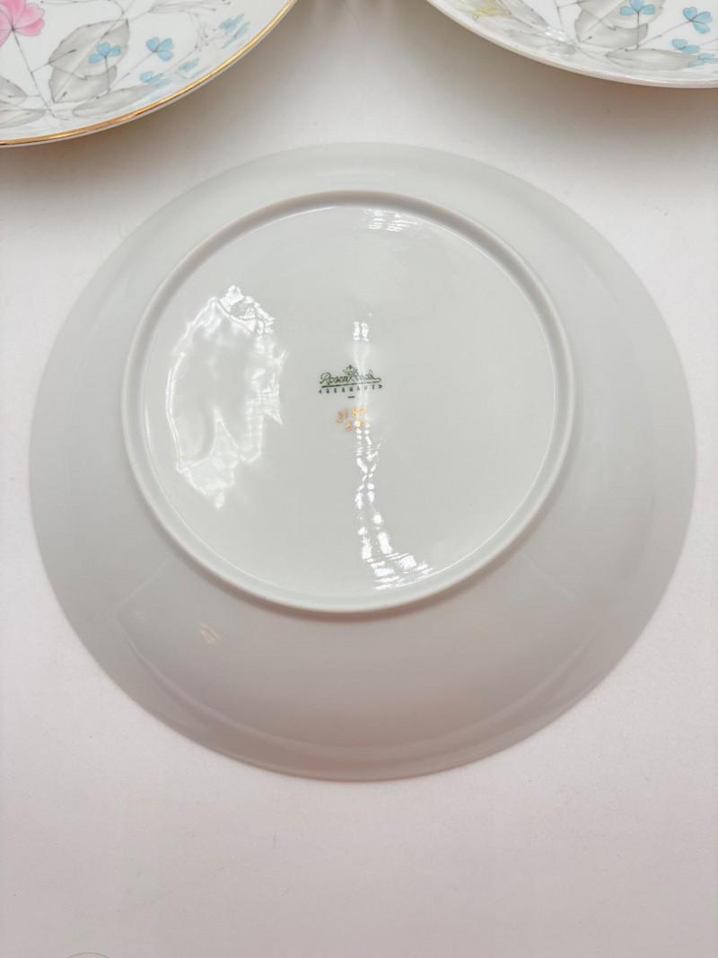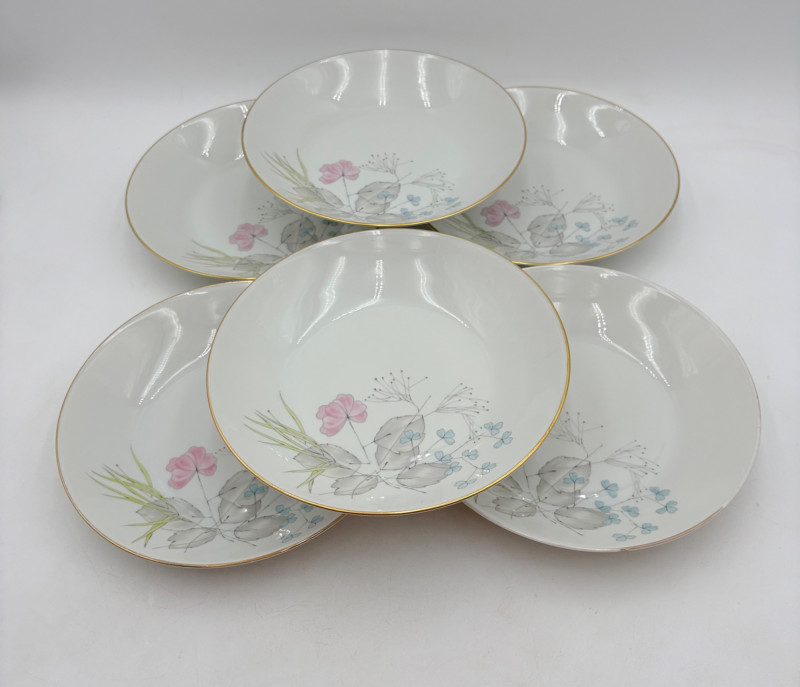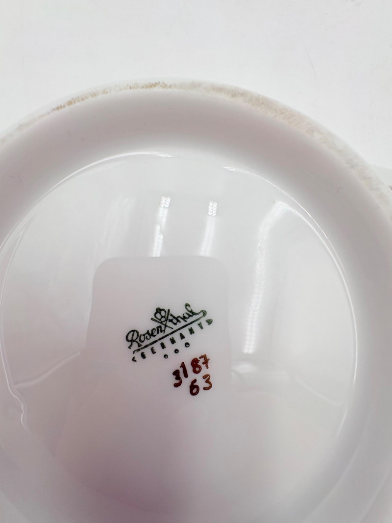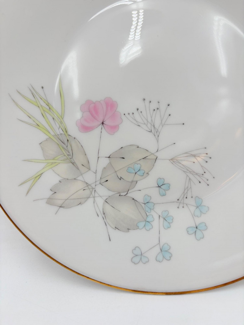 6 complete settings (plus more of some pieces) and servewear of German maker Rosenthal's "Bettina Parisian Spring" with gold trim. Clean white background with delicate floral motif in pale tones - adds interest to the otherwise plain plate without taking away the clean white background for wonderful food presentation. It appears to be very difficult to find complete settings of this particular design in the quantity we have. We believe these were produced in the early1960s given the color and style of the Rosenthal mark on the reverse. We did not note any chips or cracks while photographing. Lot includes: - 8 dinner plates (9.75" W) - 6 salad plates (7.75" W) - 8 bread plates (6.25" W) - 6 coupe cereal/soup bowls (8.75" W) - 7 dessert bowls (5" W) - 6 teacups (4" W) - 9 saucers (6" W) - gravy boat (3" H x 8" L) - round serving bowl (3.5" H x 9.75" W) - lidded serving bowl/casserole (4" H x 9" W) - lidded small bowl (possibly sugar? 5" W) BONUS - we found the large platter and another salad plate after lead photos were taken. The platter measures 15" L - see last photo. RARE! VTG ROSENTHAL BETTINA PARISIAN SPRING PATTERN 15" OVAL PLATTER / TRAY NEW | eBay this is a listing just for the platter!