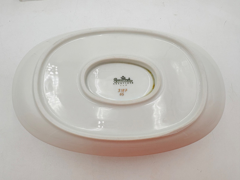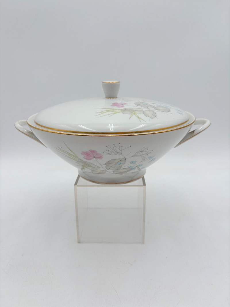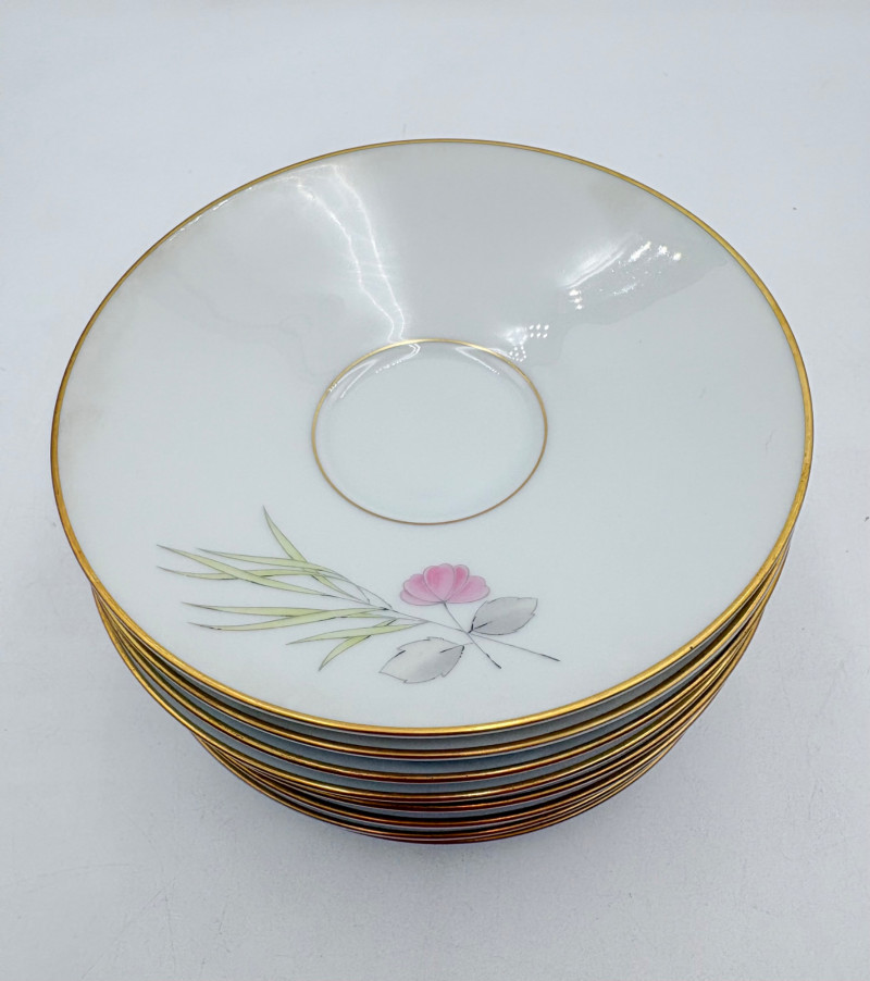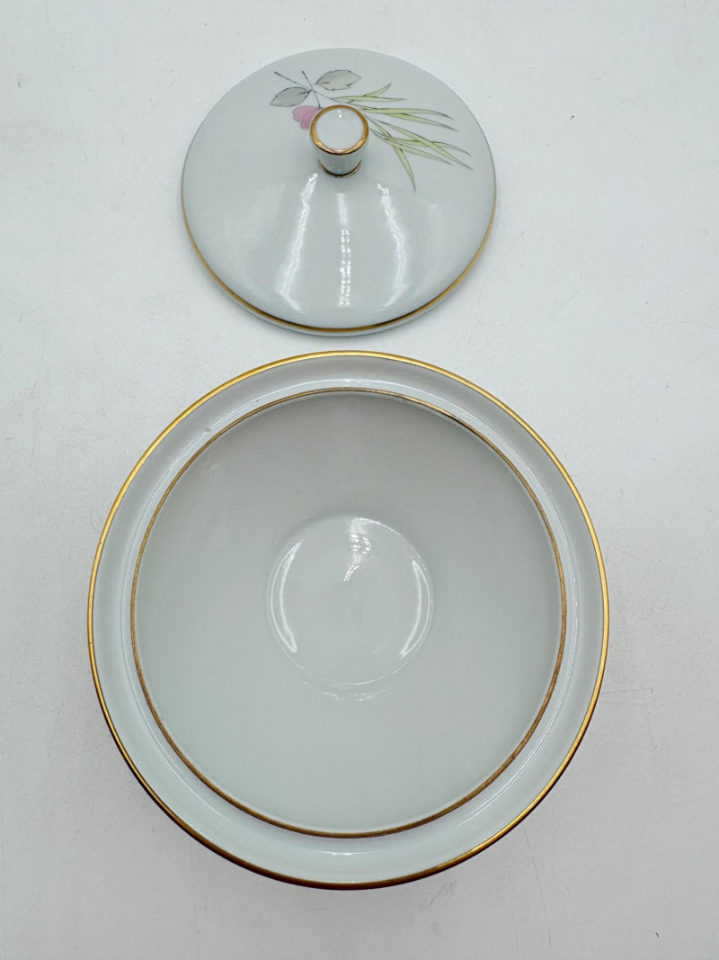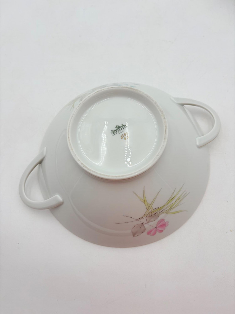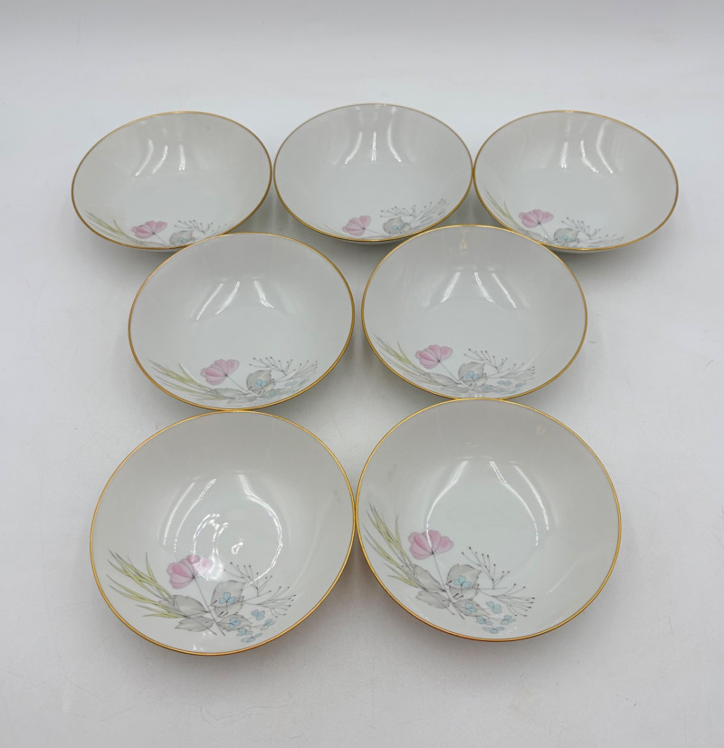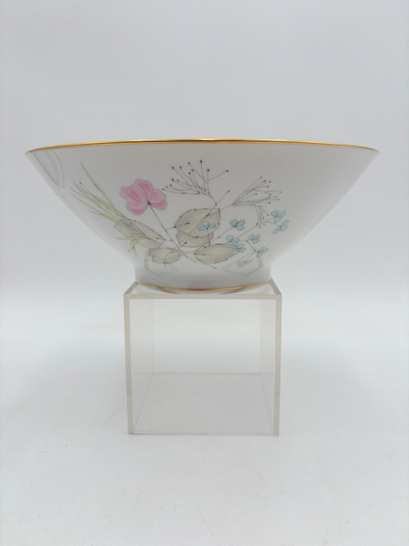 6 complete settings (plus more of some pieces) and servewear of German maker Rosenthal's "Bettina Parisian Spring" with gold trim. Clean white background with delicate floral motif in pale tones - adds interest to the otherwise plain plate without taking away the clean white background for wonderful food presentation. It appears to be very difficult to find complete settings of this particular design in the quantity we have. We believe these were produced in the early1960s given the color and style of the Rosenthal mark on the reverse. We did not note any chips or cracks while photographing. Lot includes: - 8 dinner plates (9.75" W) - 6 salad plates (7.75" W) - 8 bread plates (6.25" W) - 6 coupe cereal/soup bowls (8.75" W) - 7 dessert bowls (5" W) - 6 teacups (4" W) - 9 saucers (6" W) - gravy boat (3" H x 8" L) - round serving bowl (3.5" H x 9.75" W) - lidded serving bowl/casserole (4" H x 9" W) - lidded small bowl (possibly sugar? 5" W) BONUS - we found the large platter and another salad plate after lead photos were taken. The platter measures 15" L - see last photo. RARE! VTG ROSENTHAL BETTINA PARISIAN SPRING PATTERN 15" OVAL PLATTER / TRAY NEW | eBay this is a listing just for the platter!
