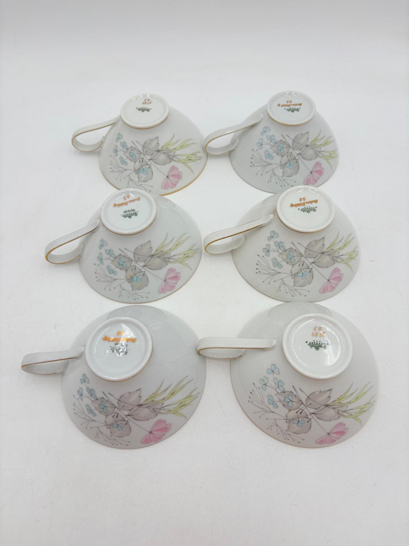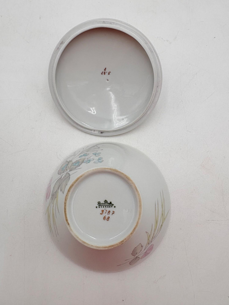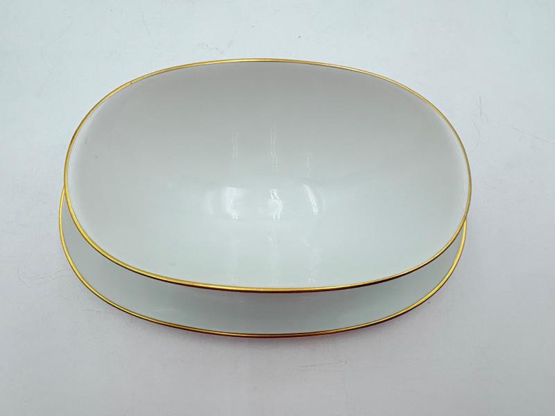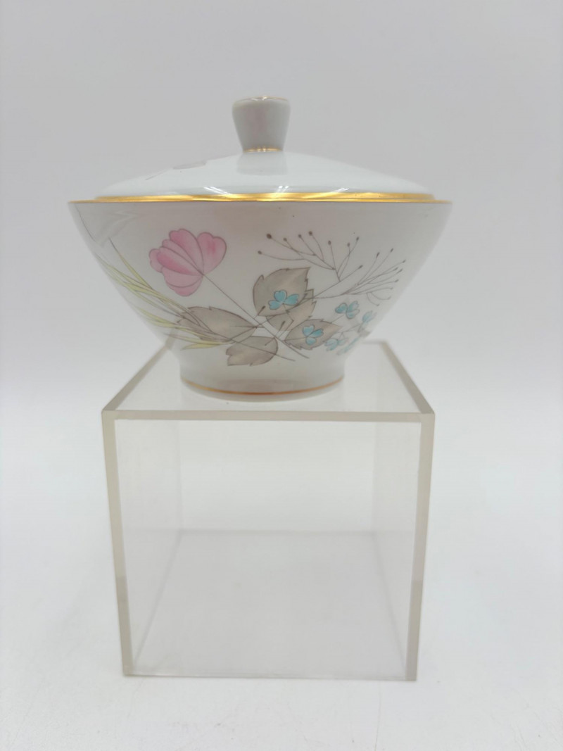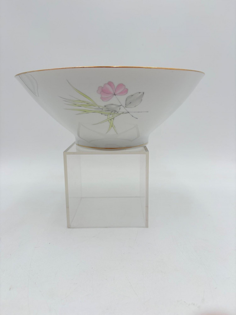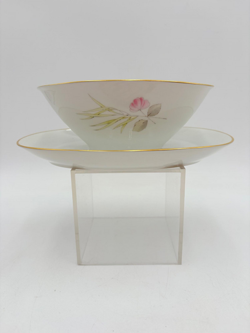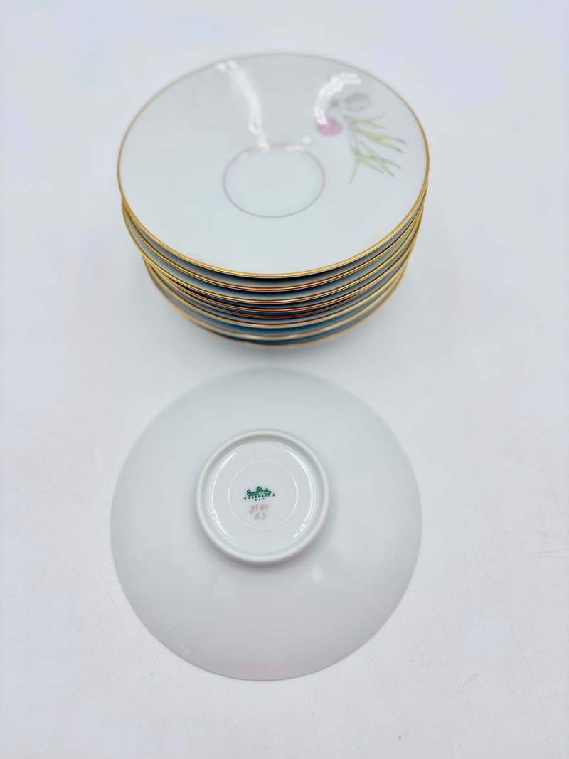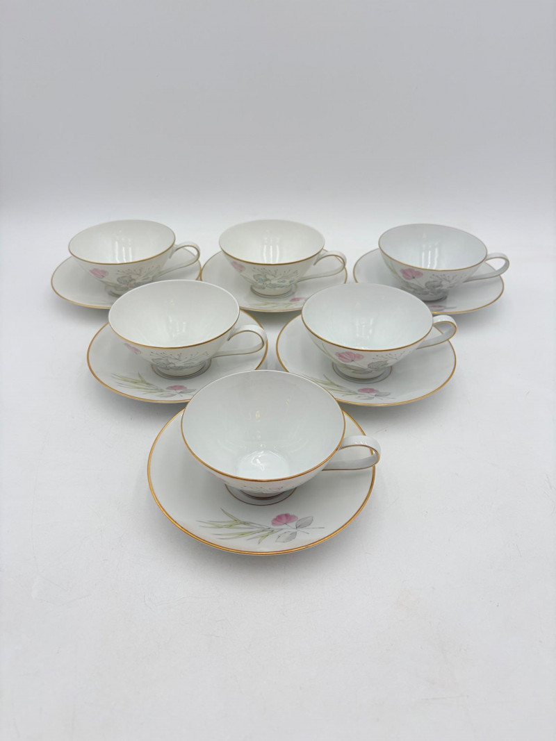 6 complete settings (plus more of some pieces) and servewear of German maker Rosenthal's "Bettina Parisian Spring" with gold trim. Clean white background with delicate floral motif in pale tones - adds interest to the otherwise plain plate without taking away the clean white background for wonderful food presentation. It appears to be very difficult to find complete settings of this particular design in the quantity we have. We believe these were produced in the early1960s given the color and style of the Rosenthal mark on the reverse. We did not note any chips or cracks while photographing. Lot includes: - 8 dinner plates (9.75" W) - 6 salad plates (7.75" W) - 8 bread plates (6.25" W) - 6 coupe cereal/soup bowls (8.75" W) - 7 dessert bowls (5" W) - 6 teacups (4" W) - 9 saucers (6" W) - gravy boat (3" H x 8" L) - round serving bowl (3.5" H x 9.75" W) - lidded serving bowl/casserole (4" H x 9" W) - lidded small bowl (possibly sugar? 5" W) BONUS - we found the large platter and another salad plate after lead photos were taken. The platter measures 15" L - see last photo. RARE! VTG ROSENTHAL BETTINA PARISIAN SPRING PATTERN 15" OVAL PLATTER / TRAY NEW | eBay this is a listing just for the platter!